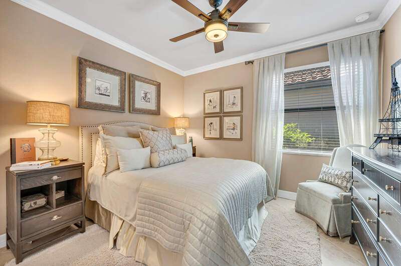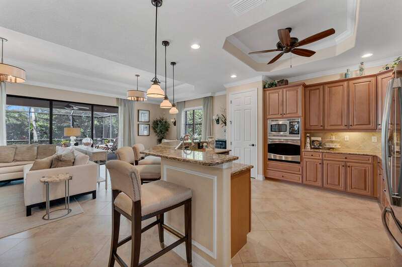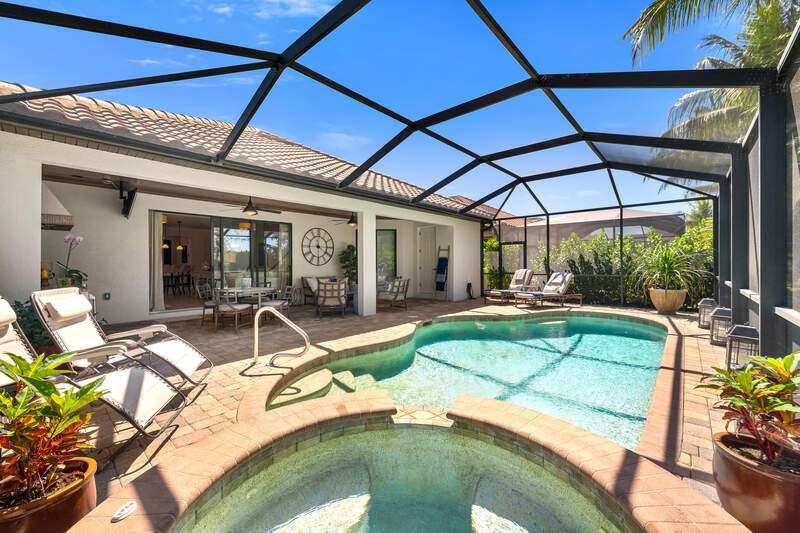 Fresh Price Drop! Lowest Priced Available Single Family Home with Golf Membership. Welcome to this exceptional Victoria model home built in 2014, located in the prestigious TPC Treviso Bay with DEEDED GOLF MEMBERSHIP & very close proximity to the Treviso Bay Club. This stunning 1,901 sq/ft residence features 2 bedrooms + Den and 2.5 bathrooms, offering both comfort and flexibility. With Western Exposure, you'll enjoy breathtaking sunsets from your luxurious outdoor retreat-perfect for entertaining. Inside, you'll find tray ceilings with crown molding throughout, granite countertops, stainless steel appliances, a wine fridge, and custom built-in cabinets in the great room and office area. The master bath features dual sinks, a separate tub, and a large walk-in shower. The expansive pool deck with a spa, outdoor kitchen with pool bath, and large palm landscaping package create an ideal setting for relaxation. Recent upgrades include a new AC and exterior paint in 2024. The garage is equipped with a mini split for added air conditioning, a built-in storage wall system, and epoxy-coated floors. Residents of Treviso Bay enjoy a wealth of amenities, including a 64,000 sq/ft luxurious main clubhouse, Villa Rilassare, resort-style lagoons, lap pools, a tennis center with pro shop, a fitness center, an aerobics and Pilates studio, and bocce ball courts. This home truly offers the perfect blend of luxury and comfort.