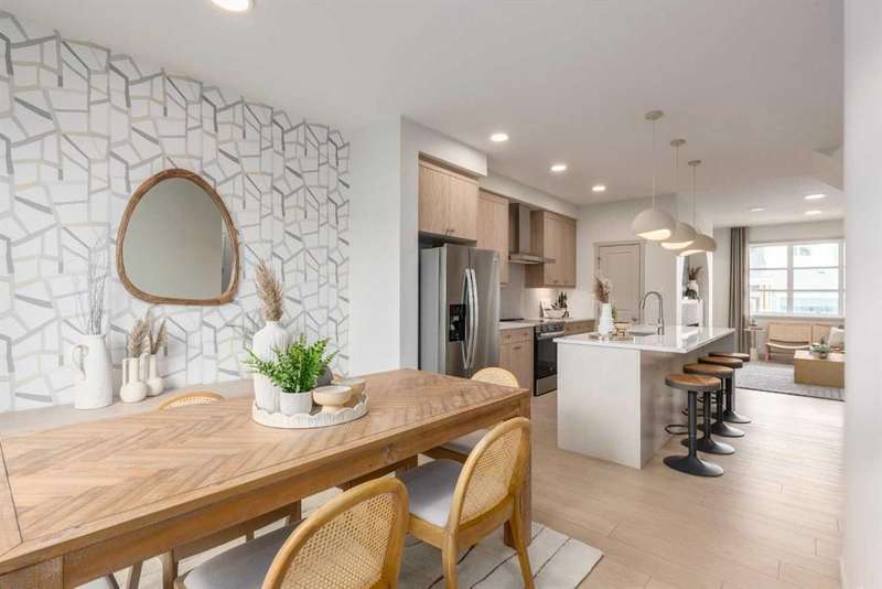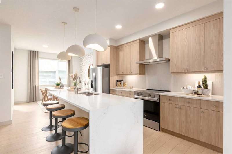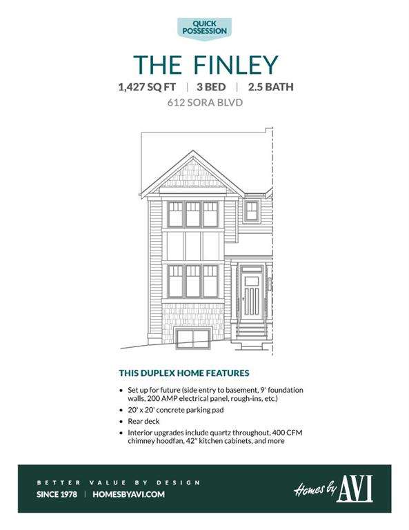 IT’S AMAZING HOW DIFFERENT A HOME FEELS WHEN YOU’RE NOT LOOKING AT SOMEONE ELSE’S GARAGE—this Finley in Sora gives you a FRONT-ROW VIEW OF THE POND instead. And behind that view? 1,427 square feet of bright, functional space built for both family life and future potential. Step inside and you’ll find 9’ CEILINGS on the main floor, open living and dining areas, and a kitchen that gets all the details right: 42” UPPER CABINETS, QUARTZ COUNTERTOPS, a CHIMNEY HOOD FAN, BUILT-IN MICROWAVE, UPGRADED SILGRANIT SINk, and a GAS LINE ROUGHED-IN if you’d rather cook on flame. Upstairs, three bedrooms and a convenient laundry room keep family life functional without sacrificing style, with quartz counters carried through every bathroom. But it’s what’s behind the walls and under the floorboards that really sets this property apart. Homes by Avi thought ahead with 9’ FOUNDATION WALLS, a SIDE ENTRY, and FULL BASEMENT ROUGH-INS for a bathroom, laundry, and wet bar or kitchenette. Add in an upgraded 80-GALLON HOT WATER TANK (finally, showers for everyone), a 200amp electrical panel, and you’ve got a home that’s as future-proof as it gets—whether you’re an investor eyeing a potential basement apartment, or a family that likes the idea of options down the road. Outside, the upgrades continue. A 10’ x 8’8” rear deck comes with a BBQ gas line already roughed-in, the front yard sod will soon be in place, and a 20’X20’ CONCRETE PARKING PAD out back is ready for vehicles now—or a garage later. In other words, move-in ready without the weekend trips to the hardware store. And then there’s the community. SORA IS ONE OF SOUTHEAST CALGARY’S MOST EXCITING NEW NEIGHBOURHOODS, designed around wide boulevards, wetlands, and connected pathways that make it easy to get outside. Schools, playgrounds, and shops are on the way, while QUICK ACCESS TO STONEY TRAIL puts the rest of the city within reach. For families, that means a fresh start in a neighbourhood built to grow with you. For investors, it means early entry into a community with momentum. Brand new, never lived in, and built with upgrades that actually matter—this is the kind of listing that doesn’t stick around. Book your showing and see why Sora is already on so many buyers’ radar. • PLEASE NOTE: Photos are of a finished Showhome of the same model – fit and finish may differ on finished spec home. Interior selections and floorplans shown in photos.