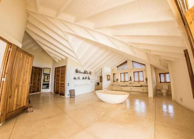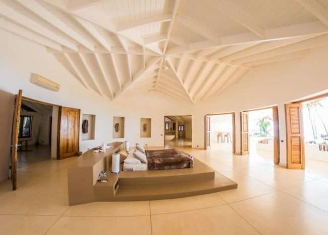 One of the three bedrooms upstairs is the master bedroom with its individual terrace overseeing the bay, a king-size bed, and a large bathroom. The two other bedrooms are similar in the back, with no sea view. They both have a king-size bed.