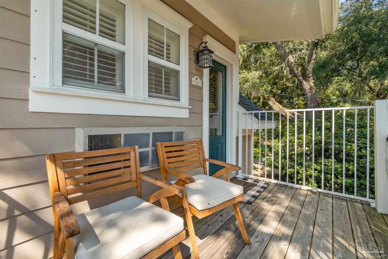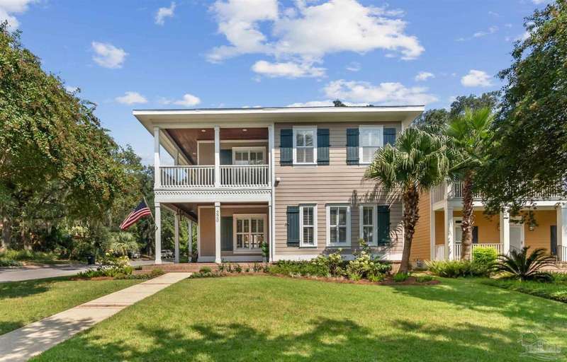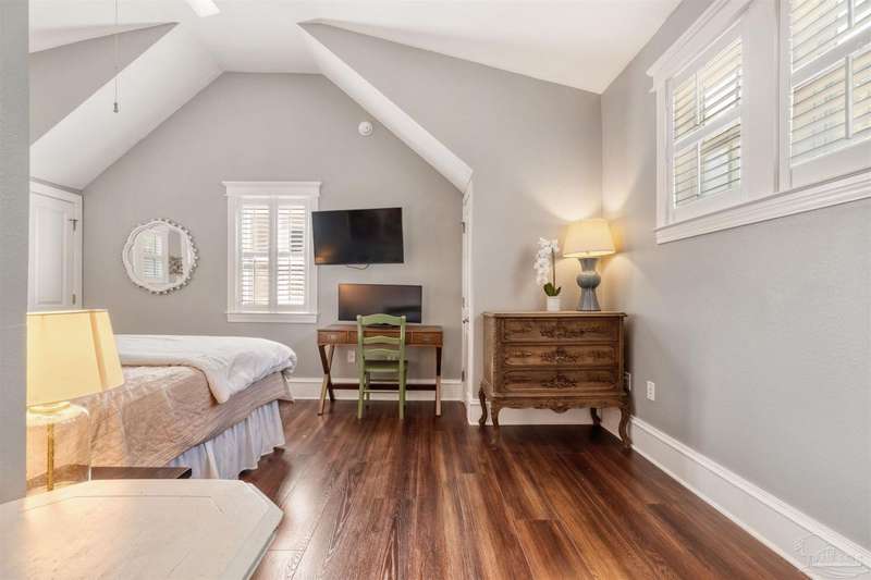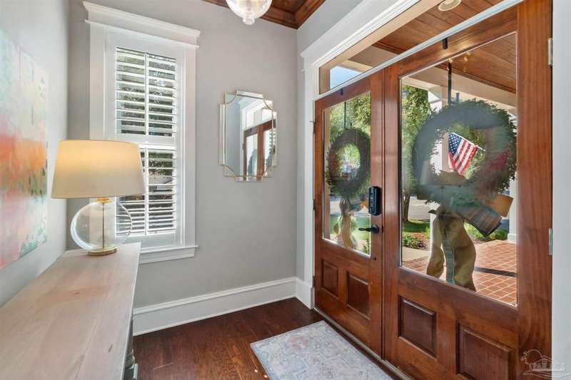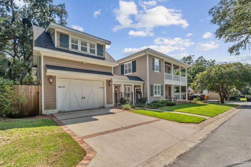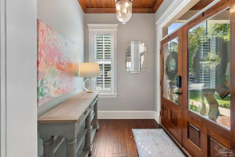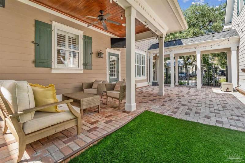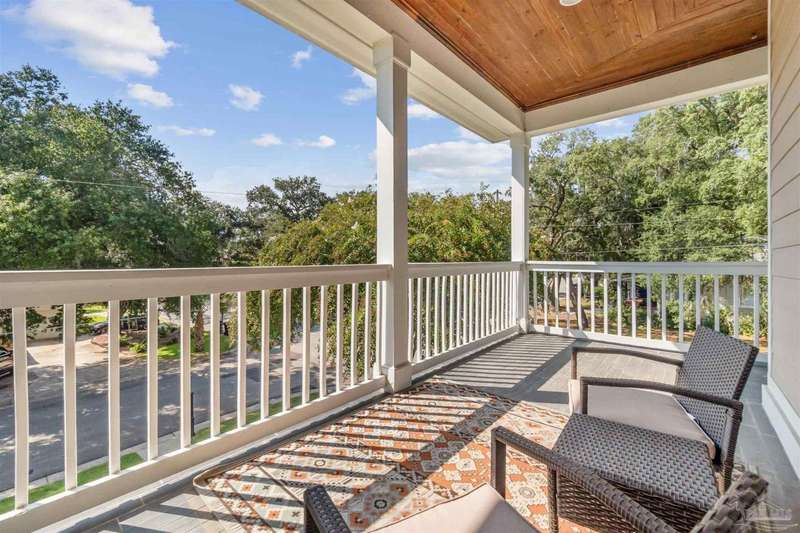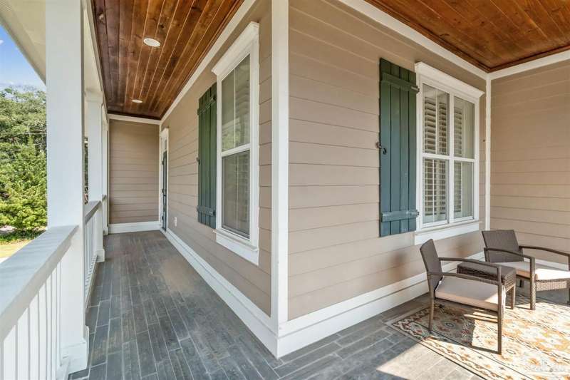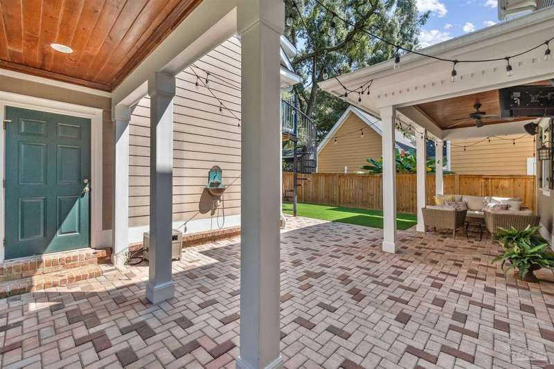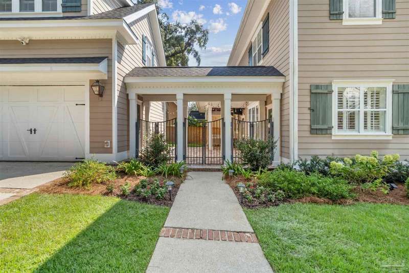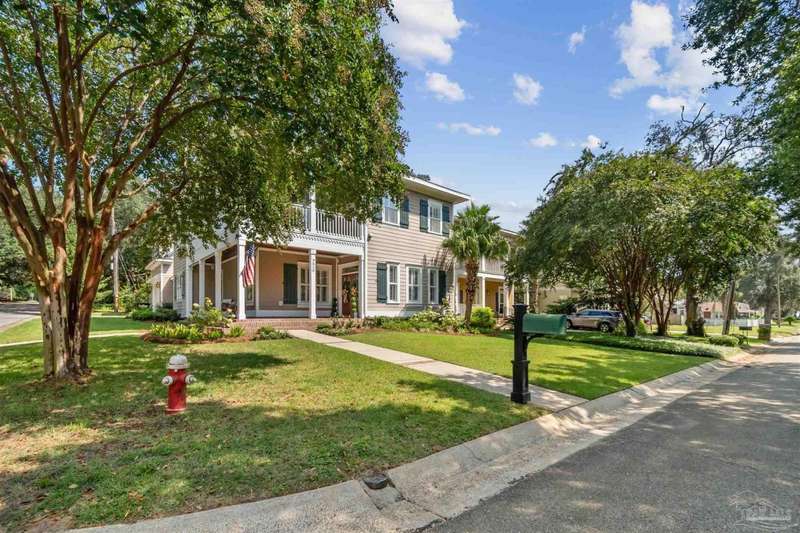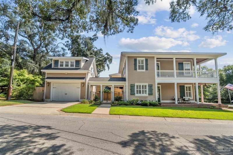 Enjoy the elegance, and convenience of East Pensacola Heights living in this exceptionally appointed 4-bedroom, 3-bathroom home with a detached 1-bedroom, 1-bathroom apartment. From the moment you arrive, the two-story facade framed by lush landscaping and gas lanterns sets the stage for the sophistication inside. The main home offers soaring ceilings with crown molding and recessed lighting, engineered hardwood floors, LVP and plantation shutters throughout. The gourmet kitchen features honed black granite countertops, a 36' professional gas stove with cast iron griddle, custom hood, and brand-new LG Smart refrigerator and dishwasher (2024). A walk-in pantry with wood shelving, wet bar with wine refrigerator, and custom cabinetry provide exceptional storage and functionality. The open living area is ideal for entertaining, with a full guest suite and bath on the main level, along with a mudroom, custom desk/office space, and built-in lockers. Upstairs, the spacious master suite offers a spa-like bathroom with an oversized cast iron soaking tub, tiled walk-in shower, and a custom-built closet. Two additional bedrooms, a full bathroom, an upstairs laundry room and multiple linen closets complete the second floor. Outdoor living includes expansive wraparound porches upstairs and down with beautiful tongue and groove ceilings-plus a brick-paver courtyard, irrigation system on a separate meter, outdoor hot water shower, and private entertaining spaces. The detached apartment above the garage has been fully updated with a new deck, exterior elevator, plantation shutters, on-demand water heater, and lighting, making it perfect for guests or as a short-/long-term rental. Additional upgrades include a new roof (2020), tankless Rinnai hot water heater (2024), Cat 5 wiring, hurricane fabric/vinyl shields for all windows and doors. Buyer to verify all measurements and information.