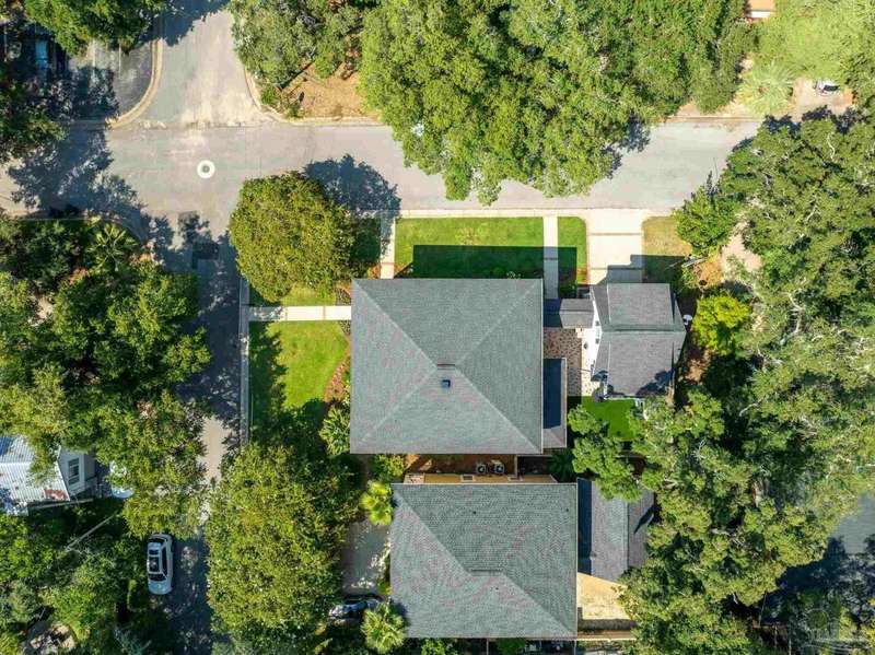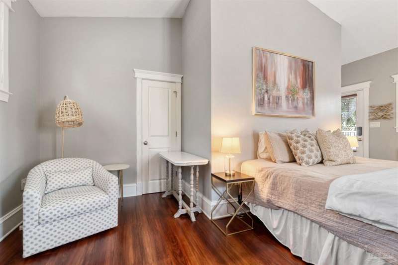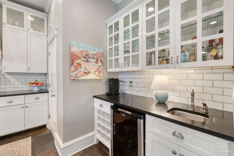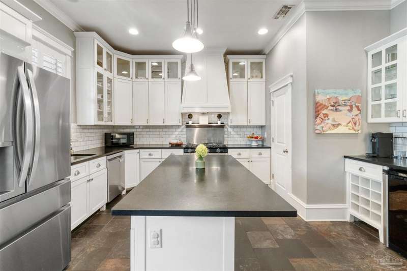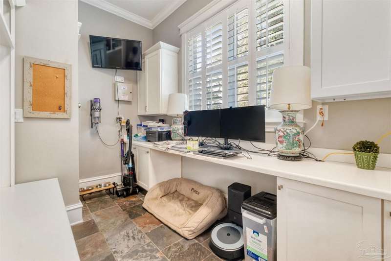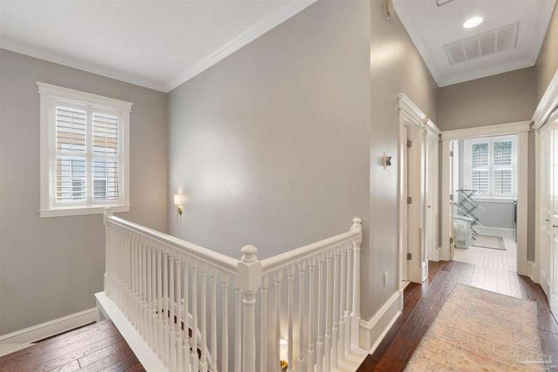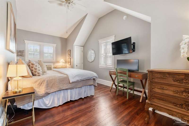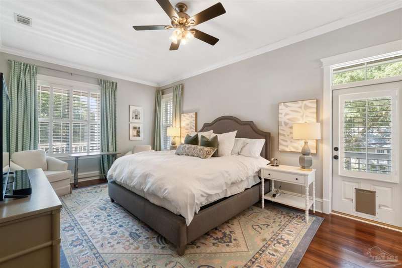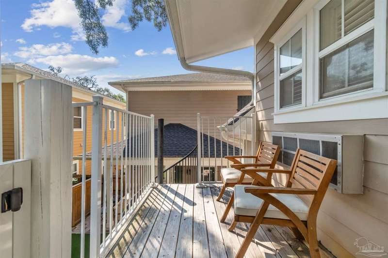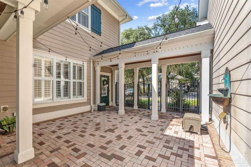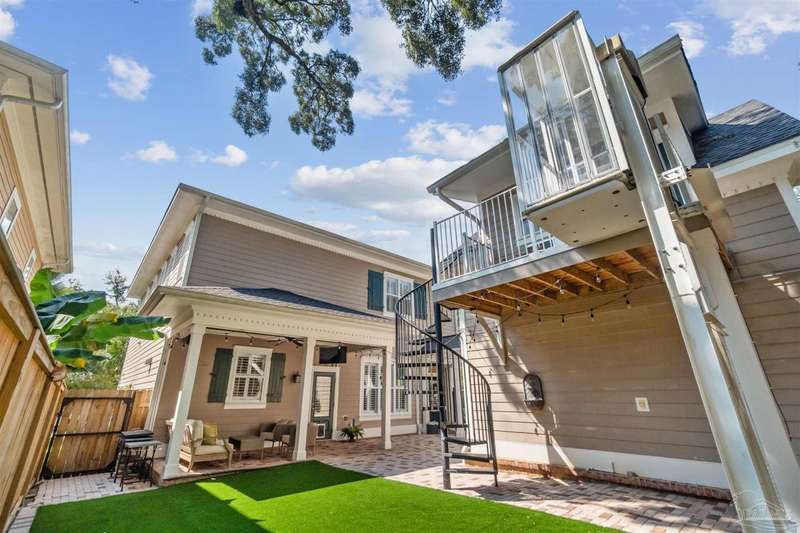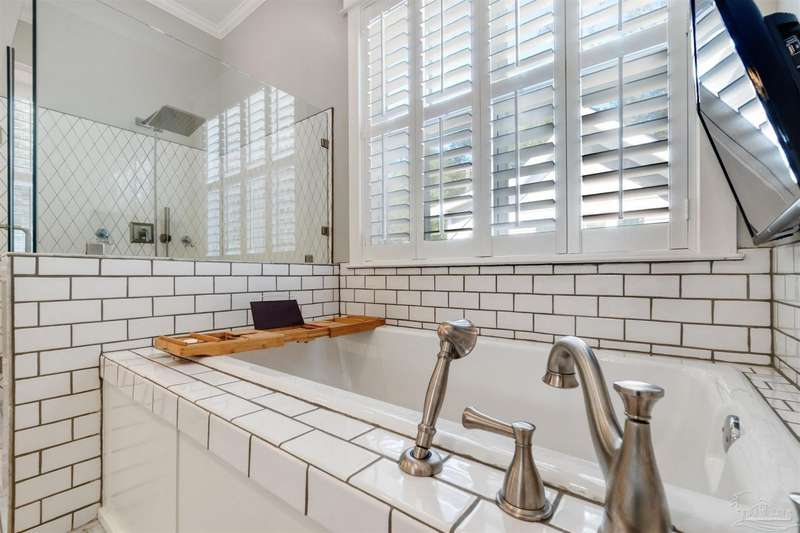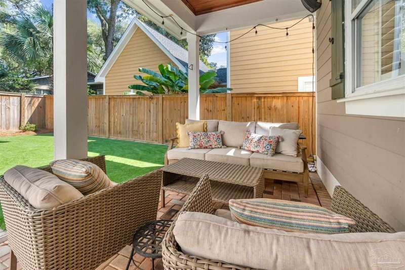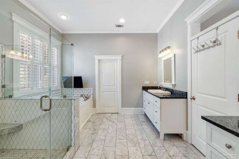 Enjoy the elegance, and convenience of East Pensacola Heights living in this exceptionally appointed 4-bedroom, 3-bathroom home with a detached 1-bedroom, 1-bathroom apartment. From the moment you arrive, the two-story facade framed by lush landscaping and gas lanterns sets the stage for the sophistication inside. The main home offers soaring ceilings with crown molding and recessed lighting, engineered hardwood floors, LVP and plantation shutters throughout. The gourmet kitchen features honed black granite countertops, a 36' professional gas stove with cast iron griddle, custom hood, and brand-new LG Smart refrigerator and dishwasher (2024). A walk-in pantry with wood shelving, wet bar with wine refrigerator, and custom cabinetry provide exceptional storage and functionality. The open living area is ideal for entertaining, with a full guest suite and bath on the main level, along with a mudroom, custom desk/office space, and built-in lockers. Upstairs, the spacious master suite offers a spa-like bathroom with an oversized cast iron soaking tub, tiled walk-in shower, and a custom-built closet. Two additional bedrooms, a full bathroom, an upstairs laundry room and multiple linen closets complete the second floor. Outdoor living includes expansive wraparound porches upstairs and down with beautiful tongue and groove ceilings-plus a brick-paver courtyard, irrigation system on a separate meter, outdoor hot water shower, and private entertaining spaces. The detached apartment above the garage has been fully updated with a new deck, exterior elevator, plantation shutters, on-demand water heater, and lighting, making it perfect for guests or as a short-/long-term rental. Additional upgrades include a new roof (2020), tankless Rinnai hot water heater (2024), Cat 5 wiring, hurricane fabric/vinyl shields for all windows and doors. Buyer to verify all measurements and information.