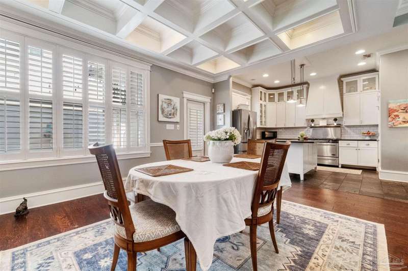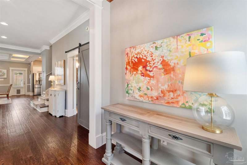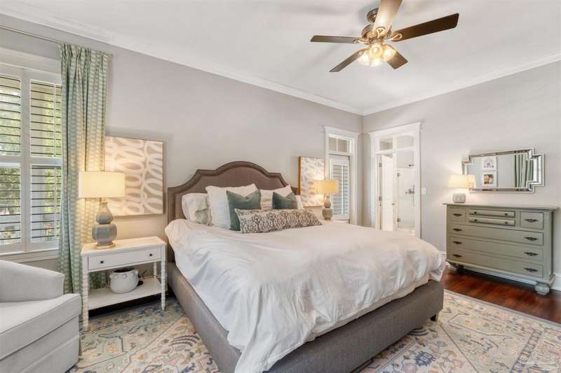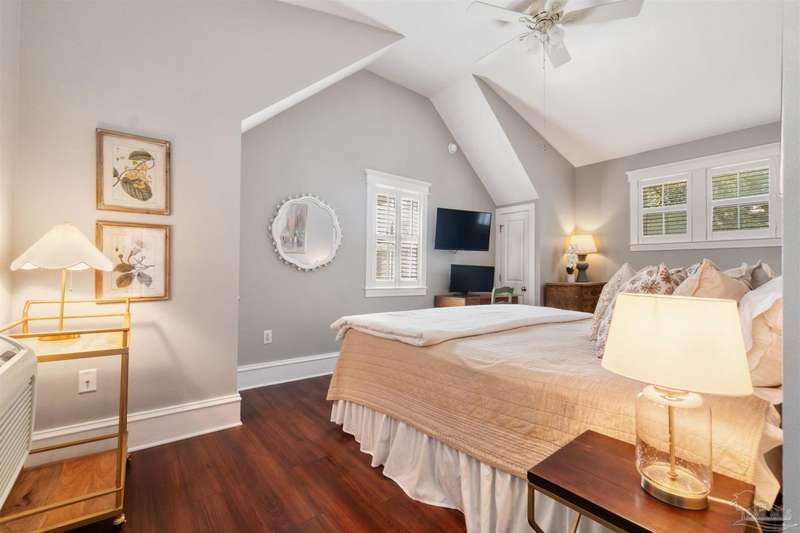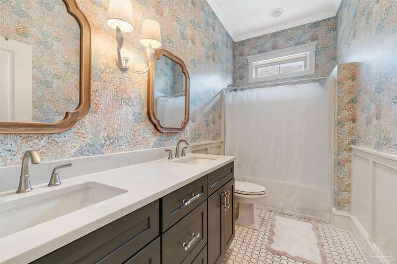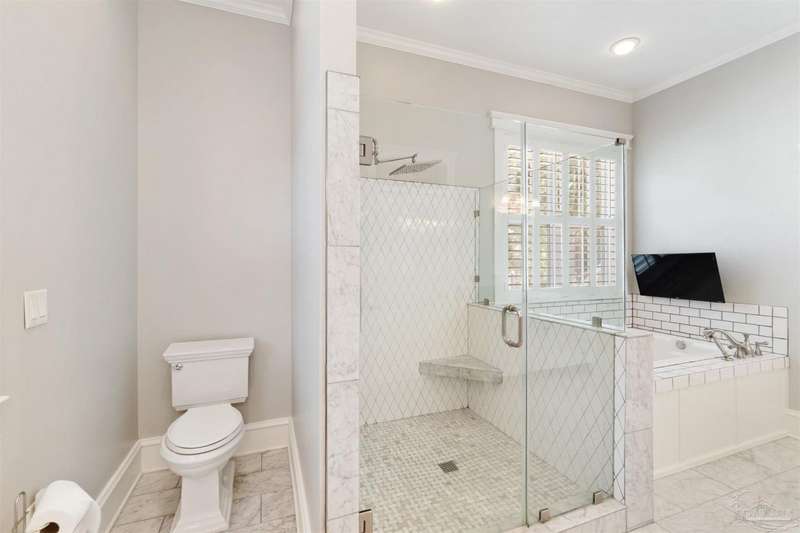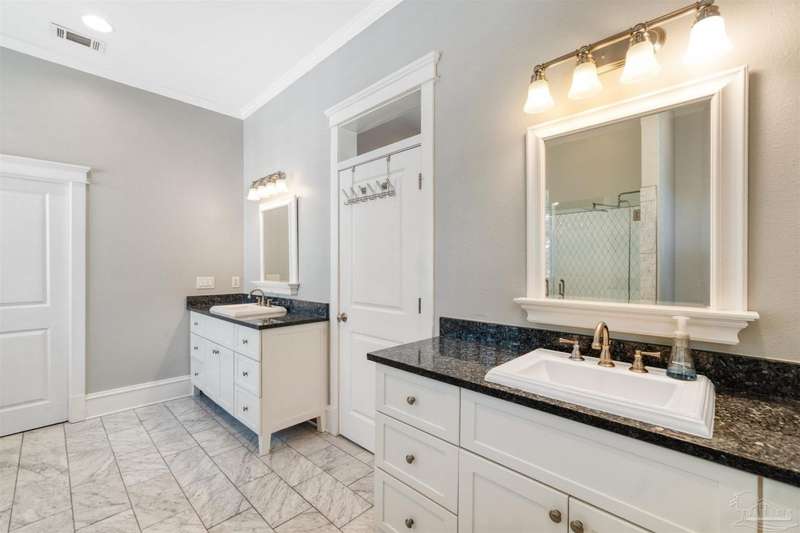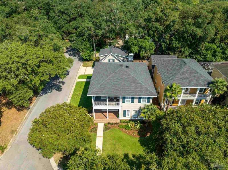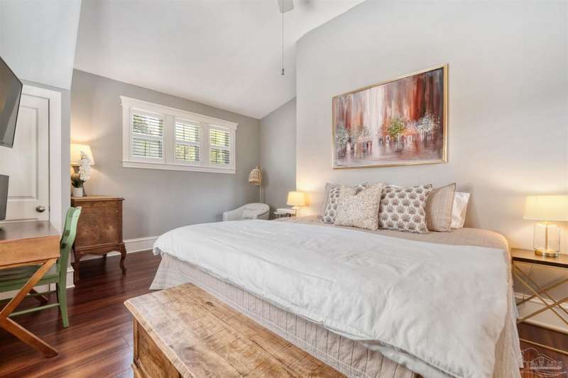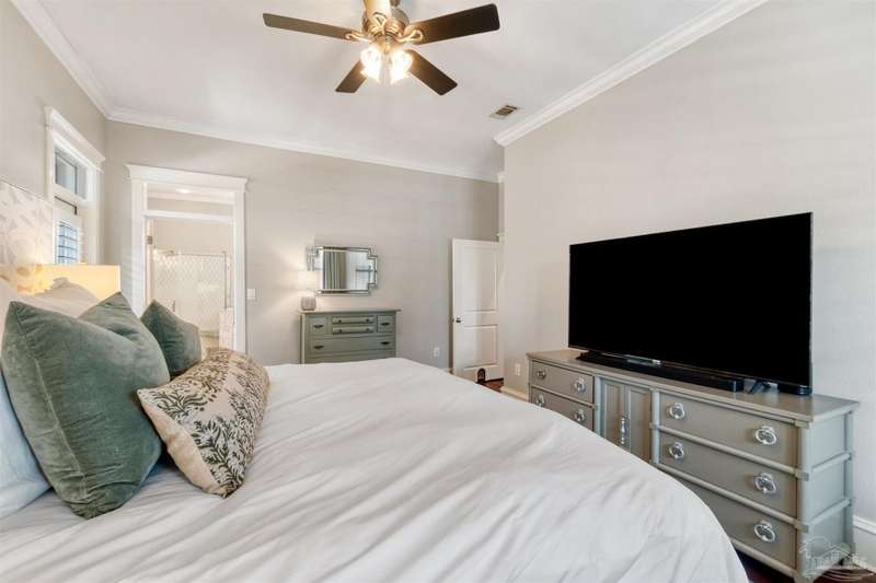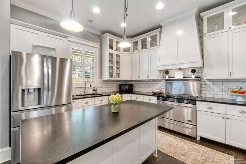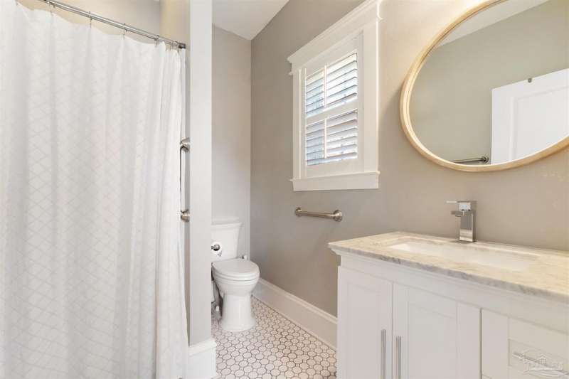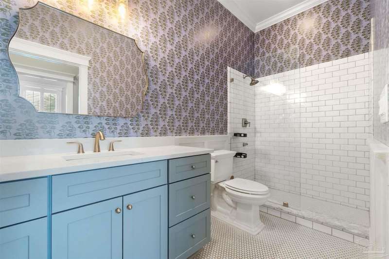 Enjoy the elegance, and convenience of East Pensacola Heights living in this exceptionally appointed 4-bedroom, 3-bathroom home with a detached 1-bedroom, 1-bathroom apartment. From the moment you arrive, the two-story facade framed by lush landscaping and gas lanterns sets the stage for the sophistication inside. The main home offers soaring ceilings with crown molding and recessed lighting, engineered hardwood floors, LVP and plantation shutters throughout. The gourmet kitchen features honed black granite countertops, a 36' professional gas stove with cast iron griddle, custom hood, and brand-new LG Smart refrigerator and dishwasher (2024). A walk-in pantry with wood shelving, wet bar with wine refrigerator, and custom cabinetry provide exceptional storage and functionality. The open living area is ideal for entertaining, with a full guest suite and bath on the main level, along with a mudroom, custom desk/office space, and built-in lockers. Upstairs, the spacious master suite offers a spa-like bathroom with an oversized cast iron soaking tub, tiled walk-in shower, and a custom-built closet. Two additional bedrooms, a full bathroom, an upstairs laundry room and multiple linen closets complete the second floor. Outdoor living includes expansive wraparound porches upstairs and down with beautiful tongue and groove ceilings-plus a brick-paver courtyard, irrigation system on a separate meter, outdoor hot water shower, and private entertaining spaces. The detached apartment above the garage has been fully updated with a new deck, exterior elevator, plantation shutters, on-demand water heater, and lighting, making it perfect for guests or as a short-/long-term rental. Additional upgrades include a new roof (2020), tankless Rinnai hot water heater (2024), Cat 5 wiring, hurricane fabric/vinyl shields for all windows and doors. Buyer to verify all measurements and information.