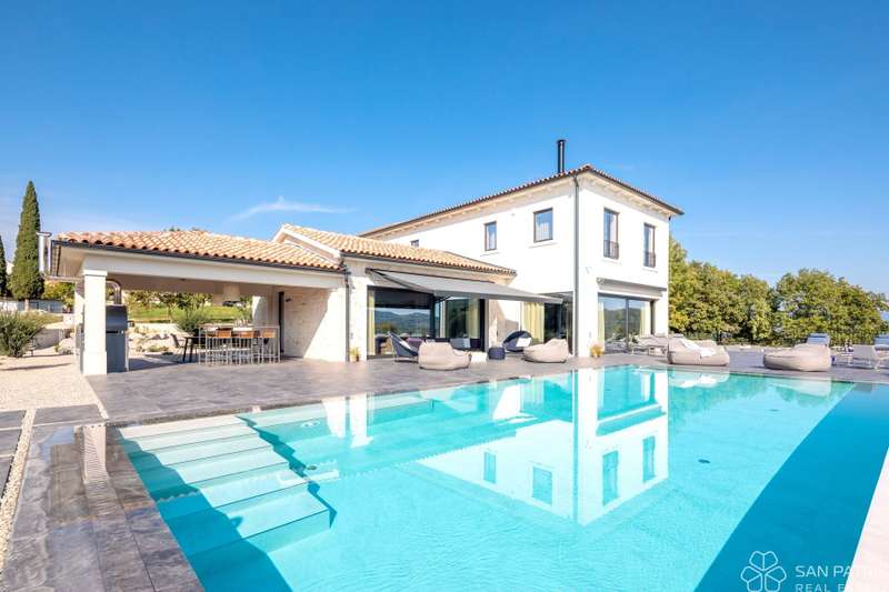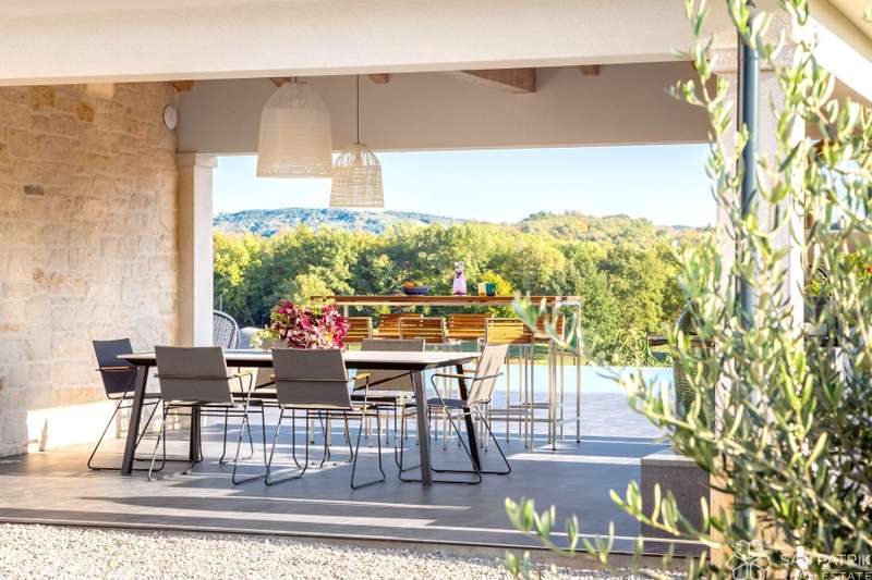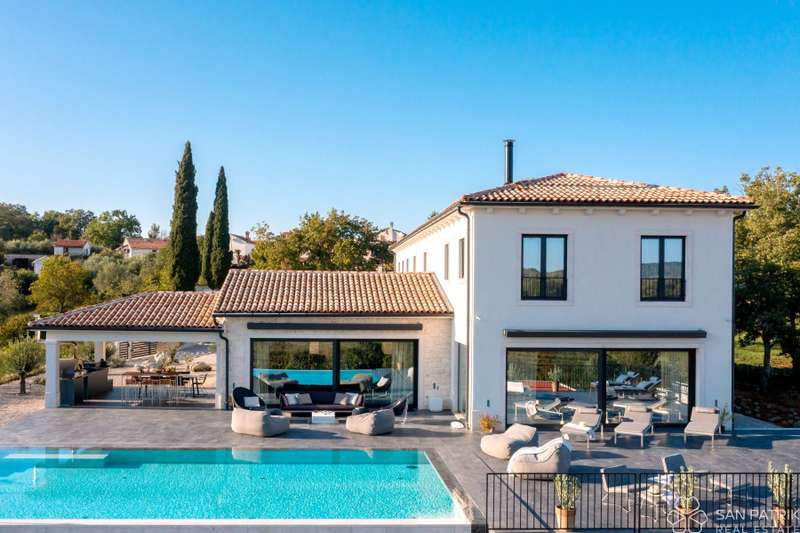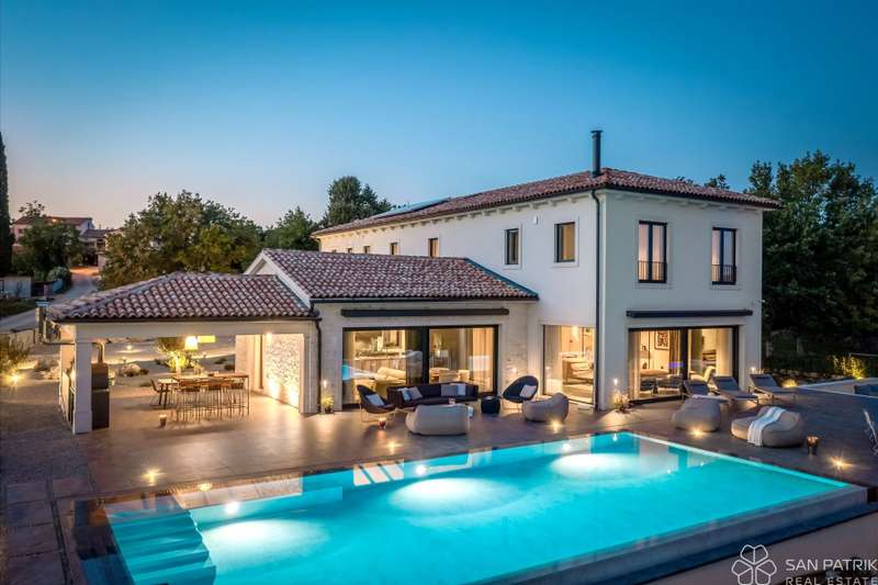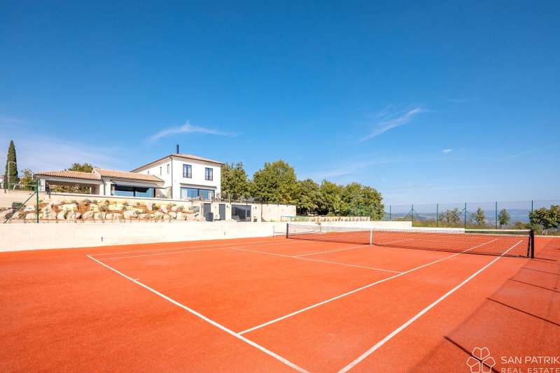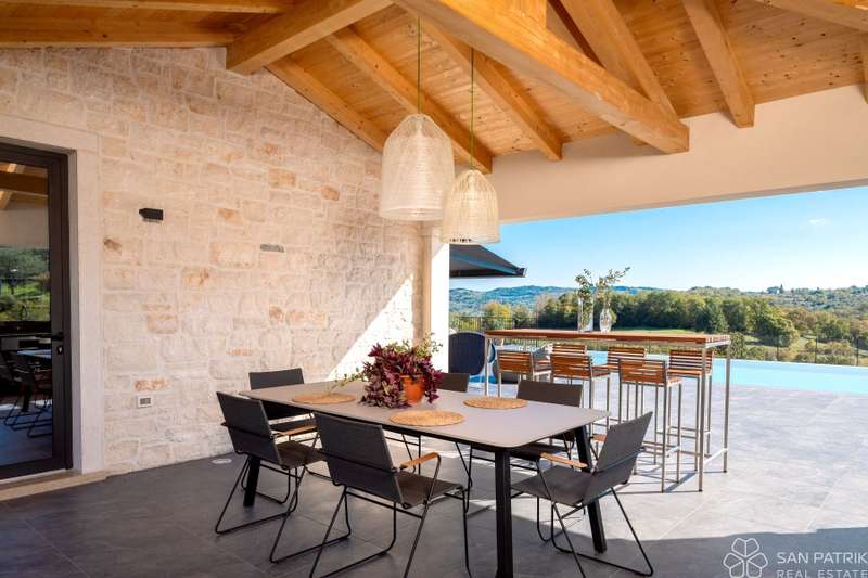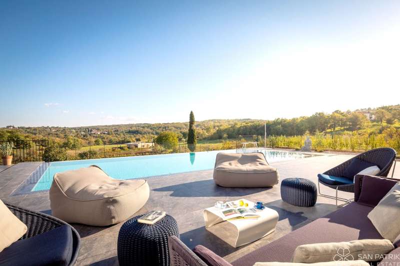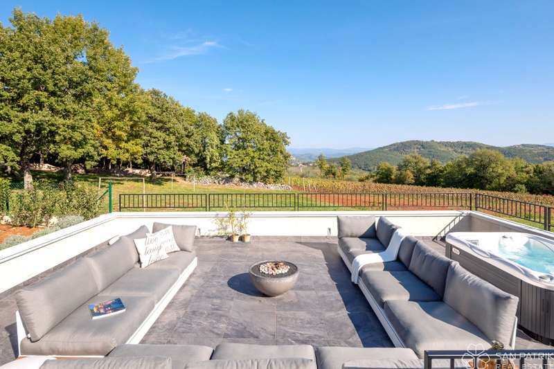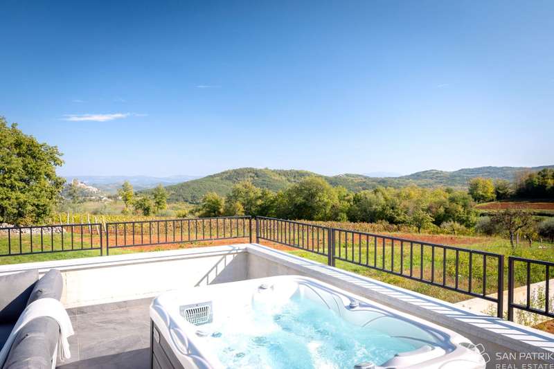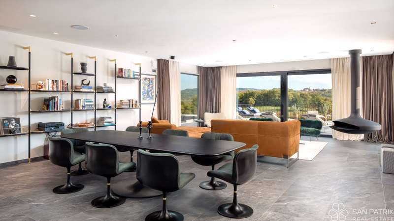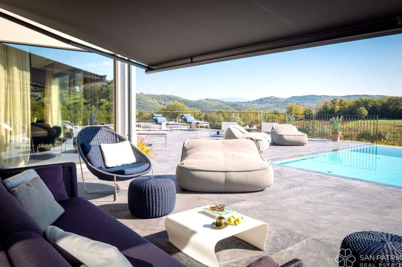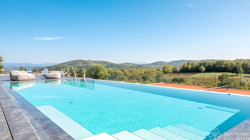 Perched on an idyllic hill above Motovun lies an exclusive designer villa that combines traditional Istrian charm with contemporary luxury. With a total of 435 m2 of living space on a 2,700 m2 plot, this impressive property offers complete privacy, tranquility, and a spectacular view of one of the most beautiful Istrian towns.