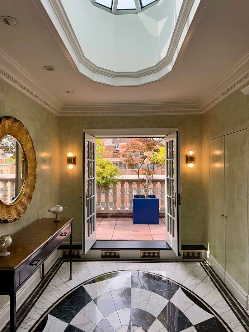 As you enter from the direct access elevator, the foyer sets the tone: spacious yet welcoming, formally laid out yet intimate in feel, and featuring a rare oval skylight made possible only by the nearly complete rebuild of the building envelope.
