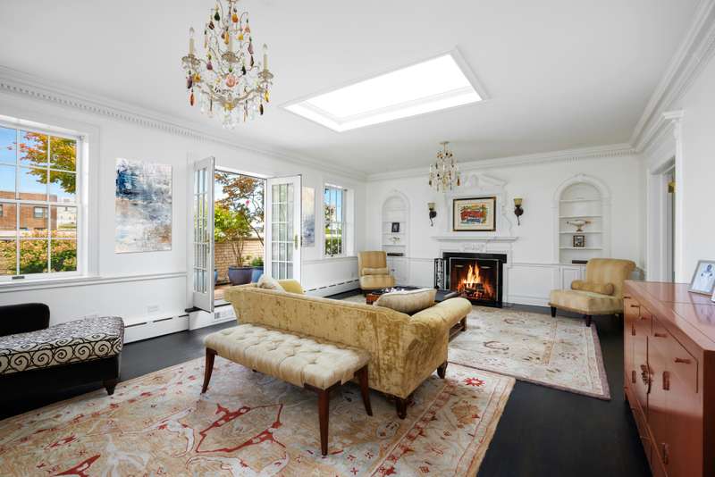 The oversized living room, the heart of the home, is anchored by a wood-burning fireplace and the second dramatic skylight. French doors open to the terrace, while a custom wet bar with a Sub-Zero wine cooler stands ready for quiet nights, celebratory toasts, and holiday parties.