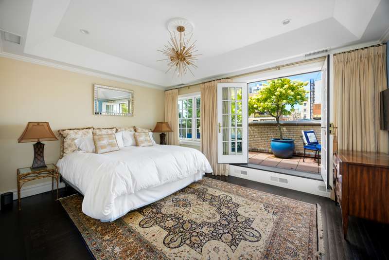 A skylit hallway (skylight five) leads to the private wing, where two spacious bedroom suites each open directly to the terrace. The primary suite is a true retreat with French doors, abundant closet space, and a luxurious onyx-clad bathroom beneath yet another skylight (number six). The bathroom features radiant heated floors, a soaking tub, and a high-pressure rain shower. The second bedroom has its own marble en-suite bath, private terrace access, and a discreetly tucked-away washer/dryer with exterior venting.