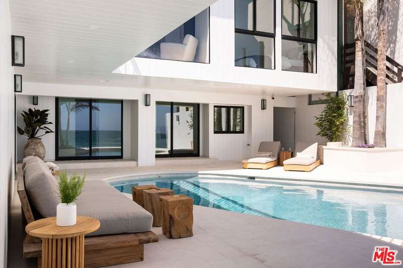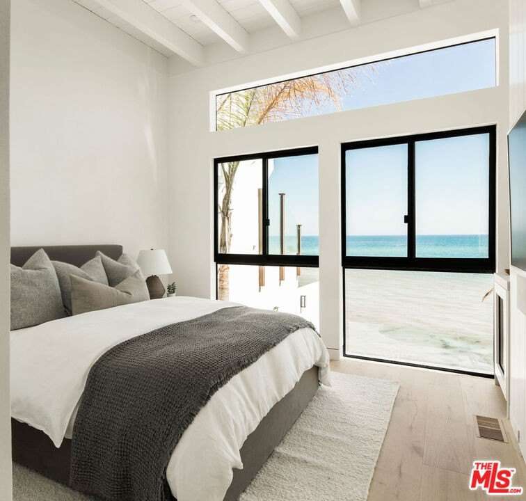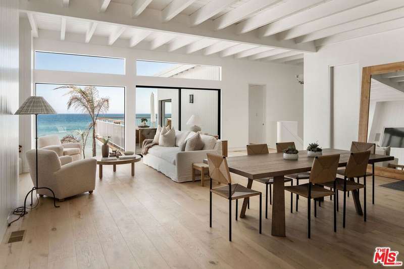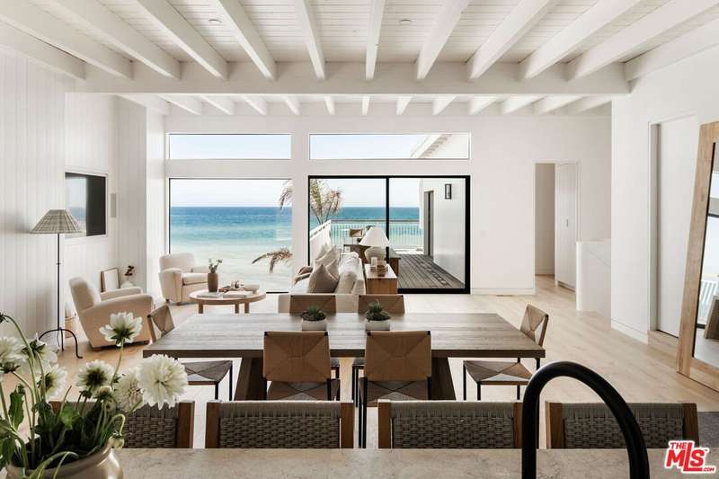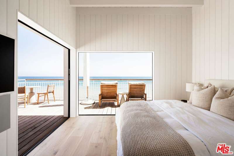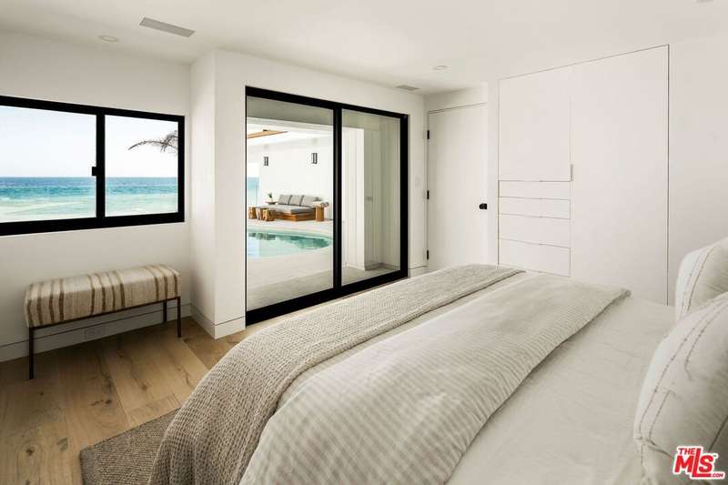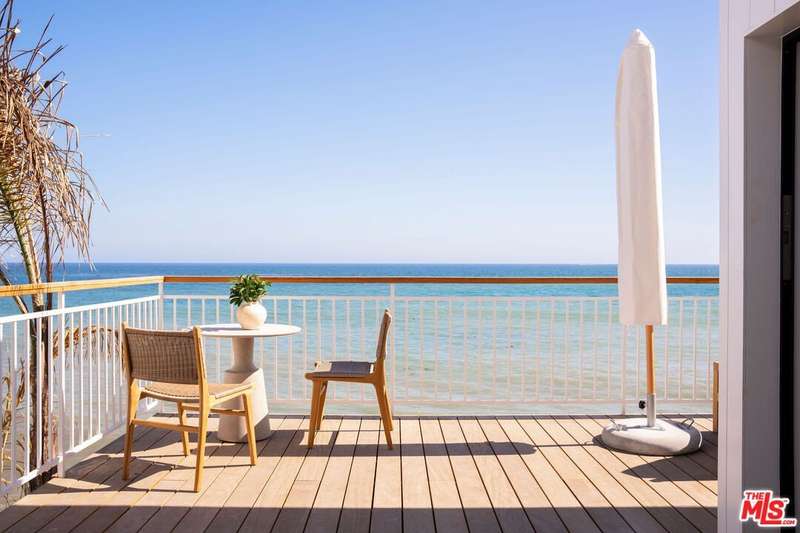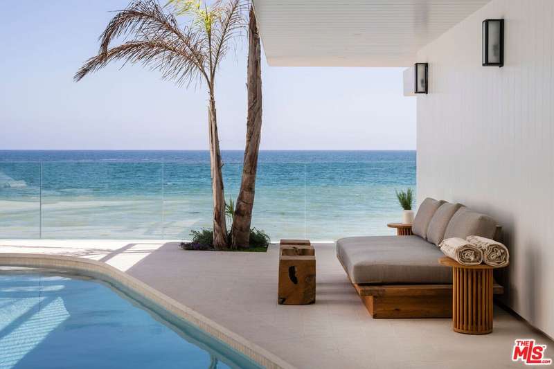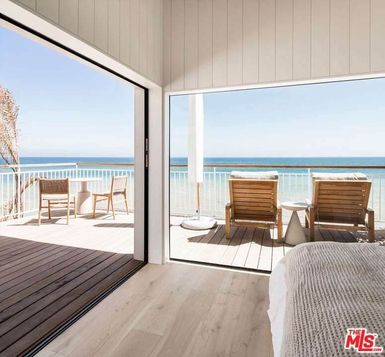 Situated off of PCH on the Private Escondido Beach Road, sits this Mid-Century gem on 50 feet of the exclusive and coveted Escondido Beach. Embrace the opportunity to own this special property that has been extensively and meticulously reimagined by design team Warren Garrett. The newly completed home elegantly blends timeless materials with modern amenities and exudes a restrained sophistication. The turnkey beachfront residence offers 4 bedrooms, 4.5 baths, two levels of expansive waterfront decks and features a gorgeous french grey plaster pool that takes center stage only a few steps from the sand. This idyllic beach house is conveniently located steps away from the iconic Geoffrey's restaurant and a leisurely beachside stroll to Paradise Cove Beach Cafe. Located near the end of a private street, the peaceful retreat enjoys ample separation from Pacific Coast Highway. The clean design of the modest exterior facade is centered by an arched solid steel front door opening to panoramic ocean views framed with white oak floors and soaring exposed beam ceilings. An open gourmet kitchen showcases a grand Italian limestone island, exquisite stone shelving, a La Cornue range and new high end appliances. The main level features 3 bedrooms with spa-like en-suite bathrooms, while the lower level offers a 4th bedroom and full bathroom with breathtaking views of the pool and ocean beyond. A secondary bar and kitchen as well as a cozy interior lounge were designed to make this the perfect setting for pool and beachside entertaining. The home may be sold furnished and is move-in ready with brand new furnishings from Jenni Kayne Home, experience the best of coastal living in this unique Malibu beachfront paradise.