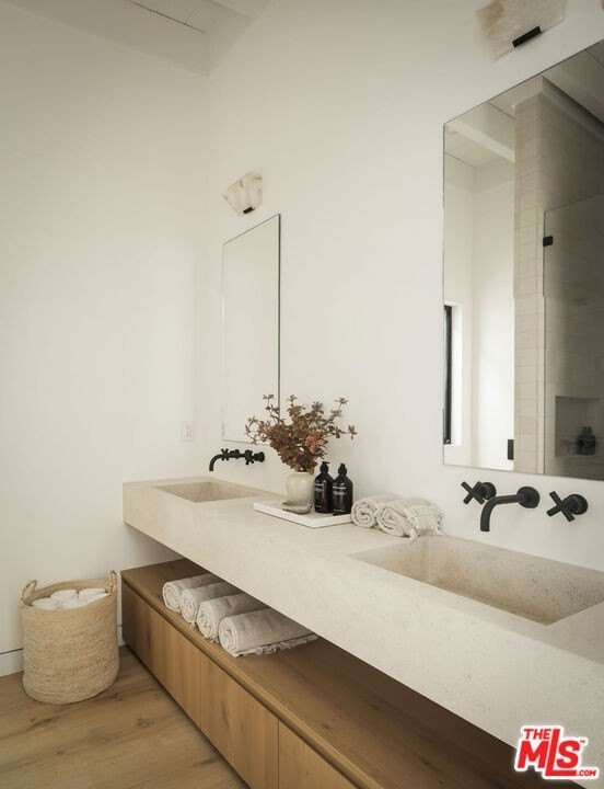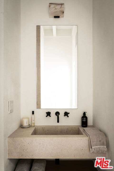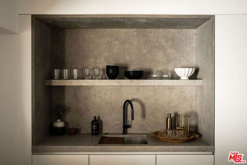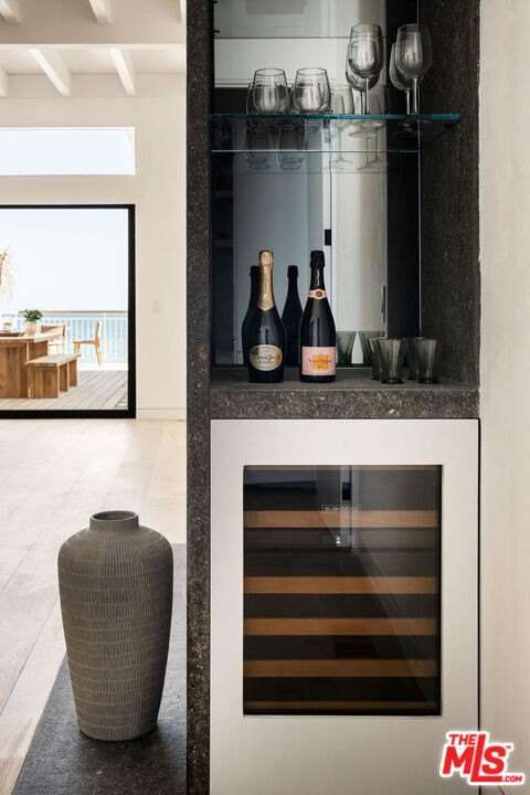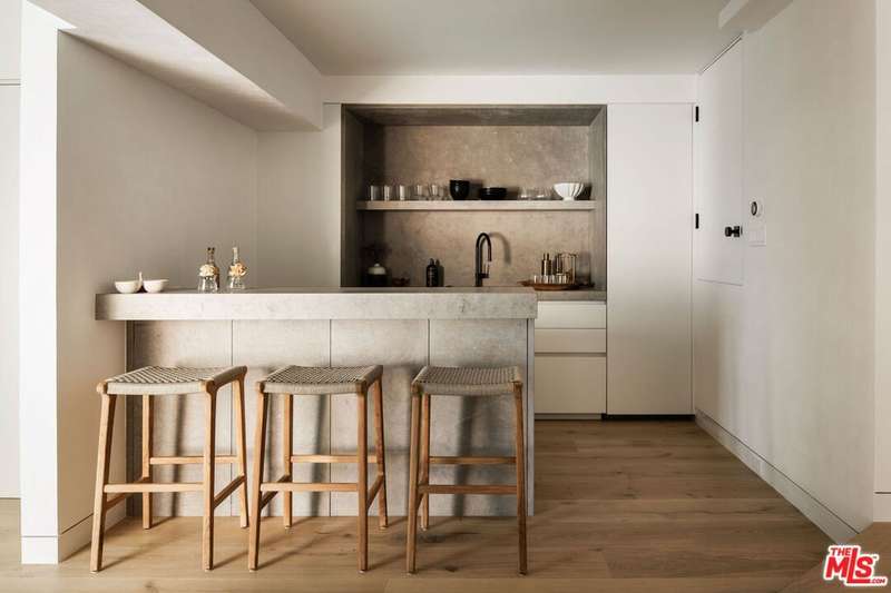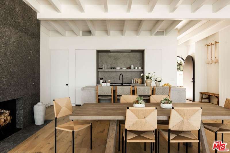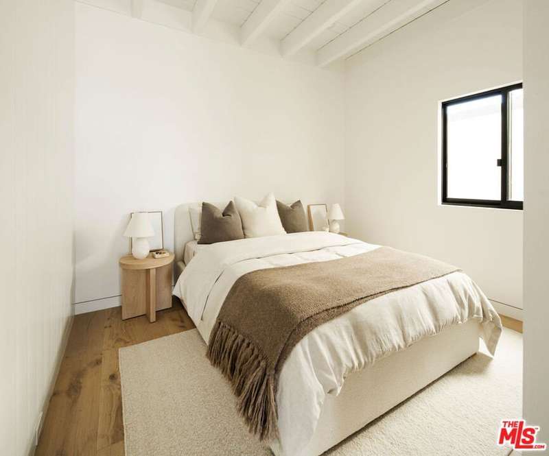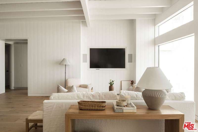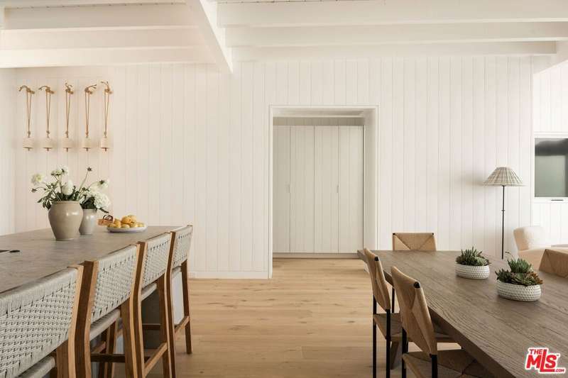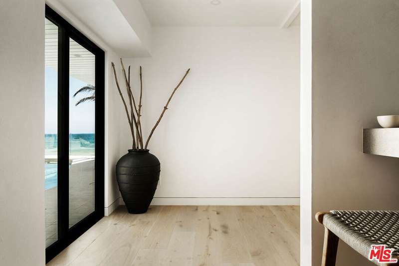 Situated off of PCH on the Private Escondido Beach Road, sits this Mid-Century gem on 50 feet of the exclusive and coveted Escondido Beach. Embrace the opportunity to own this special property that has been extensively and meticulously reimagined by design team Warren Garrett. The newly completed home elegantly blends timeless materials with modern amenities and exudes a restrained sophistication. The turnkey beachfront residence offers 4 bedrooms, 4.5 baths, two levels of expansive waterfront decks and features a gorgeous french grey plaster pool that takes center stage only a few steps from the sand. This idyllic beach house is conveniently located steps away from the iconic Geoffrey's restaurant and a leisurely beachside stroll to Paradise Cove Beach Cafe. Located near the end of a private street, the peaceful retreat enjoys ample separation from Pacific Coast Highway. The clean design of the modest exterior facade is centered by an arched solid steel front door opening to panoramic ocean views framed with white oak floors and soaring exposed beam ceilings. An open gourmet kitchen showcases a grand Italian limestone island, exquisite stone shelving, a La Cornue range and new high end appliances. The main level features 3 bedrooms with spa-like en-suite bathrooms, while the lower level offers a 4th bedroom and full bathroom with breathtaking views of the pool and ocean beyond. A secondary bar and kitchen as well as a cozy interior lounge were designed to make this the perfect setting for pool and beachside entertaining. The home may be sold furnished and is move-in ready with brand new furnishings from Jenni Kayne Home, experience the best of coastal living in this unique Malibu beachfront paradise.