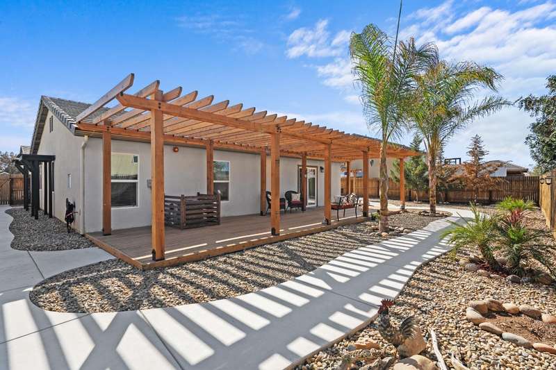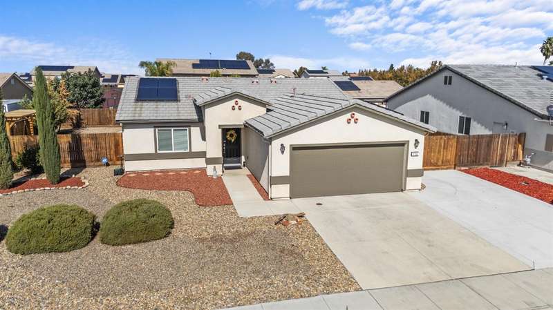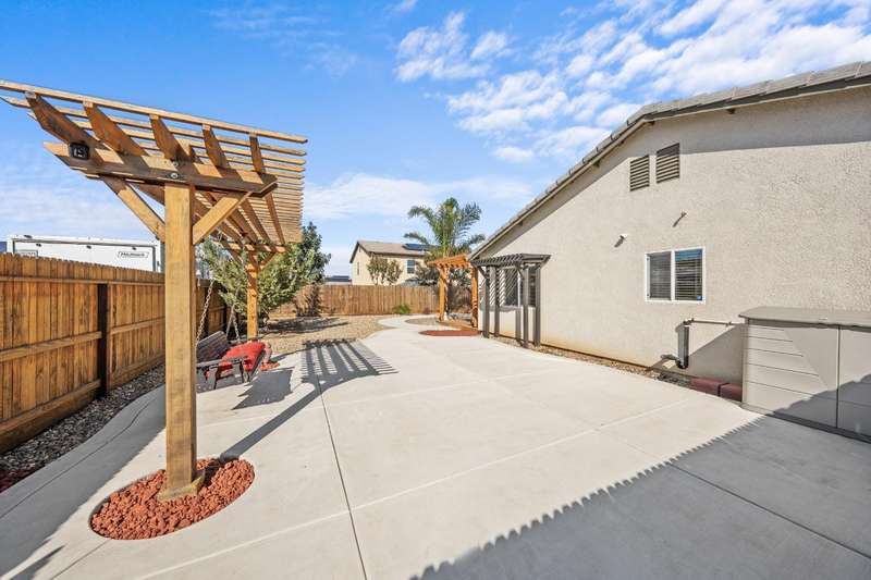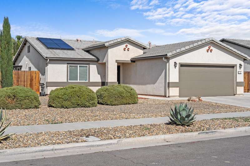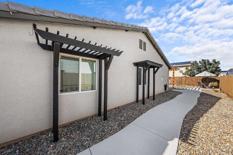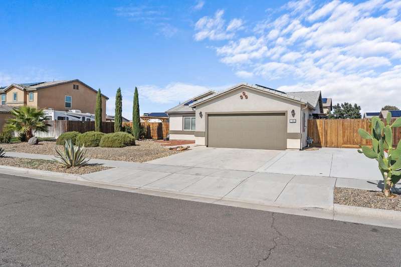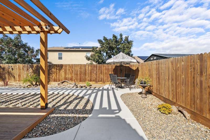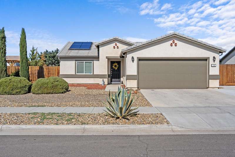 Welcome to this gorgeous 3 bedroom, 2 bath home built in 2019, where pride of ownership truly shines! Meticulously maintained and move-in ready, this home truly has it all modern comfort, style, and care in every corner. Enjoy peace of mind and energy savings with paid-in-full solar and a paid whole-house water filtration system. The security system and cameras are included, making this home as safe as it is beautiful. Outside, you'll love the low-maintenance rock landscaping, custom pergolas, drip irrigation system - front and back, and expansive concrete work, offering plenty of space for entertaining, relaxing, or play. The large backyard and side yard provide room to host gatherings, or simply unwind. You won't want to miss out on this fantastic opportunity to call this house your home!