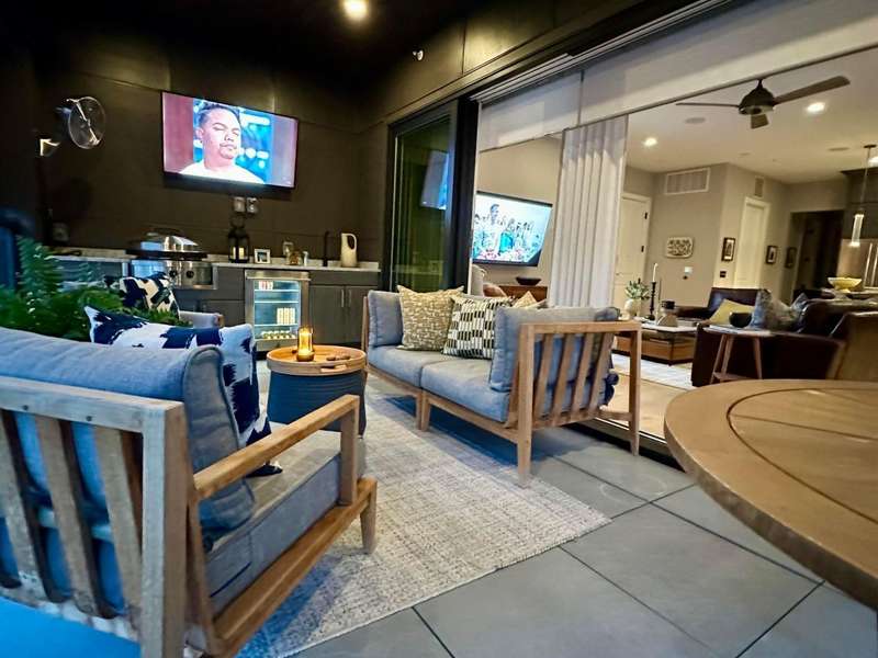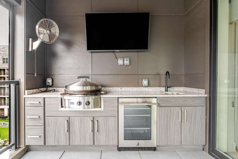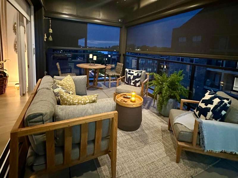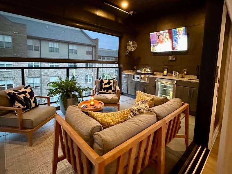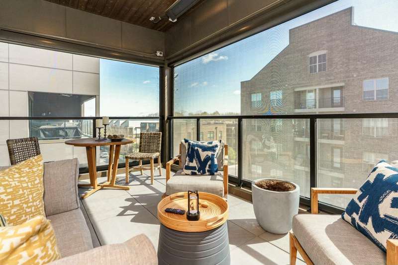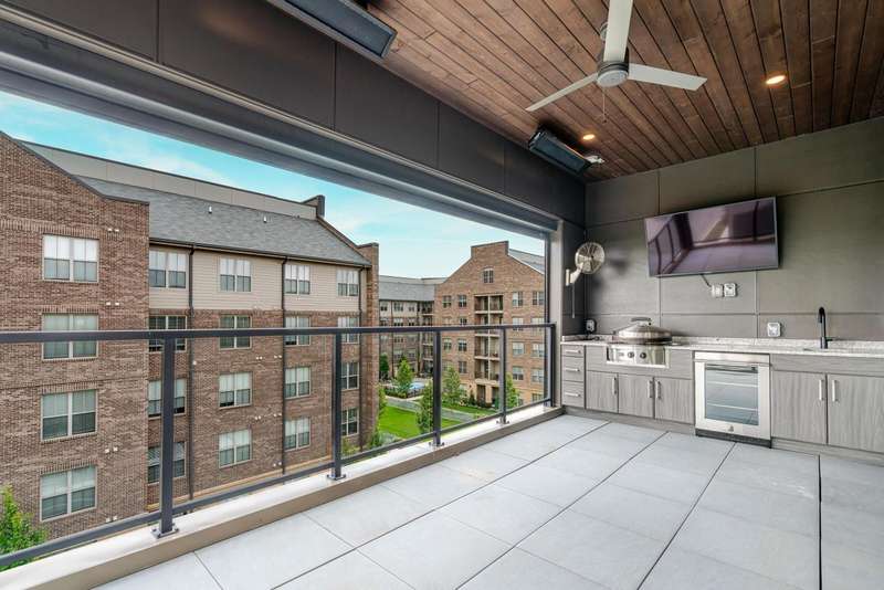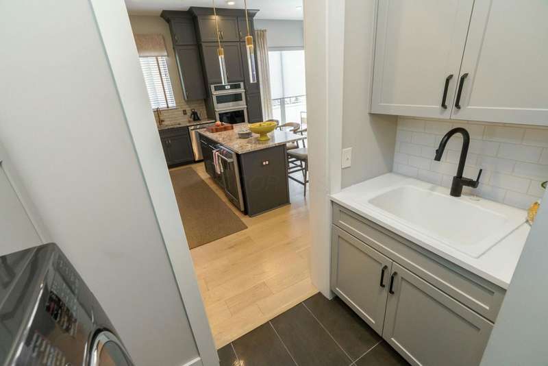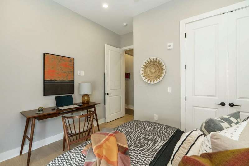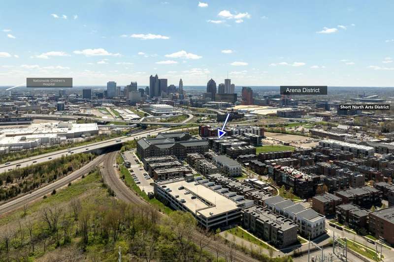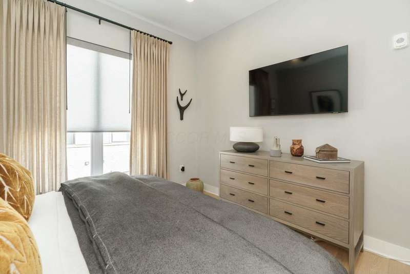 AMAZING NEW PRICE! Offering exceptional value compared to a new Thrive higher priced unit. QUICK FACTS: TOP floor, BEST CORNER UNIT, motorized retractable screened-in patio with outdoor kitchen, retractable glass patio doors, private oversized 2 CAR GARAGE, tons of upgrades, TAX ABATED. ALL THE DETAILS: The ULTIMATE URBAN RETREAT with an OVERSIZED PRIVATE 2-CAR GARAGE (plenty of extra storage) and over $100K in upgrades (see attached list). Bring your indoor living space outside with this MASSIVE 200+ SQFT COVERED PATIO perfect for 3-season enjoyment - ideal for BBQ's, movie nights, gardening, and OSU pre-game gatherings. Facing east and north, this unit is overall more energy efficient, and the patio features custom retractable screens, flat screen, ceiling fan, two digital ceiling heaters, dimmable ceiling lights and collapsible floor to ceiling glass doors for that California concept living. Outfitted with a granite outdoor kitchen, Evo grill, Jenn-Air beverage fridge, sink, and below sink spigot for easy patio maintenance. Inside, enjoy 10' ceilings, wide-plank oak wood floors, upgraded chef's kitchen with Jenn-Air appliances, extended upper cabinets, custom pendant lights, and second island beverage fridge. The open layout has plenty of room for dining options, while the living area features 14 dimmable recessed lights with 4 built-in ceiling speakers and flat screen. Custom Hunter Douglas window treatments throughout, including motorized blackout shades in both bedrooms. Ceiling fans throughout. SmartThings tech controls your thermostat, door lock, patio heaters, and more. This building features an elevator, stunning stairwells, sits across from A WELL LIT PARK in a SUPER WALKABLE, DOG-FRIENDLY NEIGHBORHOOD. Enjoy access to MULTIPLE SWIMMING POOLS, a FITNESS CENTER MEMBERSHIP, and is convenient to the Short North, downtown, and 670/315. TAX ABATED THROUGH 2037