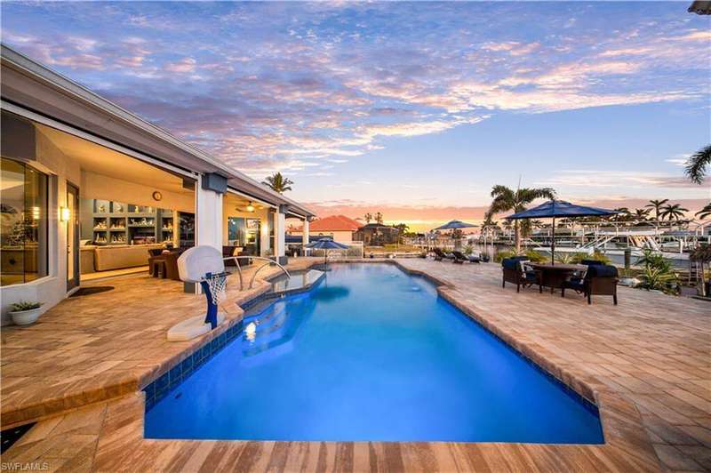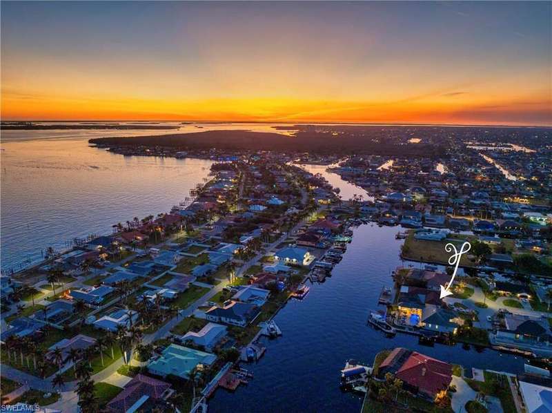 Welcome to 5374 Congo Court, a rare waterfront gem tucked away on a coveted corner lot in Cape Coral's desirable Yacht Club neighborhood. With 235 feet of intersecting canal frontage just steps from the river, this home is a boater's dream. A full wrap-around dock accommodates multiple vessels up to 55 feet and includes jet ski lifts for effortless access to the water. Designed for indoor-outdoor living, the expansive lanai showcases a massive 45-foot pool, outdoor kitchen, and bar - the perfect backdrop for entertaining or quiet relaxation. Inside, soaring 15-foot ceilings and walls of glass flood the great room with natural light and frame panoramic water views from every angle. The 3-bedroom, 3-bath residence is equipped with thoughtful upgrades including a whole-home generator powered by a 500-gallon propane tank. Mature tropical landscaping and swaying coconut palms complete the sense of privacy and paradise. Opportunities like this don't come along often. With motivated sellers and one of the best water lots in the Yacht Club, this home delivers an unbeatable blend of lifestyle, location, and value.