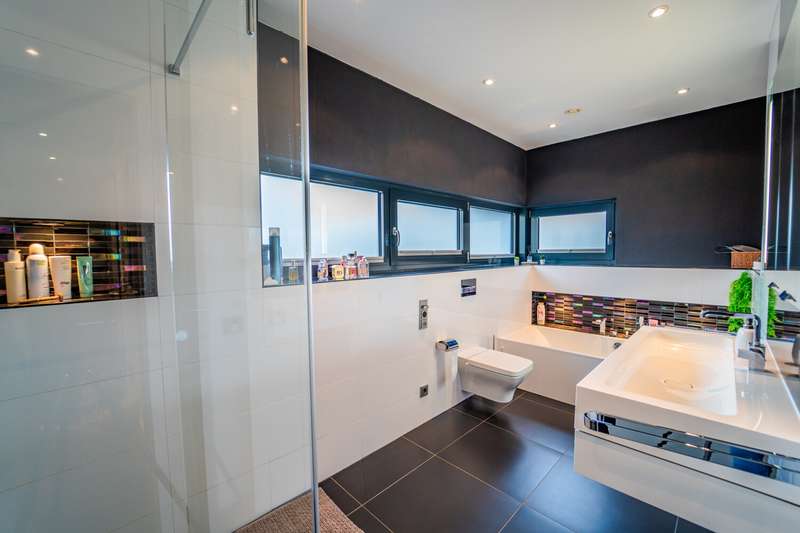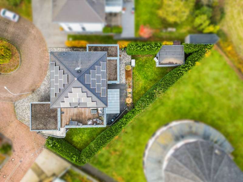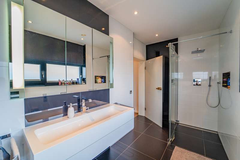 This property combines modern design, high-quality fittings and an outstanding location - perfect for anyone who is looking for something special and values quality, style and future security. Built in 2012, the two-family house stands on a generous plot of approx. 1,076 m² and offers plenty of space for living and individuality in a sought-after location with approx. 266 m² of living space. The upper floor with approx. 85 m² + 30 m² terrace is currently rented out and provides attractive rental income - ideal for anyone who wants to elegantly combine living and investment. Only high-quality materials were used throughout the house. First floor approx. 143 m²: The spacious entrance area leads to the guest WC, checkroom and directly into the stylish living area with fireplace. From here, the hallway opens up to the open, modern and well-equipped eat-in kitchen on the first floor, which is harmoniously connected to the dining area and living room. Floor-to-ceiling windows, electrically controlled shutters via the bus system and pleasant underfloor heating create an inviting, light-flooded ambience. A separate wing houses the private relaxation area with a modern bathroom with bath, shower and special window details. This area is complemented by a spacious bedroom, a dressing room and a guest or office room with direct access to the terrace - ideal as a retreat or stylish workplace. There is a separate utility room on both the ground and upper floors for added convenience. Technically, the house is of the highest standard: underfloor heating, fireplace, integrated ventilation system and a modern bus system for the intelligent control of lighting and electrics ensure contemporary living comfort. A spacious double garage and two to three outdoor parking spaces offer room for your vehicles. The well-tended garden rounds off the harmonious overall picture. The photovoltaic system is used externally, remaining term five years, can be purchased separately when buying the property. We look forward to receiving your inquiry and would be happy to present this exceptional house to you in person during a viewing - please have proof of bank account ready, thank you for your understanding.
