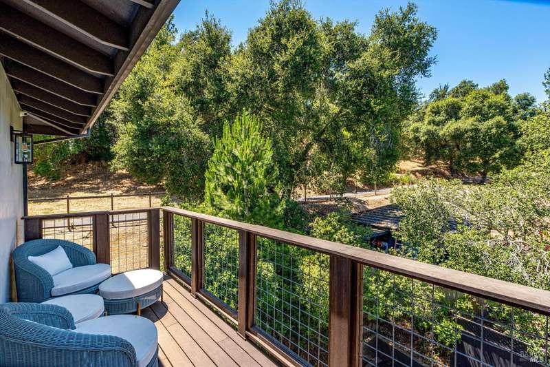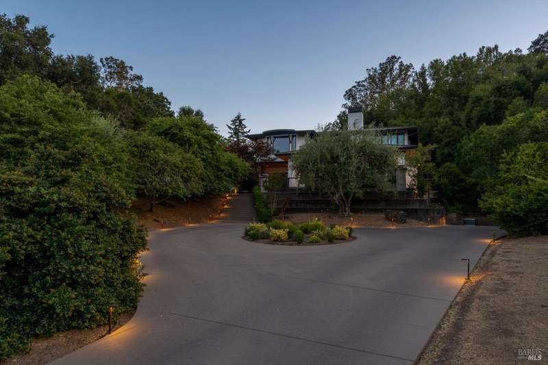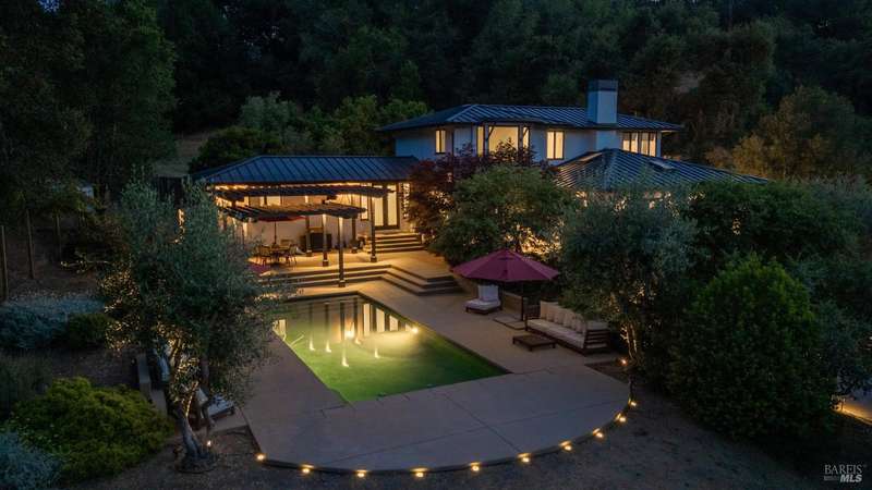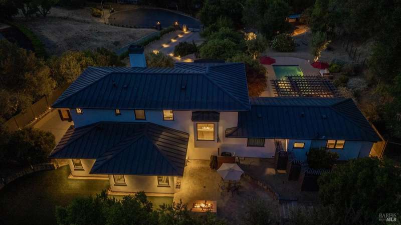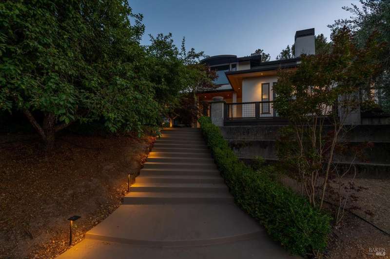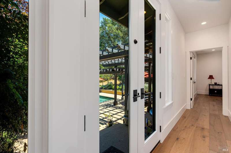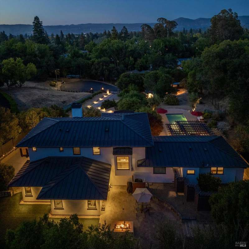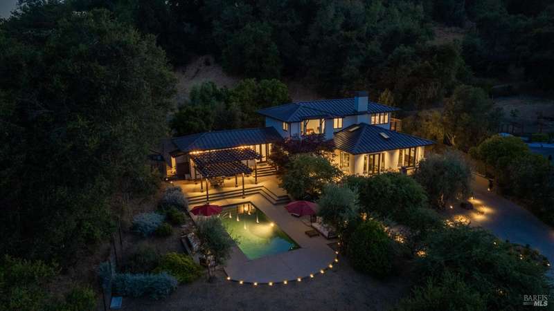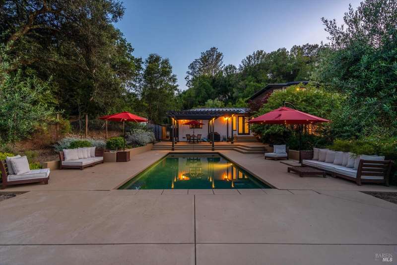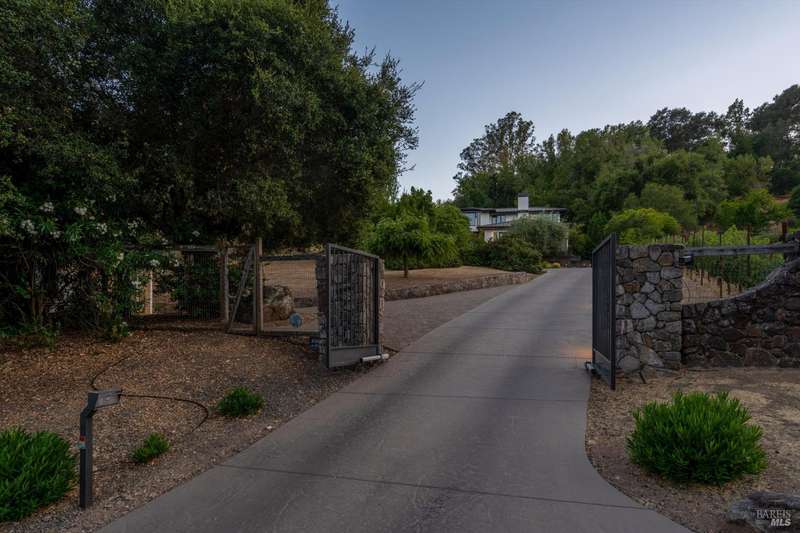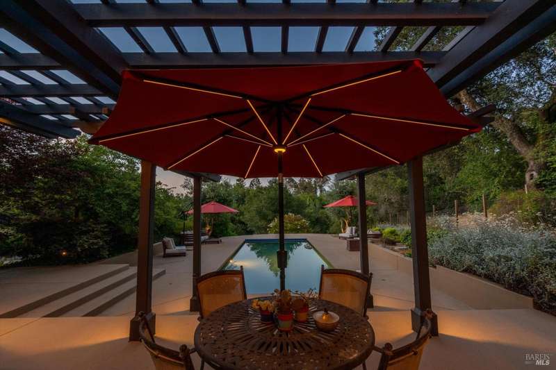 Luxurious Napa Valley estate, recently remodeled with top-tier materials. The main home features a spacious chef's kitchen opening to a balcony with breathtaking mountain views, and a primary suite overlooking the pool. Two additional en-suite bedrooms provide ample space for guests. A stunning guest house with upgraded appliances, elegant finishes, one bedroom, and built-in bunk beds offers a perfect retreat. Radiant flooring throughout ensures year-round comfort, while an advanced Sonos sound system and six outdoor speakers enhance indoor and poolside entertainment. The impressive wine cellar with seamless glass displays your collection in style. Located on a secure cul-de-sac with a gated private entrance, this meticulously designed home combines privacy with convenience, just minutes from downtown Napa. Enjoy the perfect blend of countryside charm and modern luxury in this exceptional Napa estate.