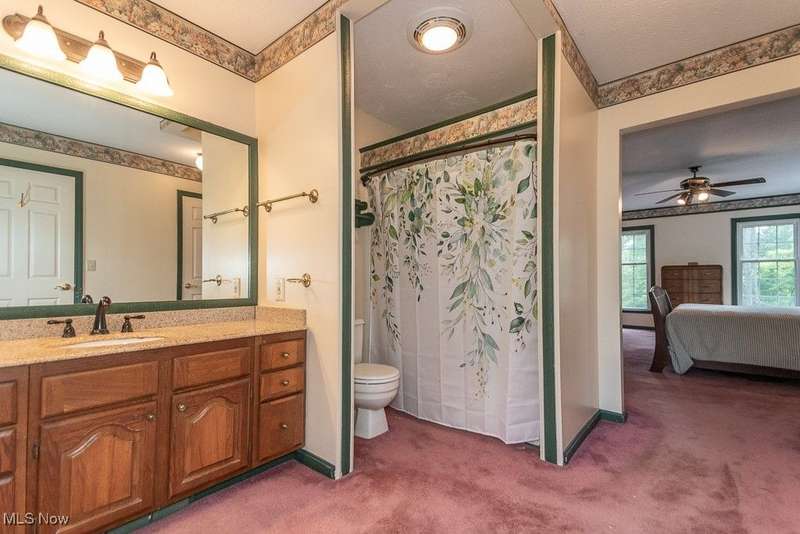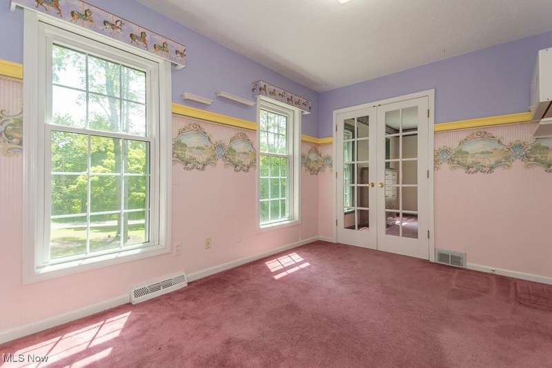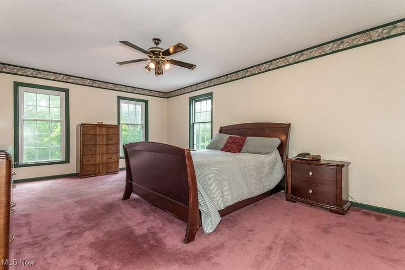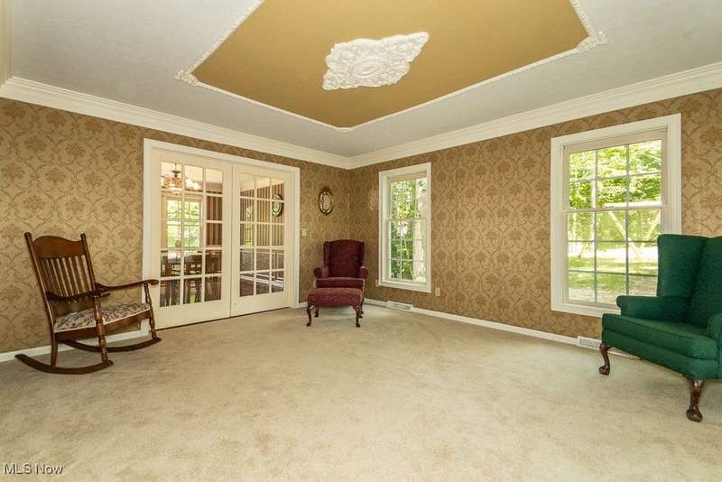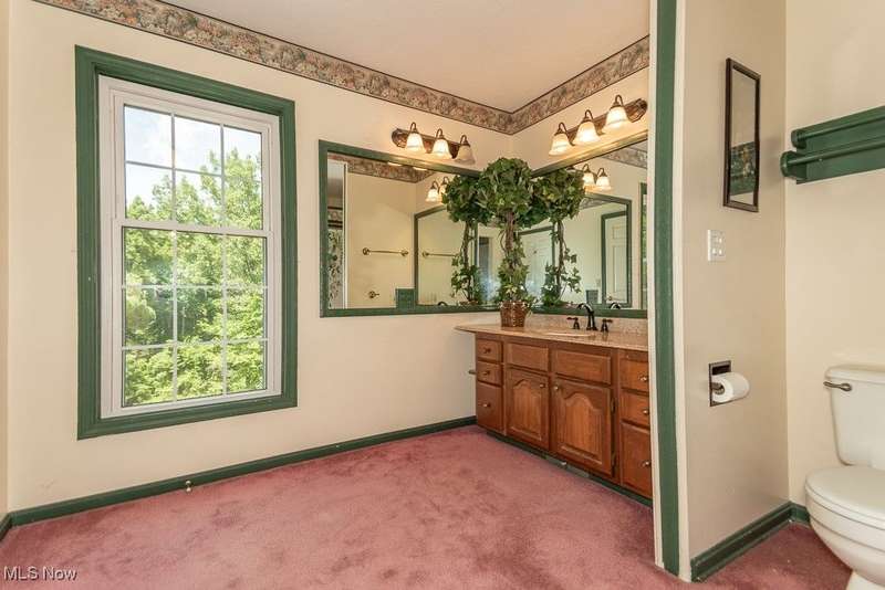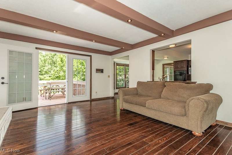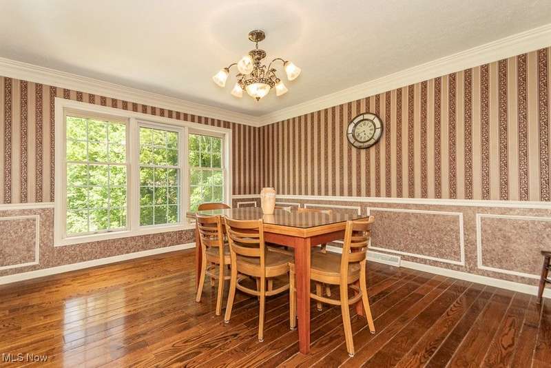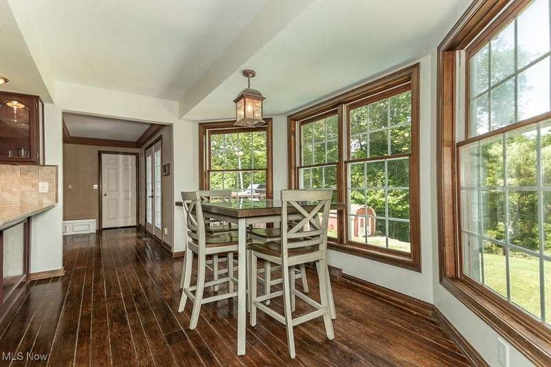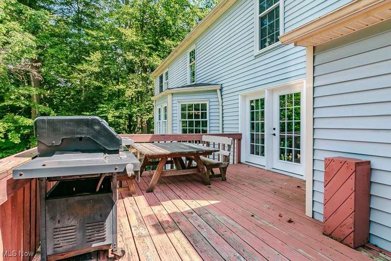 Nestled atop Wilson Mills Hill, this distinguished Colonial rests on beautiful, private acreage with sweeping views of a tranquil tributary of the Chagrin River. Designed for both comfort and refined entertaining, the inviting wraparound floor plan flows effortlessly from the updated gourmet kitchen, featuring granite countertops and an airy eat-in with river vistas, to the formal dining room and formal living room, each graced with a decorative ceiling and double crown molding. The warm and welcoming family room offers a beamed ceiling, a gas fireplace, and French doors opening to a spacious deck, the perfect stage for gatherings under the open sky. Rich hardwood floors carry throughout, adding warmth and sophistication. Upstairs, the luxurious primary suite boasts dual walk-in closets, while the finished lower level provides remarkable flexibility, ideal as an in-law suite or private quest quarters, with a kitchenette, gas fireplace, two bonus rooms, full bath, and a walk-out to the backyard. Recent updates include a fully updated HVAC system (2025), ensuring comfort and efficiency for years to come. With its picturesque setting, timeless architecture, and a rare blend of privacy and proximity, this Chesterland gem offers an unparalleled lifestyle opportunity.