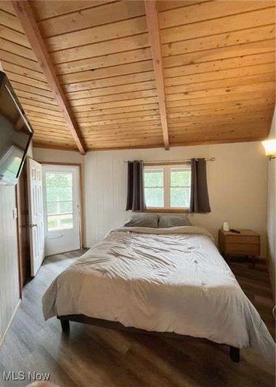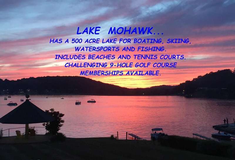 Here is a unique opportunity to own one of the original round homes built at Lake Mohawk. Nestled on 2.5 lots, this private setting boasts seasonal lake views. Beautifully updated, the main level features open floor plan, natural wood cathedral ceilings with beams, comfortable living room with stone fireplace, three bedrooms, full bath and nicely updated kitchen with stainless appliances. The lower level extends your living area with office space or playroom, spacious laundry area with plenty of counter space and showcases a modern second full bath. This level provides direct access to the attached garage for convenience. Home features wrap around porch with added deck...great for entertaining and cookouts or just relaxing and enjoying the views. The property truly shines with its exceptional detached garage/workshop. Constructed in 2022, the main garage is 34' x 28', separate 200-amp service, 19' x 7' mezzanine storage area, hot/cold sink, high bay LED lighting and gas 55,000 BTU heater. Overhead door (12' x 12) with automatic opener and two man-doors for easy access. Plumbed air compressor is also available. Large workshop upstairs with private entrance is ideal for home office or hobby room, complete with half bath and a/c unit. Lake Mohawk has 500-acre lake for boating (unlimited horsepower), swimming, fishing, tennis court, pickleball courts, clubhouse and baseball field. Separate membership available for golf course. Convenient to Akron, Cleveland and Pittsburg areas. Auditor indicates 1 full bath, but Seller states 2 full baths.