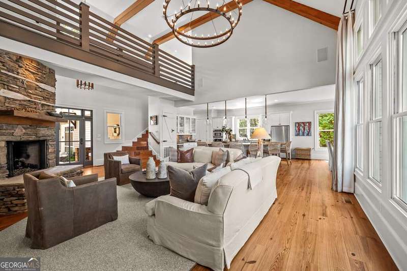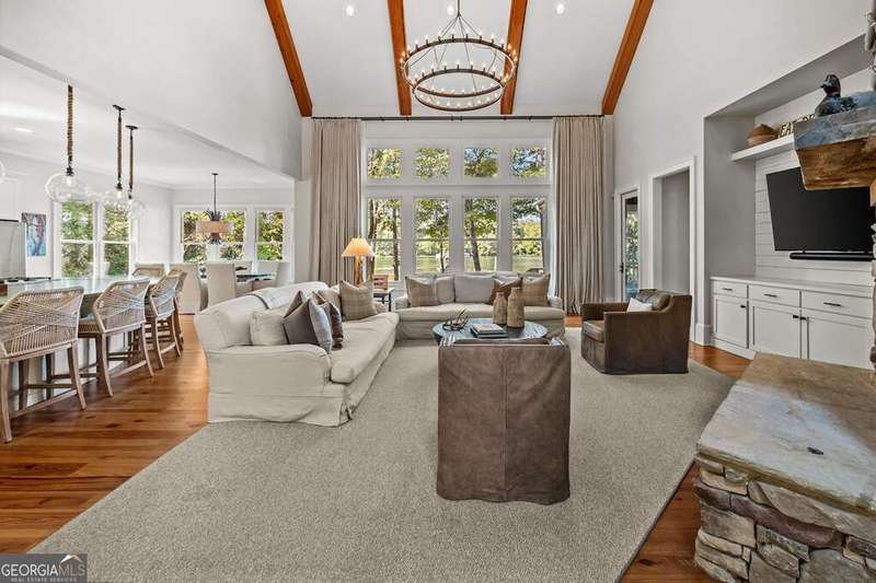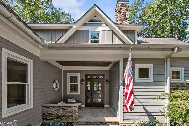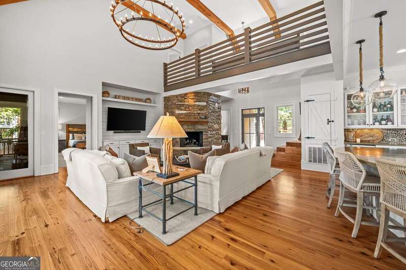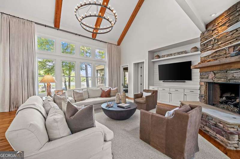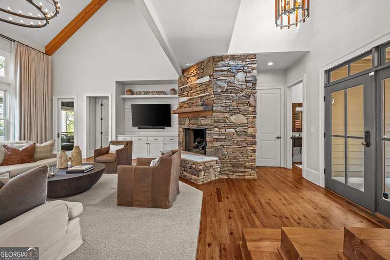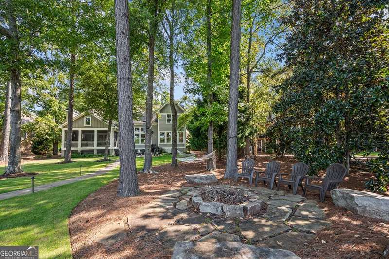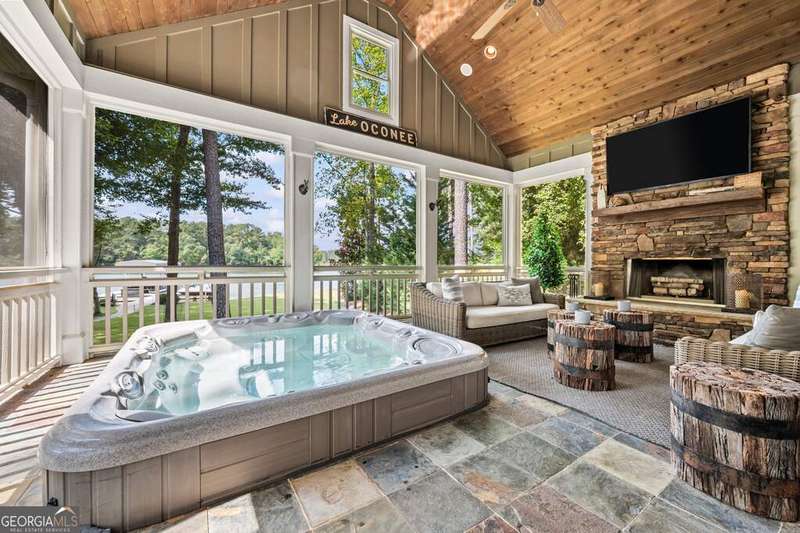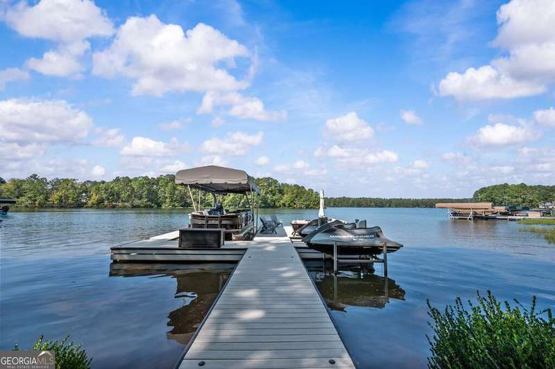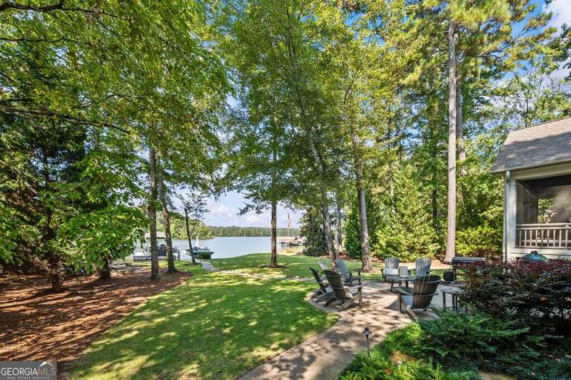 If you're looking for Lake Oconee living set on a quiet cove with max dock and a flat, landscaped backyard, then this 5 bedroom, 4.5 bathroom lake front property in the Emerald Shores neighborhood is ready for you! This DreamBuilt home features an open floor plan with a two-story great room and stone fireplace, kitchen featuring stainless steel appliances and oversized island that accommodates 6+ guests, dining space that accommodates 8+ guests, all with lake views and perfect for entertaining! Additional entertaining space is located on the screened in porch featuring a wood-burning fireplace and hot tub. Primary suite, guest room with ensuite bathroom, powder room, and utility room on the first floor allow for one floor living. The second floor features the third ensuite bedroom and a fourth bedroom with quick access to the hallway bathroom. The current owner uses the fifth bedroom as combined bunk room plus sitting area - this flexible space also can be used as a game room or office space. Additional features include recently refurbished max dock, two electric personal watercraft lifts, 7,000lb hydraulic boat lift, yard irrigation system, exterior light and hard scaping, firepit, 25' commercial flag pole, new dual electric hot water heaters, water softener and purification systems, central vacuum, interior remote start propane fire place, 10-feet ceiling on main floor, two car garage, car charging outlet, guest parking, and more! Home is located a short boat ride away from the planned Hideaway, Ritz Carlton, Jumping Rock, Birch restaurant, among other Lake Oconee points of interest!! For a truly turnkey vacation home experience, Seller is offering select furniture, boat, and personal watercraft by way of a separate bill of sale.