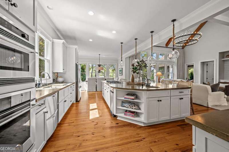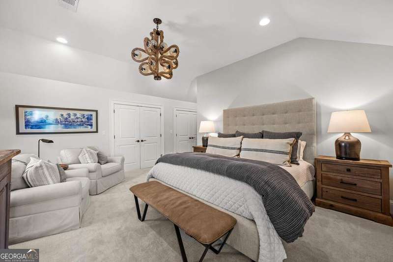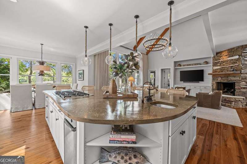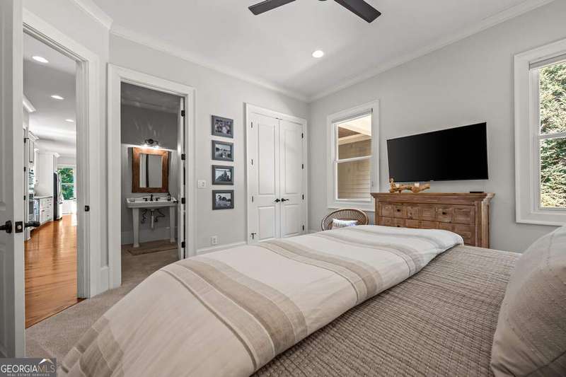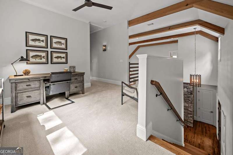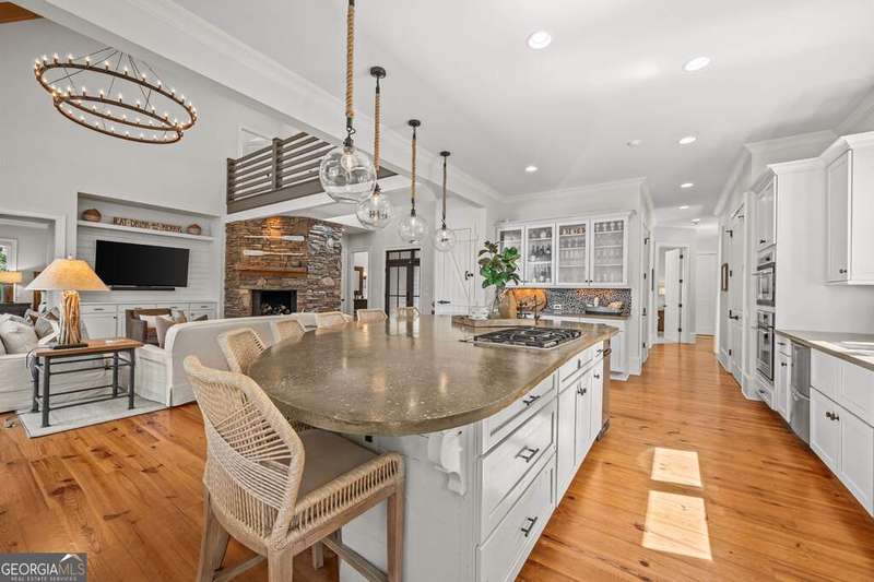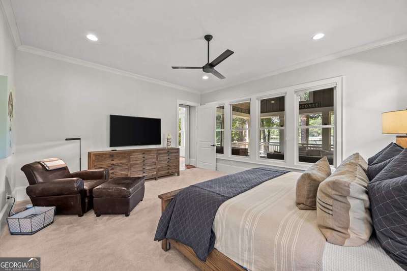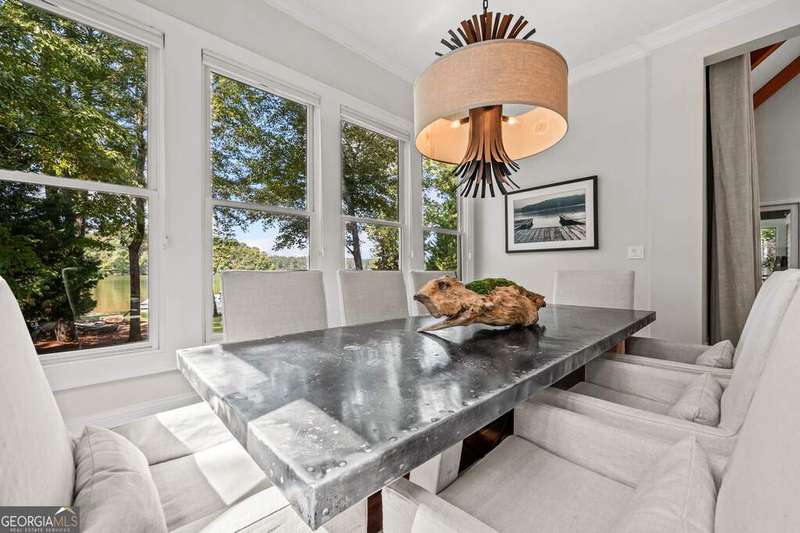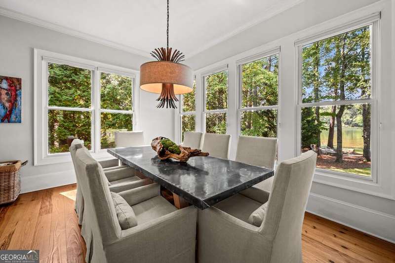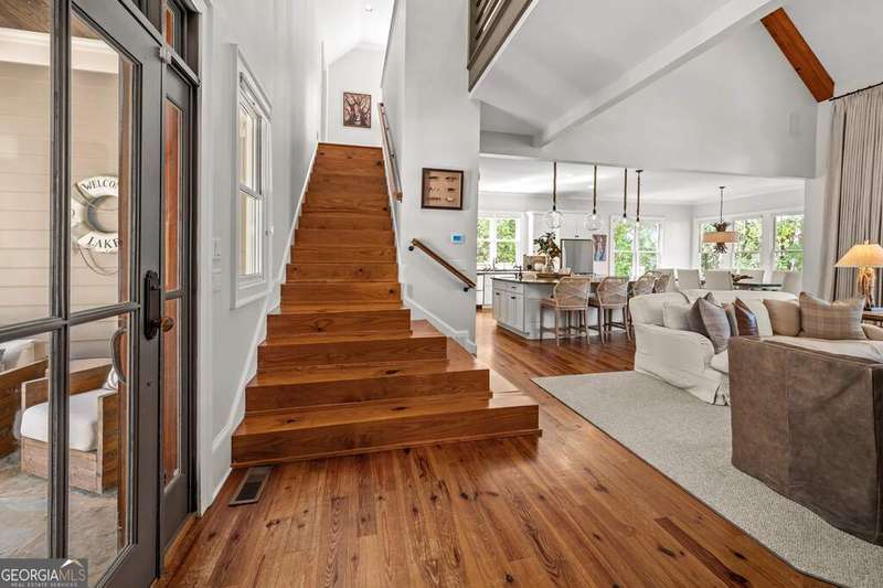 If you're looking for Lake Oconee living set on a quiet cove with max dock and a flat, landscaped backyard, then this 5 bedroom, 4.5 bathroom lake front property in the Emerald Shores neighborhood is ready for you! This DreamBuilt home features an open floor plan with a two-story great room and stone fireplace, kitchen featuring stainless steel appliances and oversized island that accommodates 6+ guests, dining space that accommodates 8+ guests, all with lake views and perfect for entertaining! Additional entertaining space is located on the screened in porch featuring a wood-burning fireplace and hot tub. Primary suite, guest room with ensuite bathroom, powder room, and utility room on the first floor allow for one floor living. The second floor features the third ensuite bedroom and a fourth bedroom with quick access to the hallway bathroom. The current owner uses the fifth bedroom as combined bunk room plus sitting area - this flexible space also can be used as a game room or office space. Additional features include recently refurbished max dock, two electric personal watercraft lifts, 7,000lb hydraulic boat lift, yard irrigation system, exterior light and hard scaping, firepit, 25' commercial flag pole, new dual electric hot water heaters, water softener and purification systems, central vacuum, interior remote start propane fire place, 10-feet ceiling on main floor, two car garage, car charging outlet, guest parking, and more! Home is located a short boat ride away from the planned Hideaway, Ritz Carlton, Jumping Rock, Birch restaurant, among other Lake Oconee points of interest!! For a truly turnkey vacation home experience, Seller is offering select furniture, boat, and personal watercraft by way of a separate bill of sale.