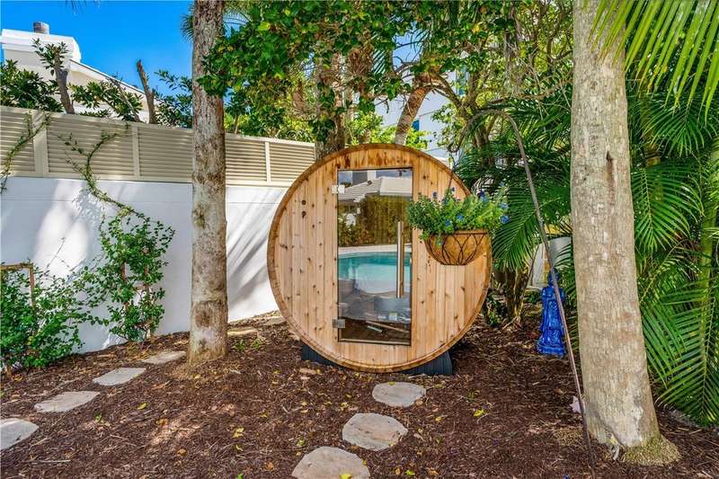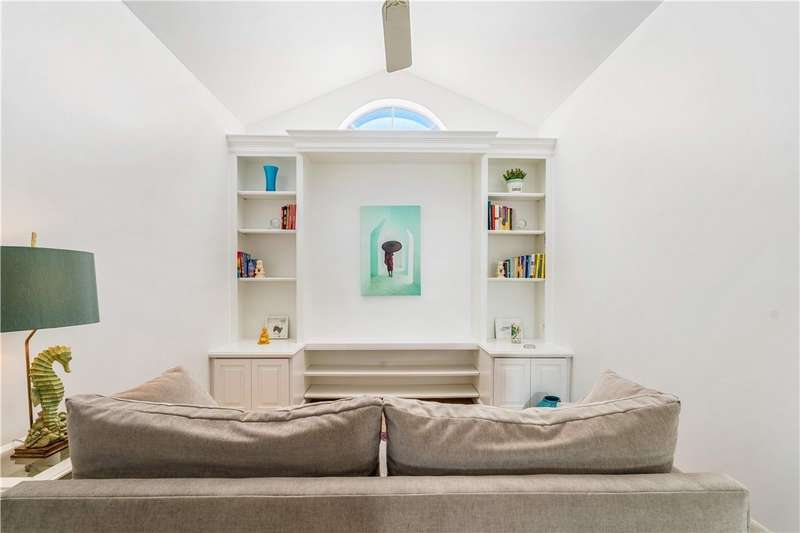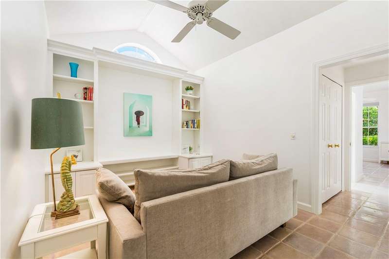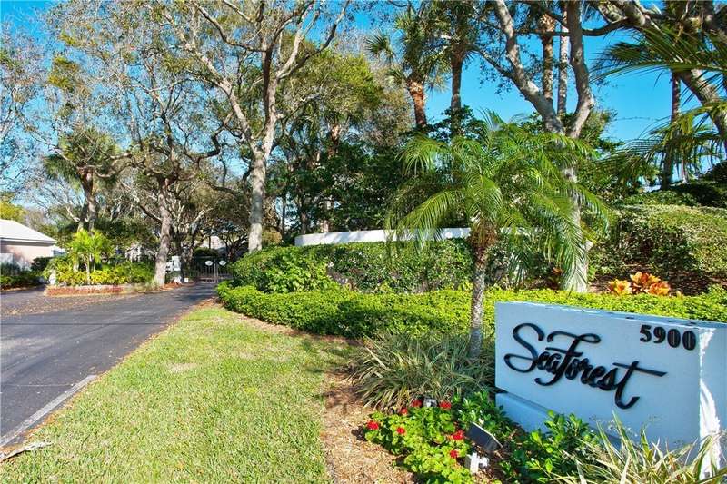 Ideally situated east of A1A, the established gated enclave of Sea Forest Court is graced with majestic live oaks and lush tropical landscaping. Just a short walk to private beach access, this charming Old Florida Bermuda-style CBS home offers 2 bedrooms, 2.5 baths, plus a den overlooking the pool and garden. Interior features include vaulted ceilings, impact French doors, and classic pickled Saltillo tile floors. A two-car AC garage completes the plan. Brand new pool deck. Close proximity to boutique ships, restaurants and community beach pavilion.