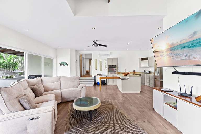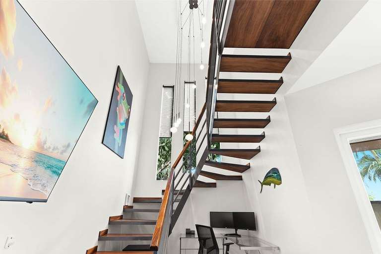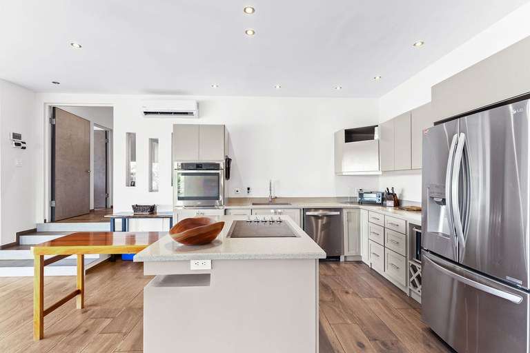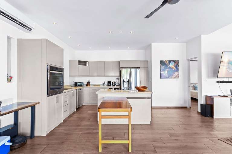 The heart of the estate is a 4-bedroom main home, masterfully blending modern elegance with relaxed tropical style. The open-concept living area flows seamlessly into the gourmet kitchen, equipped with granite countertops, stainless steel appliances, and a beautiful hardwood island perfect for casual dining or meal prep.