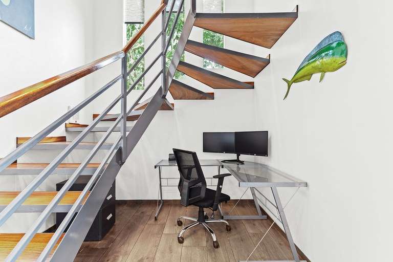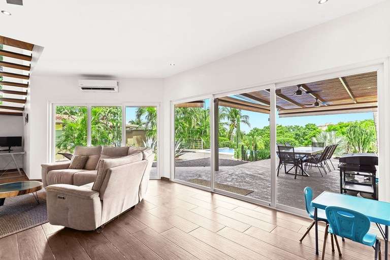 Upstairs, the primary suite offers a king-sized bed, dual-vanity en-suite bath, and a private ocean-view veranda, perfect for enjoying Tamarindo's epic sunsets. All other bedrooms feature sliding glass doors that open directly to the outdoors, inviting in sunlight, breezes, and the natural beauty of the surroundings.