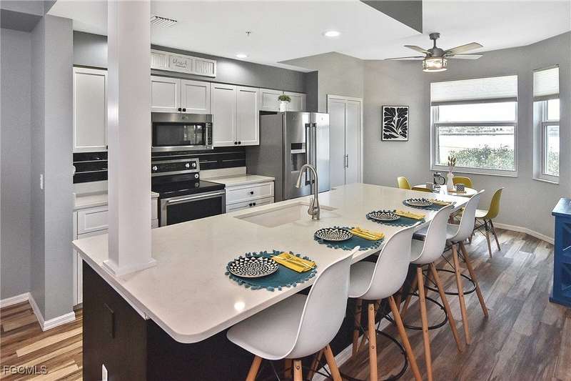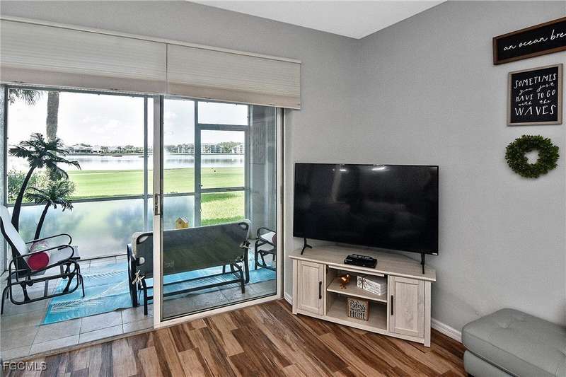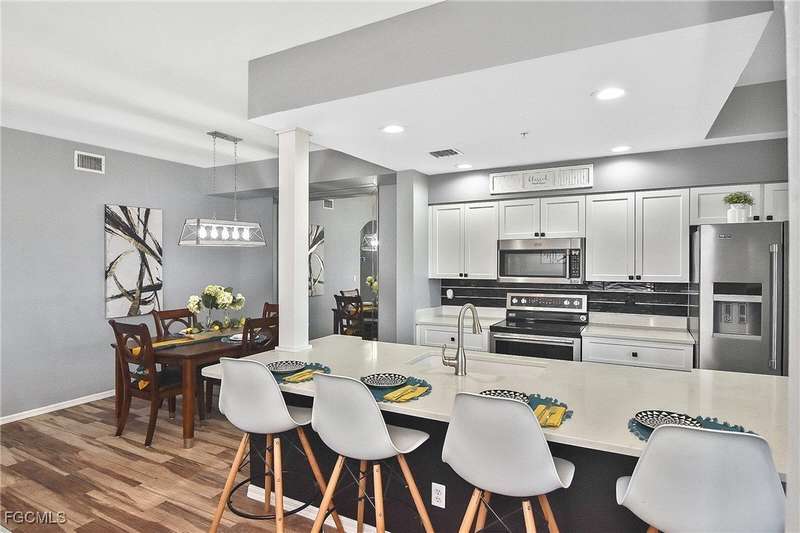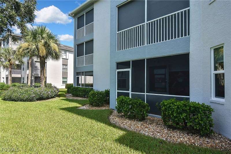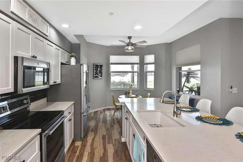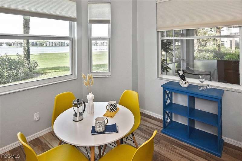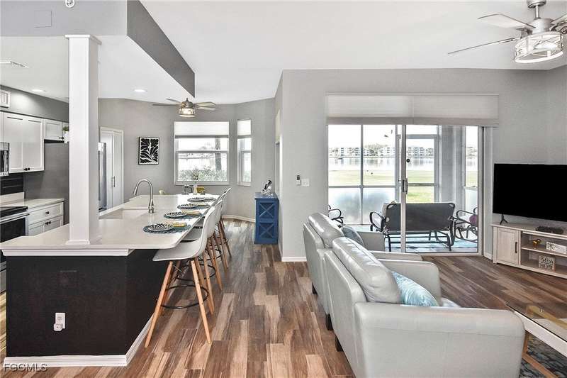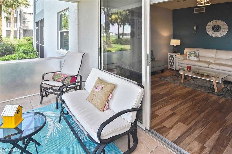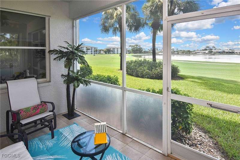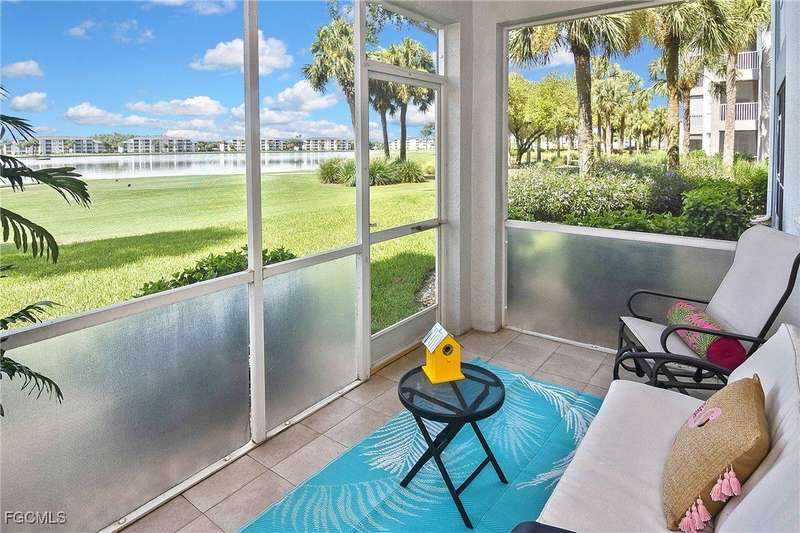 Welcome to your dream home in the esteemed Heritage Palms Golf and Country Club community! This upscale and completely renovated first-floor condo features vibrant colors and an avant-garde decor that define this striking, TURNKEY home. New tile flooring and modern light fixtures enhance the contemporary aesthetic throughout the space. As you enter, you'll be captivated by this unified and integrated kitchen and dining area, designed for effortless entertaining, with a sleek and streamlined granite countertop, new easy-close cabinets and pantry door, attractive stainless steel appliances, and striking backsplash. Stylish furnishings add to the charm and elegance, making this condo truly move-in ready. Step into the upgraded primary bath for a spa-like retreat. The neoteric glass shower doors, rich jewel-toned tile/backsplash, and dual rainfall showerheads will create a luxurious experience that will make you feel like you're at a high-end resort every day. Relax on the south-facing tiled lanai, offering a breathtaking and uninterrupted view of the lake, clubhouse and 18th hole of the Royal golf course. The large hurricane impact windows and sliding glass doors bring in plenty of natural light while providing peace of mind. This home also features a Nest smart thermostat, Ring doorbell, Maytag dryer 2023, and HVAC 2023. As an owner in Heritage Palms, you'll enjoy access to a private, gated, bundled Golf community, that features two 18 hole championship golf courses, along with various amenities, including tennis, Pickleball, bocce, activities, center, exercise, and yoga, classes, and more. The debut of the new Oasis Grill and tiki bar, with a resort style pool, is scheduled to be completed this October 2025. The clubhouse offers formal and casual dining. This community is conveniently located within 3 miles of shopping and dining, 10 miles from the RSW airport, making it perfect for full-time living or a seasonal haven.
