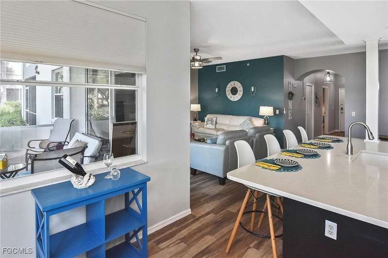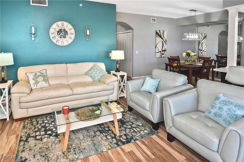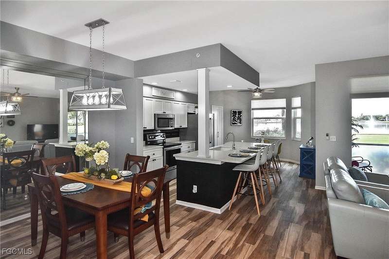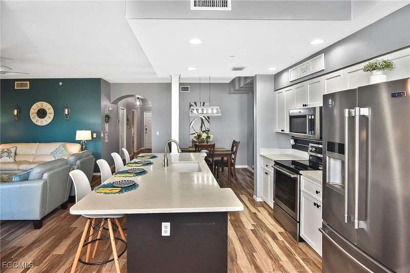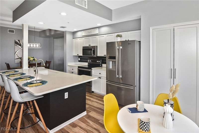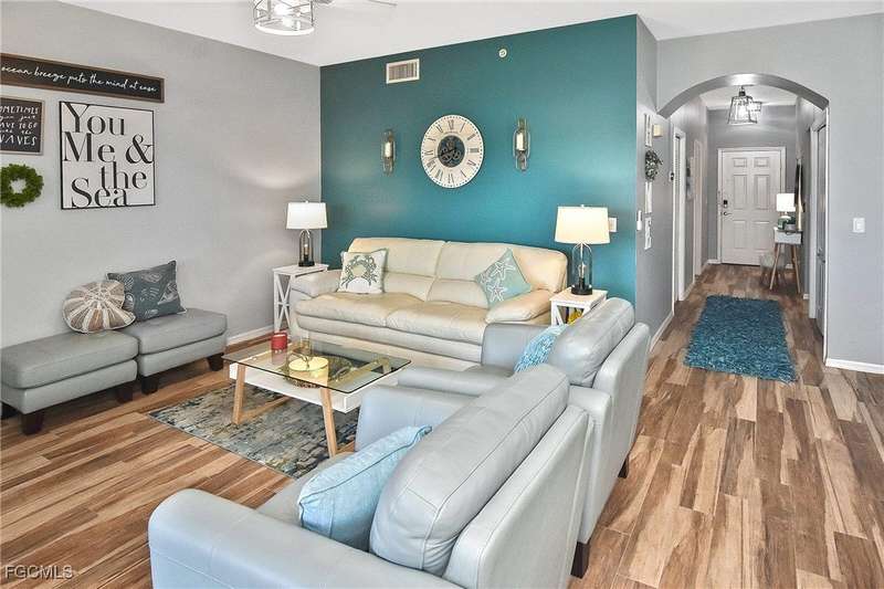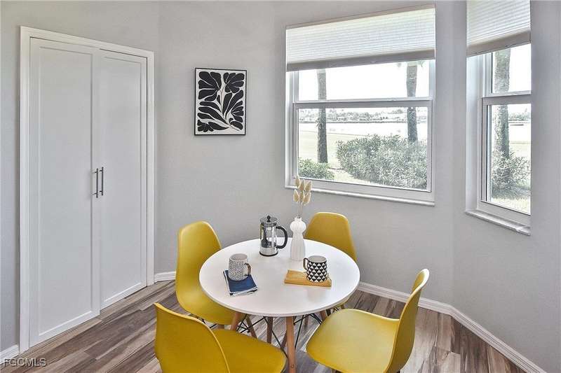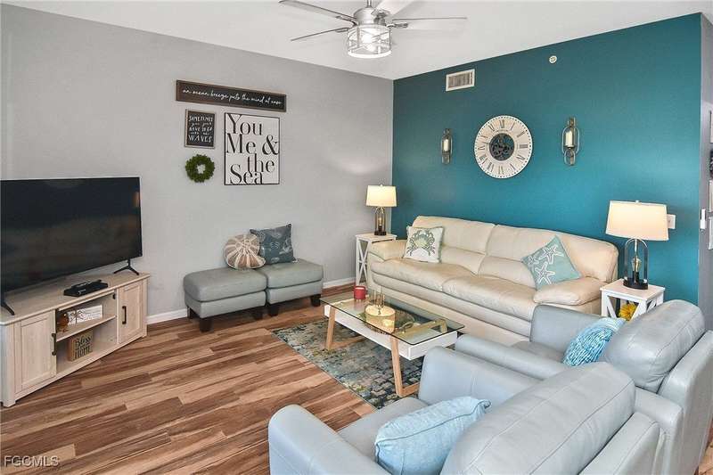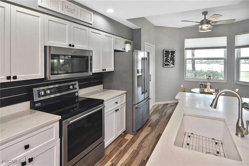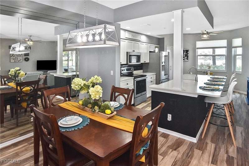 Welcome to your dream home in the esteemed Heritage Palms Golf and Country Club community! This upscale and completely renovated first-floor condo features vibrant colors and an avant-garde decor that define this striking, TURNKEY home. New tile flooring and modern light fixtures enhance the contemporary aesthetic throughout the space. As you enter, you'll be captivated by this unified and integrated kitchen and dining area, designed for effortless entertaining, with a sleek and streamlined granite countertop, new easy-close cabinets and pantry door, attractive stainless steel appliances, and striking backsplash. Stylish furnishings add to the charm and elegance, making this condo truly move-in ready. Step into the upgraded primary bath for a spa-like retreat. The neoteric glass shower doors, rich jewel-toned tile/backsplash, and dual rainfall showerheads will create a luxurious experience that will make you feel like you're at a high-end resort every day. Relax on the south-facing tiled lanai, offering a breathtaking and uninterrupted view of the lake, clubhouse and 18th hole of the Royal golf course. The large hurricane impact windows and sliding glass doors bring in plenty of natural light while providing peace of mind. This home also features a Nest smart thermostat, Ring doorbell, Maytag dryer 2023, and HVAC 2023. As an owner in Heritage Palms, you'll enjoy access to a private, gated, bundled Golf community, that features two 18 hole championship golf courses, along with various amenities, including tennis, Pickleball, bocce, activities, center, exercise, and yoga, classes, and more. The debut of the new Oasis Grill and tiki bar, with a resort style pool, is scheduled to be completed this October 2025. The clubhouse offers formal and casual dining. This community is conveniently located within 3 miles of shopping and dining, 10 miles from the RSW airport, making it perfect for full-time living or a seasonal haven.