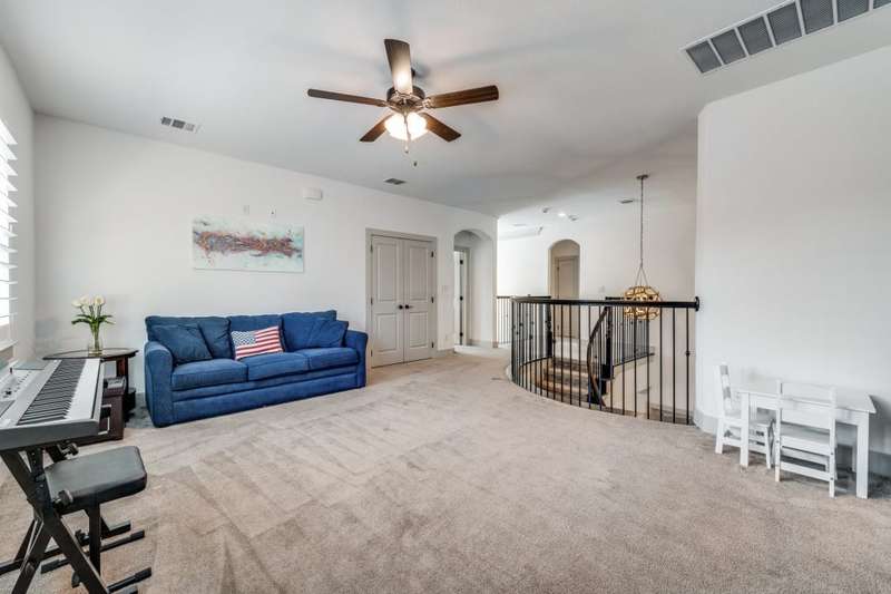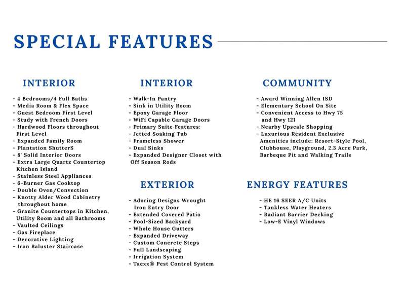 Dont miss the chance to own this extraordinary Toll Brothers home, featuring extensive upgrades and improvements, in a prime Allen location served by highly acclaimed Allen ISD. Elegance meets functionality in this beautifully appointed home, set in a desirable neighborhood with elementary school within walking distance, easy access to Hwy's 121 & 75, and close proximity to shopping, dining, entertainment, with more on the way!This beautiful home has a welcoming entry with stunning staircase, soaring ceilings, a dedicated office, and a first-floor guest suite with a full bath. The chefs kitchen showcases an oversized island, premium appliances, custom cabinetry, and a dedicated dining area that seamlessly flows into the expansive living room anchored by a striking custom fireplace. The first-floor primary suite is a retreat, complete with a spa-inspired bath and designer custom closet. Additional thoughtful features include abundant storage, a custom mud bench, and utility room with sink and built-in cabinetry.Upstairs, youll find two additional bedrooms, two full baths, a media room, and a versatile flex space ideal for family time or entertaining.Step outside to the expansive custom patio with floor-to-ceiling, remote-controlled retractable shadesperfect for year-round enjoyment.This sought-after neighborhood offers a large community pool, clubhouse, walking trails, and playground. Current homeowners have invested over $125,000 with major upgrades and improvements in the last 3 years. See list in docs tab.Opportunities like this are rareluxury living and everyday convenience at its finest!