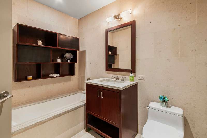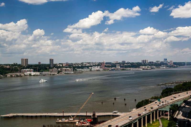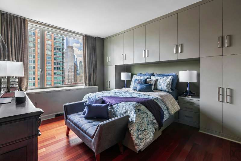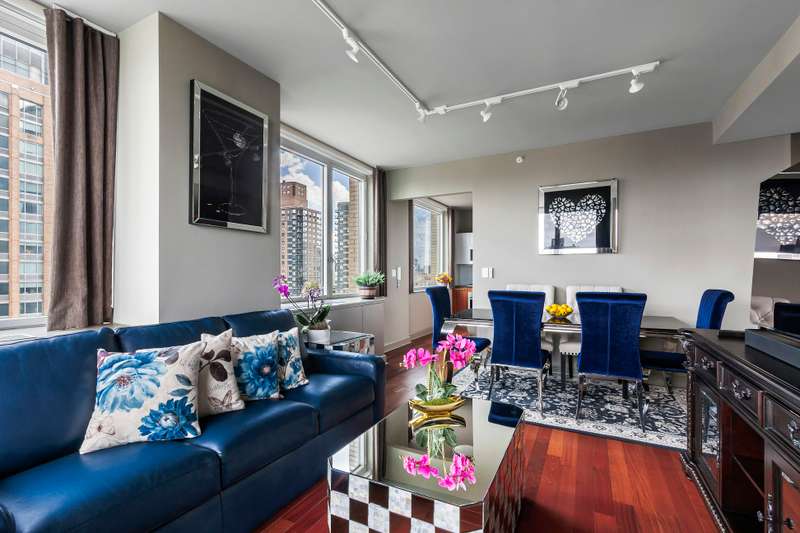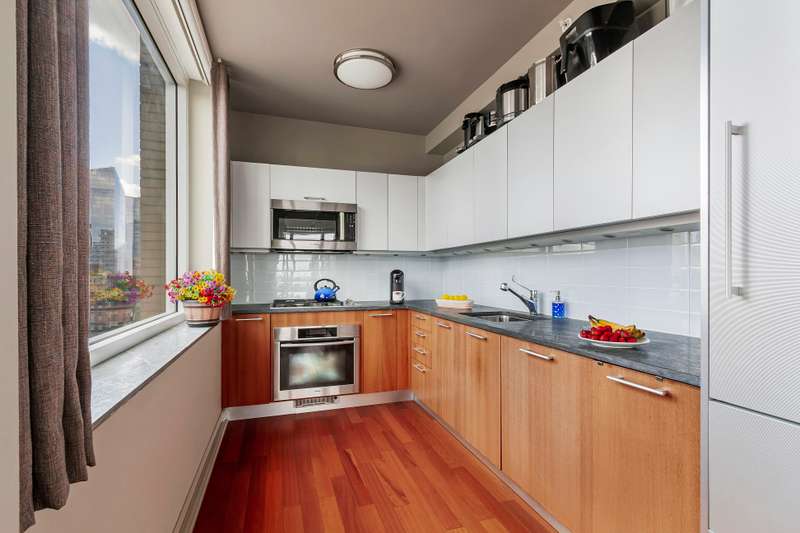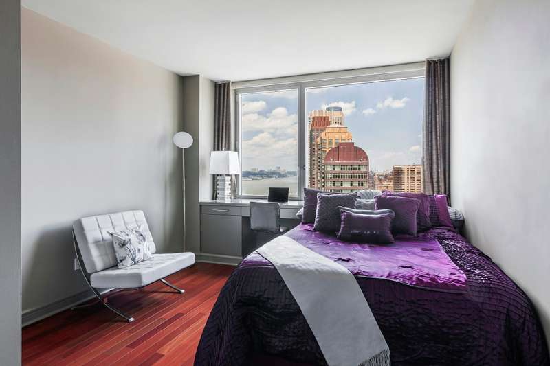 Perched on the 27th floor, this corner unit offers sweeping North and East views of the Hudson River and city skyline. The renovated kitchen features high-end appliances, including a Sub-Zero fridge, Miele cooktop, oven, and dishwasher, granite countertops, and a glass subway tile backsplash. ; Motorized blackout/light-filtering shades on all windows.