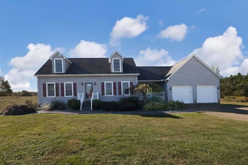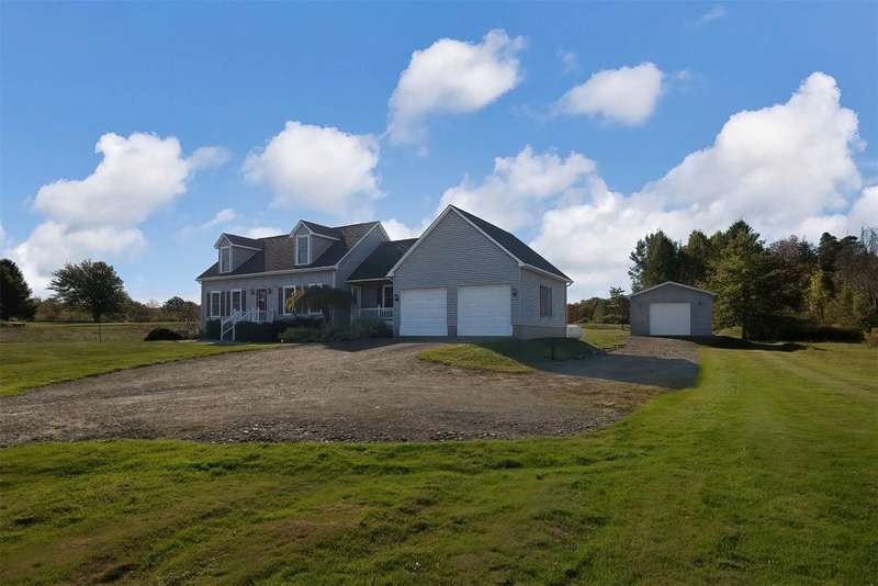 You'll find scenic country surroundings in this newer built Cape Cod in North East "On the Hill". Breathtaking panoramic views of Lake Erie and local vineyards. Featuring a comfortable living room, accompanying family room or private office and a full eat in kitchen. Includes a first floor primary bedroom with attached full bathroom and walk in closet. Second floor features two generously sized bedrooms with incredible views and a full bathroom. Gaze at the beautiful Canadian nighttime lights while you sit on your covered front porch. Additional 16' x 32' pole barn with a single bay overhead door and private driveway. Recent updates include all new Seaway windows and sliding patio door (2023) with transferable warranty, new furnace (2023) and a new septic pump (2025). Enjoy watching the surrounding wildlife on your back deck with included Sunset retractable awning. Spectrum high speed internet now available. Don't wait on this one! OPEN HOUSE SUNDAY, 10/05 1-3PM.