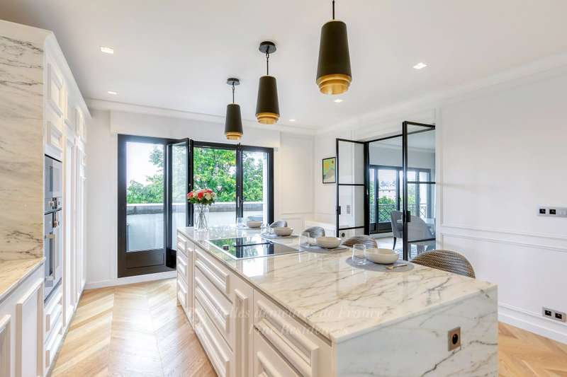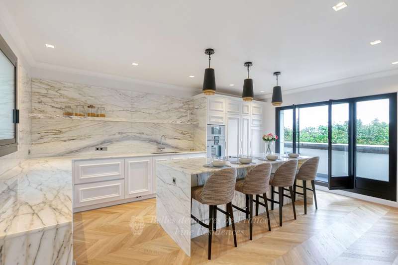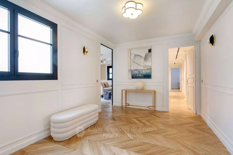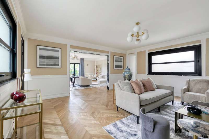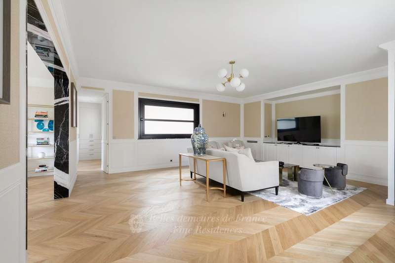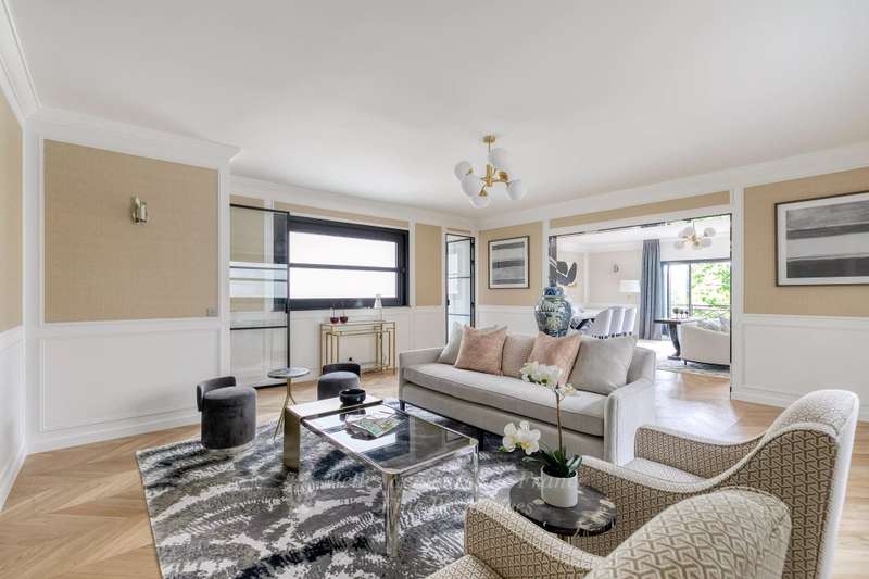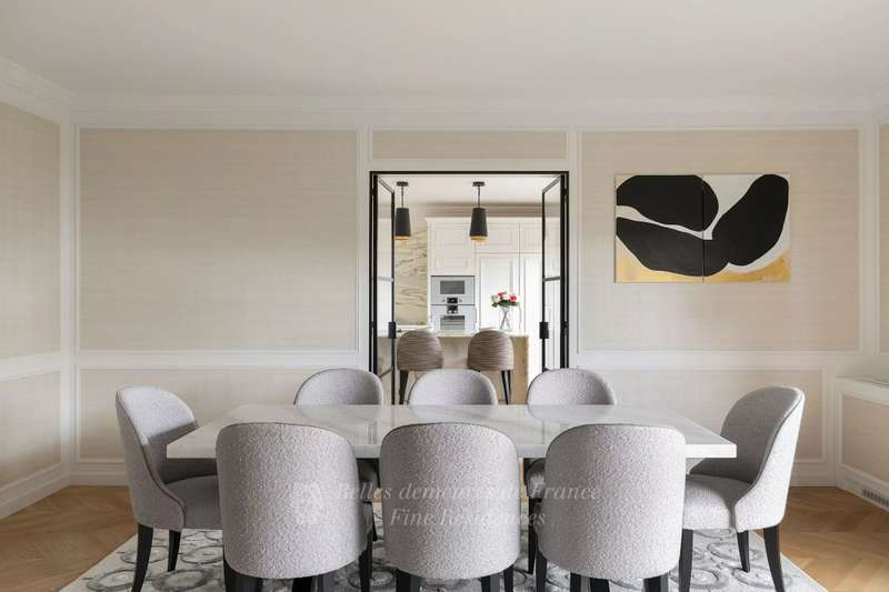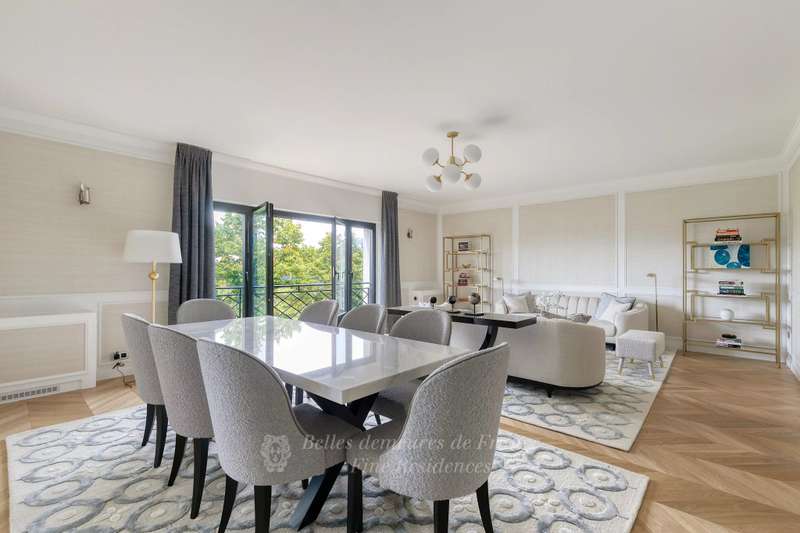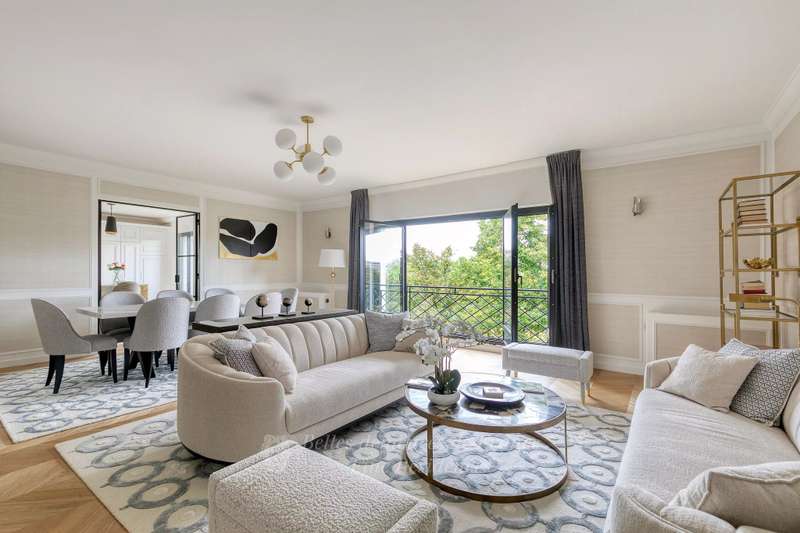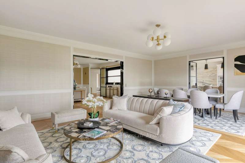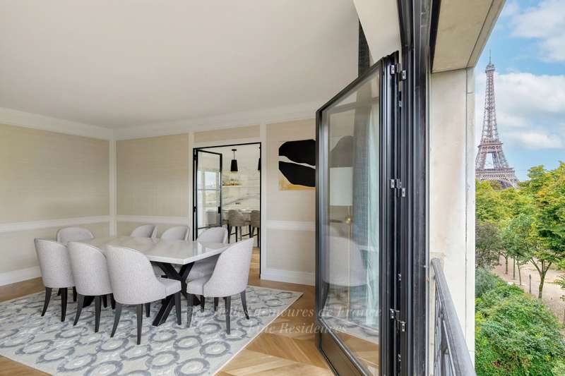 This entirely renovated 260 sqm dual-aspect apartment bathed in sunshine is on the 3rd floor of a magnificent Art Deco building with superb common areas located on the edge of the Champ de Mars. Commanding exceptional views of the Eiffel Tower, it includes a double living/reception room opening onto two balconies, a dining room, a drawing room or study, a kitchen, a utility room, a master suite with a bathroom and dressing room, three further bedrooms and a bathroom. Four cellars and a parking space in the building. An exceptional family apartment near the shops and the schools. Possibility to buy, on top of that price, a 26 sqm studio apartment in that same building.