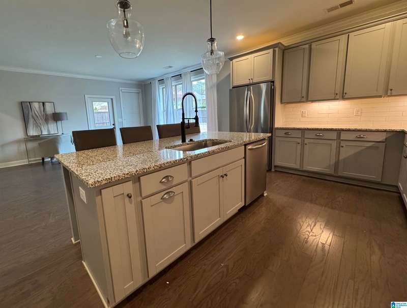 This impeccable full brick home with stone accents is perfect for entertaining! The open concept living includes great room, dining room and kitchen w/solid surfaces & features an OVERSIZED island, walk-in pantry, and plenty of room for gatherings! In addition, there are three bedrooms, two full baths, including a generous primary suite with an oversized, NO STEP walk-in shower, vanity with double sinks, a spacious closet with extensive custom built-ins. A versatile flex room provides the ideal spot for an office, study or nursery. Additional features include a mudroom laundry room, two car garage and a walk up attic, offering ample storage and extra excellent potential for a second floor edition. Outside, enjoy both a cover patio and an open patio overlooking the large flat fenced backyard perfect for outdoor living and entertaining!