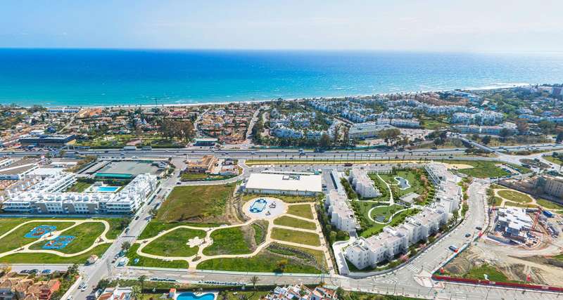 The apartments in Estepona for sale are located close to amenities, 1 km from the beach, 10 minutes from Marbella, Puerto Banus, and Estepona city center, 30 minutes from Gibraltar Airport, and 1 hour from Malaga Airport.