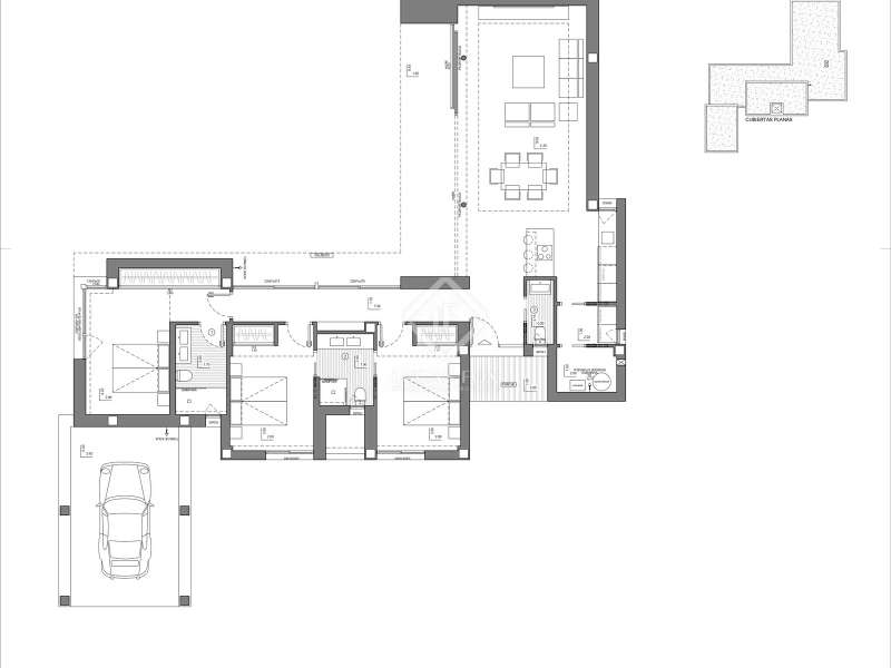 A house with a clear concept, to create a fusion between indoors and outdoors, by offering open, bright and functional rooms. The living room invades the terrace and invites you to enjoy the wonderful Mediterranean climate, which gives us almost 300 days of sunshine a year. Conceived in open L-shaped modules, the villa embraces the main garden, where an impressive infinity pool merges with the sea. A space open to the outside, which invites you to enjoy the sun and the Mediterranean climate, but oriented in such a way as to achieve maximum privacy. The villa is divided into two levels. Upstairs is the sleeping area, where two bedrooms share a common bathroom, while the master suite becomes a private sanctuary with its own bathroom and dressing room. From the rooms, you can enjoy breathtaking views of the sea and the mountains, creating a feeling of serenity and tranquillity that invites you to relax. On the ground floor is the day module, which opens to the outside, creating a sense of continuity and connection with the surroundings. The day module consists of an entrance hall, a guest toilet, and the tandem formed by a large living-dining room and kitchen that are perfectly integrated. Both modules converge in the outdoor area, with the terrace and swimming pool as a point of connection. Villa Nara's contemporary style blends with Mediterranean tradition, creating a harmonious and balanced space that invites relaxation and enjoyment of the senses. The main garden, with its Mediterranean vegetation and aromatic plants, connects you with nature. Villa Nara is a unique and special villa, designed to enjoy life to the fullest and to create unforgettable memories in a dreamlike environment. Please contact us for further information.