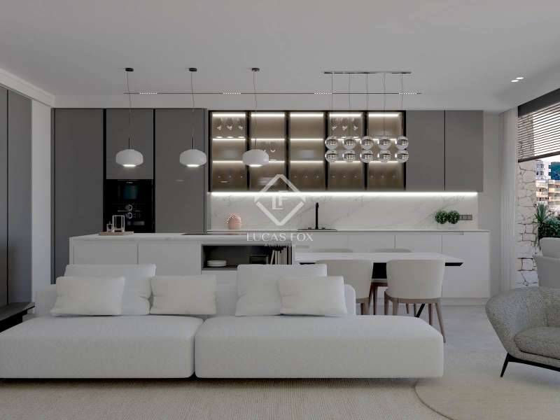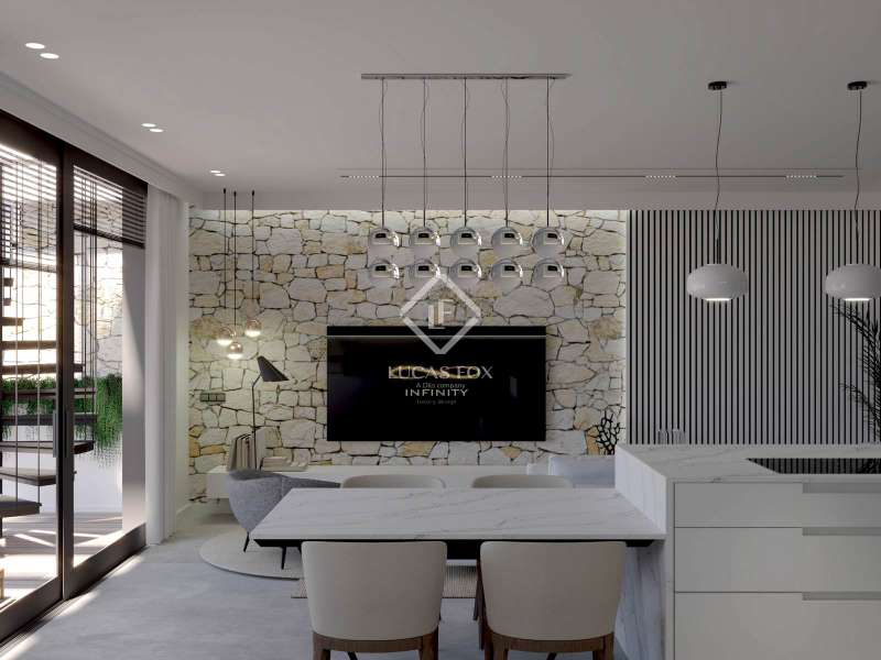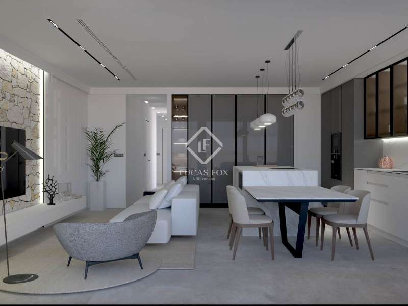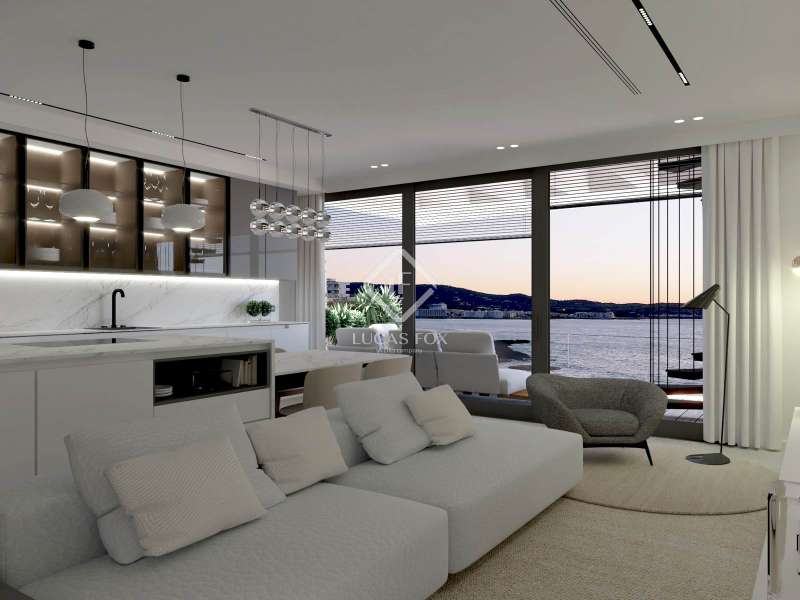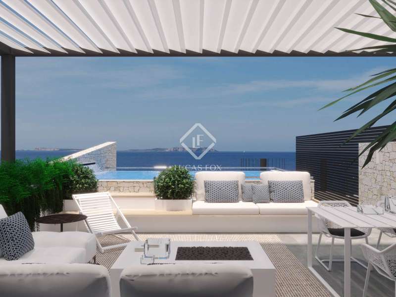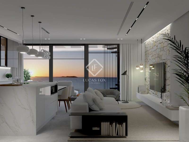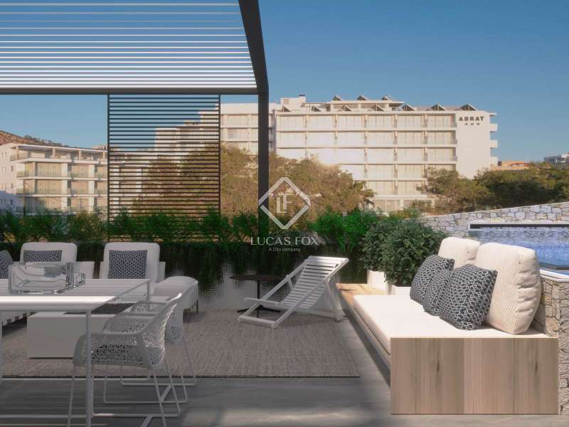 Ses Roques Baixes is an exclusive new development in a typical, Ibiza-style building on the west coast of the island, just 15 minutes from Ibiza City and 25 minutes from the airport. The development enjoys an ideal position, with the seafront promenade and turquoise waters right in front of the building. Located just a few steps from the beach, next to Cala Gració and Caló des Moro, with a large swimming pool in a communal garden, this is an idyllic place to enjoy the island of Ibiza and its pleasant year-round climate. This penthouse apartment is spacious, bright and open to the outside, allowing you to enjoy sea views with total privacy. It has an interior surface area of 76 m² and private outdoor space covering a further 65 m². Inside, we find a living room, dining room and kitchen with access to the terrace and 2 bedrooms with 2 bathrooms on the other side of the home. As far as interior design is concerned, we find large tiled floors with a white stone finish that unites the interior and the terrace, natural wood, refined lines and large windows that make every space in the home feel natural and bright. The finishes and furnishings have been selected for their simplicity, elegance, and warmth and the buyer has the opportunity to personalise their new home if they so wish. Low consumption lighting, home automation and an aerothermal energy system are just some of the modern features of these new homes. Optional equipment for outdoor areas is also available, such as: jacuzzi/pool on the terrace or rooftop solarium, outdoor kitchen on the rooftop solarium and/or a private pool. Furthermore, parking spaces and storage rooms are available from 27.000€. Please contact us for further information.