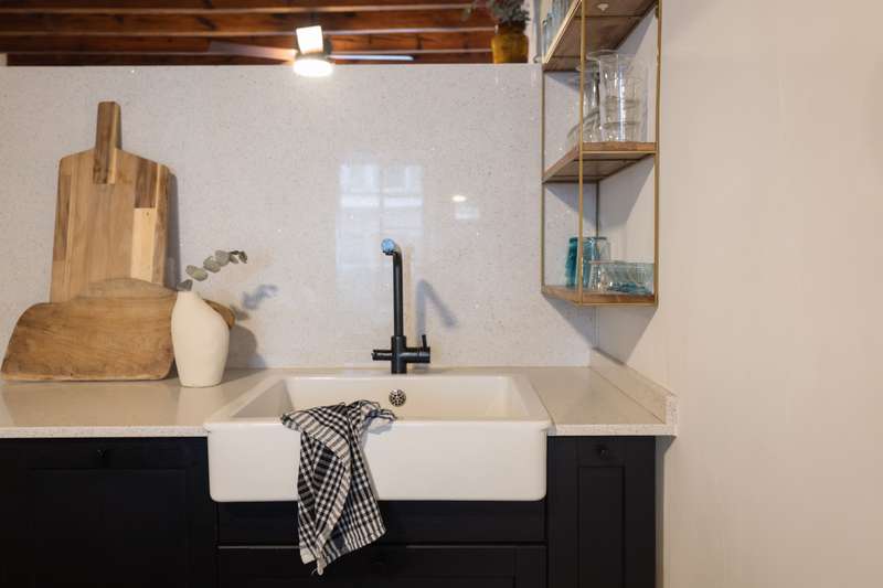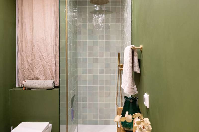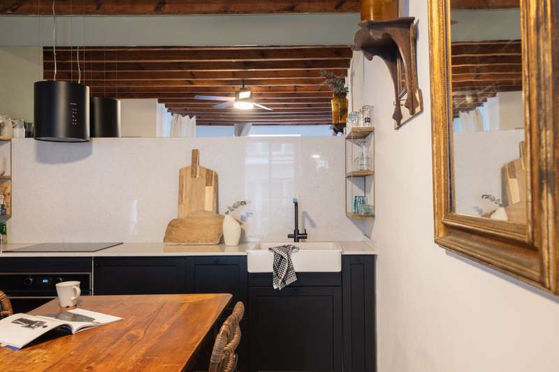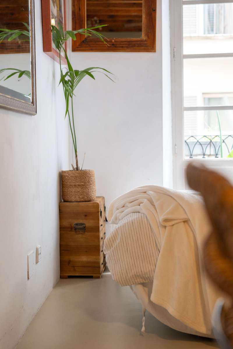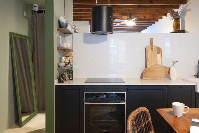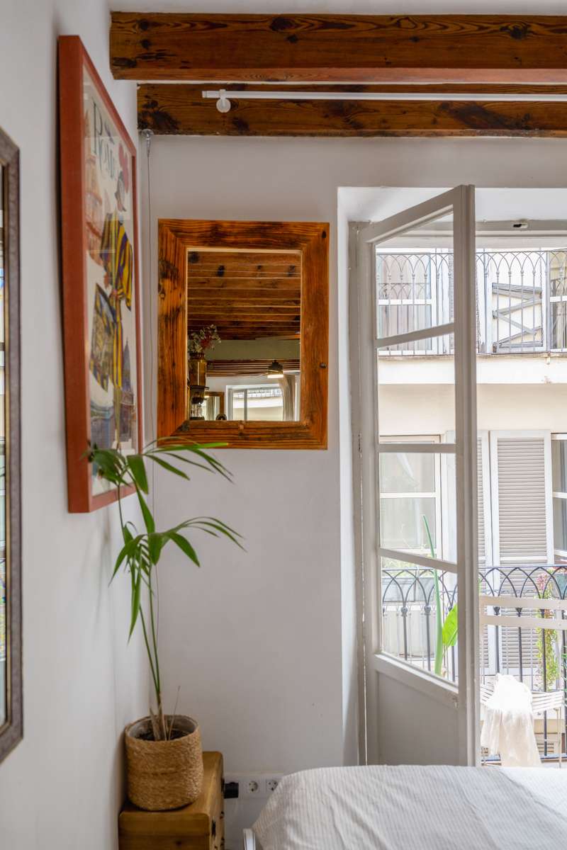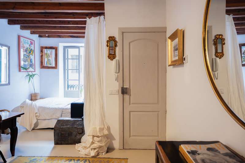 This vibrant, renovated artistic studio is situated in the very heart of Palma's Old Town, just steps away from the lively Plaza Mayor. With a total surface of 33 m², it combines living, kitchen, dining, and sleeping zones in one thoughtfully designed space featuring original exposed ceiling beams and a charming stone staircase. The studio features a small balcony that fills the home with Mediterranean light, perfect for morning coffee or an evening glass of wine. Clever details like a fitted kitchen, a niche wardrobe, and a cozy bed area create a practical yet inviting atmosphere. The bathroom’s sea-green tiles add a fresh, maritime touch, completing the sense of Mediterranean lifestyle. It is an ideal retreat for those who love city living in a historic setting, offering urban comfort and timeless character in a traditional Spanish townhouse.