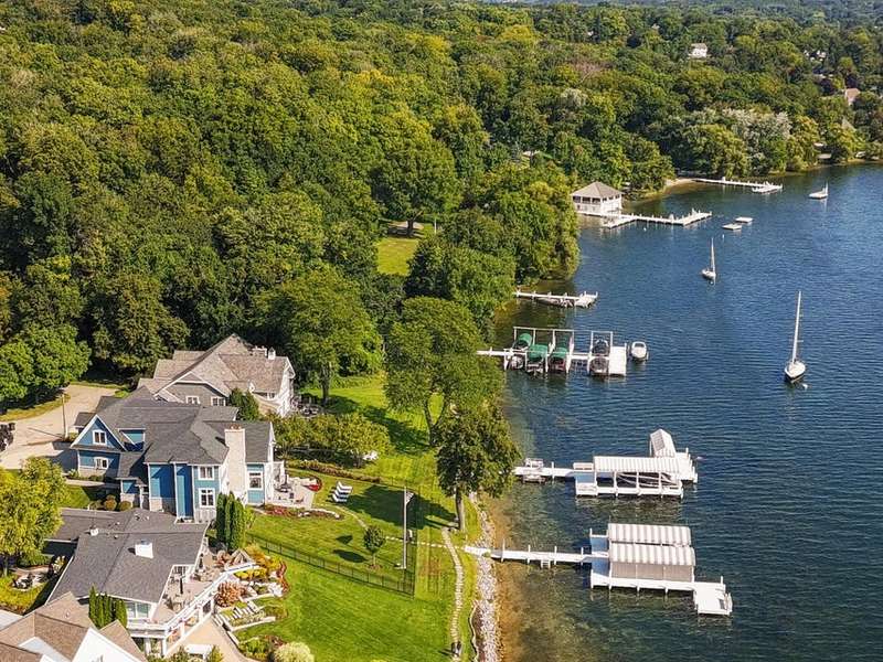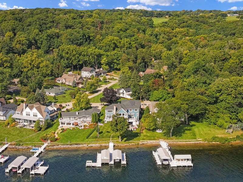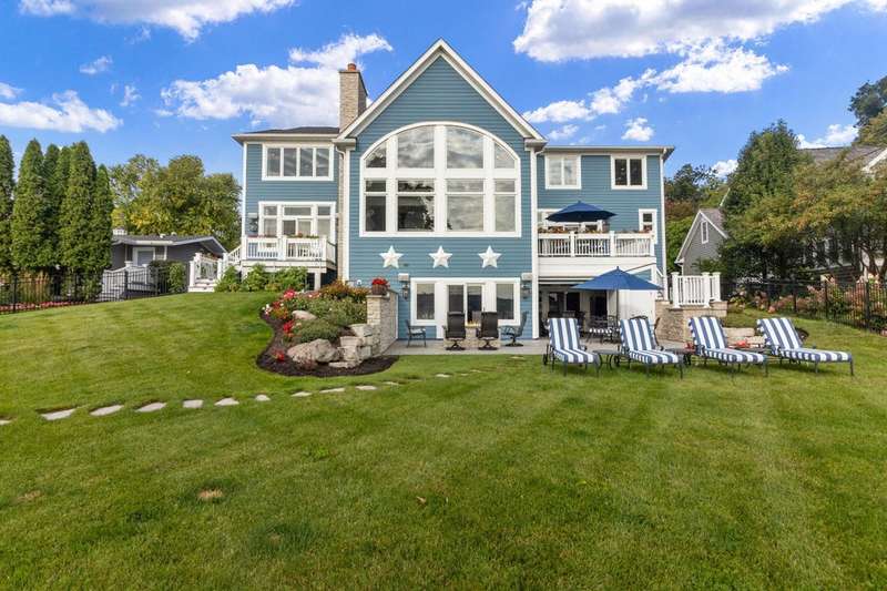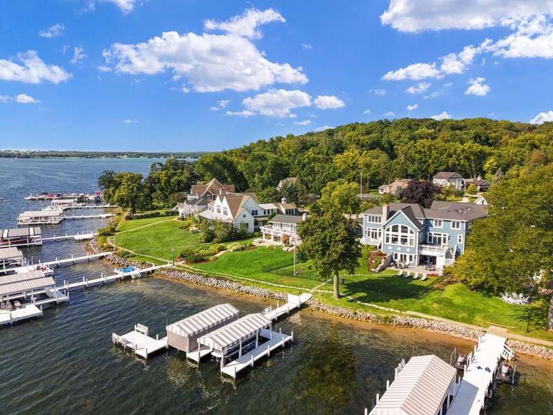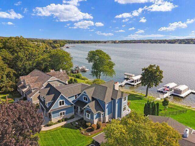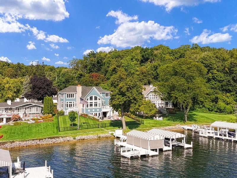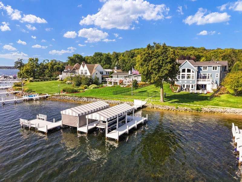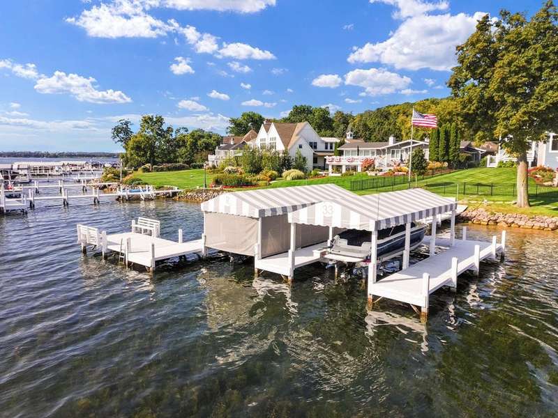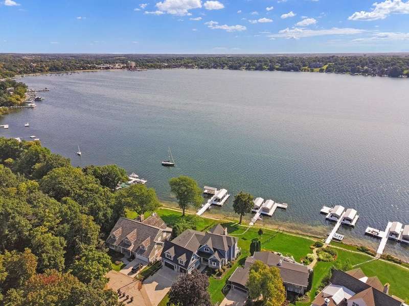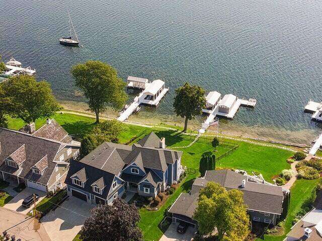 Stunning panoramic views come with this level lake frontage luxury home built in 2018. Sweeping lake views on all 3 levels from almost every room. Close to 7000 sq. ft of living space. Beautiful kitchen with 6ft Subzero frig and Viking 60'' double oven and hidden walk-in pantry. Main floor laundry and main floor in-suite master with steam shower and huge closet with island, 2 other in-suite bedrooms and one jack & jill. Exquisite landscaping with fenced yard and irrigation system. Lower-level family room with entertaining bar and walkouts to lower-level patio with screened porch. Lots of storage area too. 2 canopied piers. 102 ft. of frontage, 3- car garage and huge paved driveway. Turnkey, just bring your clothes. Jump on the lake path and you are one mile to downtown Lake Geneva!