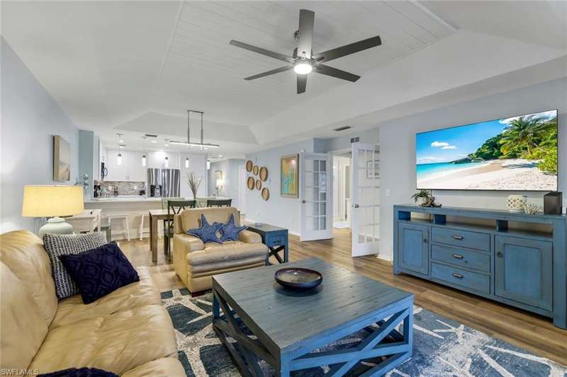 STAY AND PLAY, right here in Chateau Vanderbilt, where WIDE-OPEN WATERFRONT VIEWS swaddle this coastal abode on VANDERBILT BAY. The 2 bedroom, 2 bath residence offers an open layout with thoughtfully curated furnishings and finishes in a light coastal palette, perfectly setting the tone for your beach vacation! The kitchen has new white cabinetry, backsplash, and granite countertops and overlooks the combined dining and living areas with straight-through views to the expansive bayfront lanai. Chateau Vanderbilt has a phenomenal location just around the corner from Vanderbilt Beach and near a plethora of fine, casual, and outdoor dining options, as well as upscale shopping at Mercato, Pavilion, Waterside Shops, and more. The community has under-building parking, a saltwater swimming pool on the bay, and tennis courts are available just up the street. Naples offers unlimited opportunities for enjoying the tropical lifestyle Southwest Florida is famous for, including fishing, sunset cruis