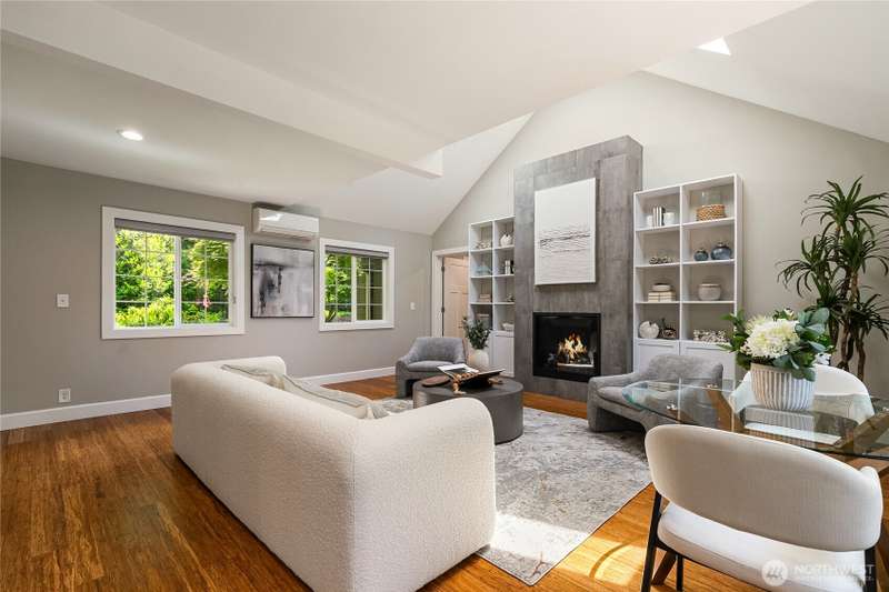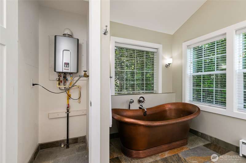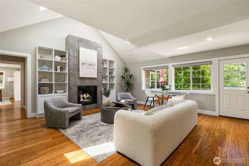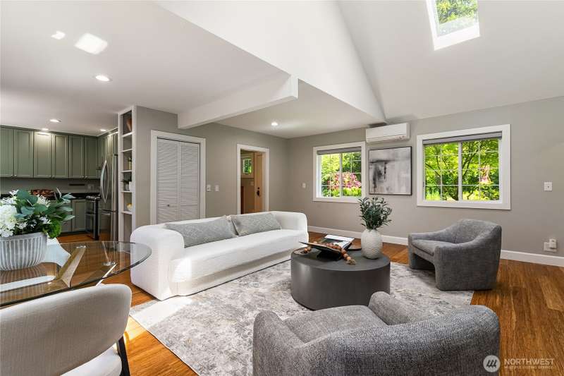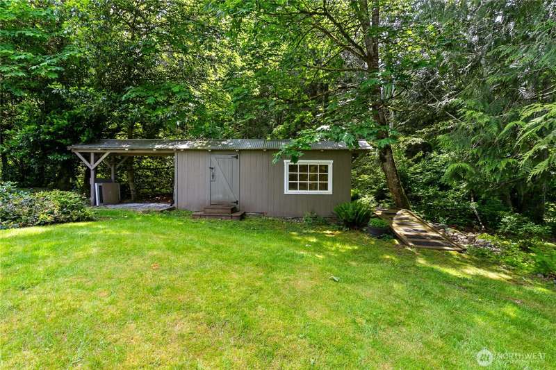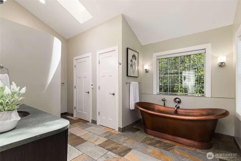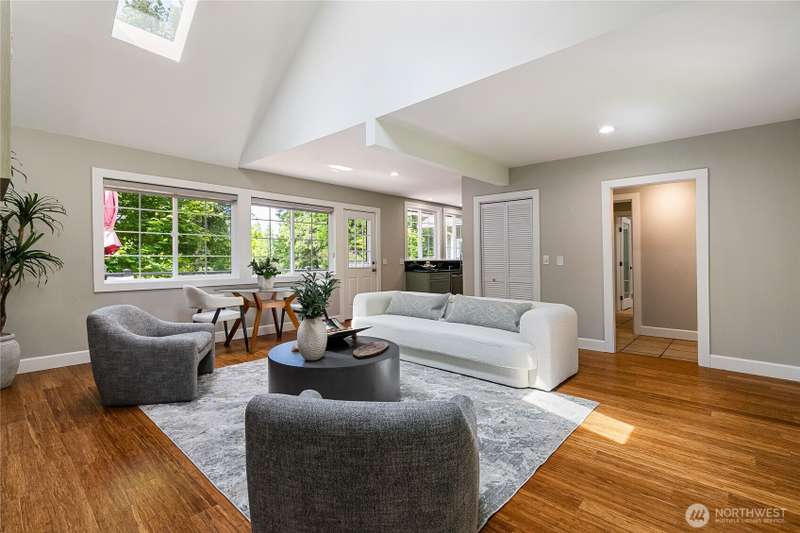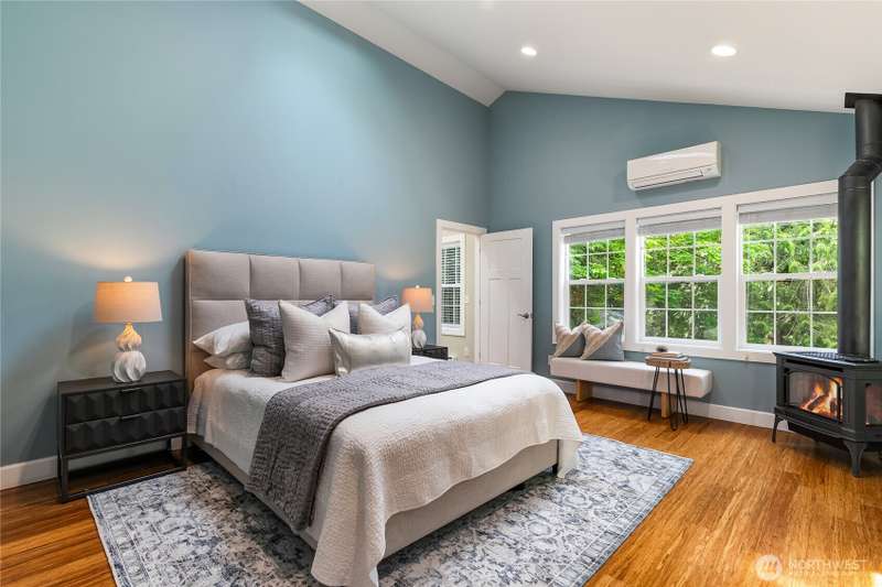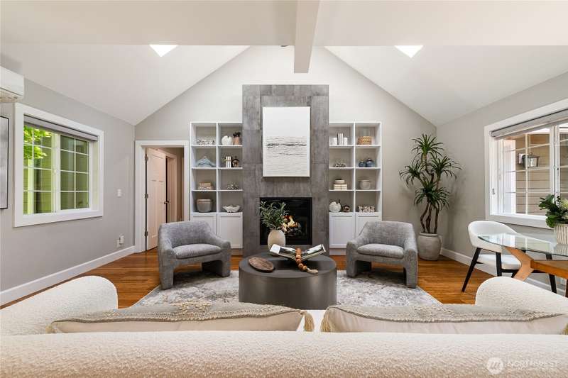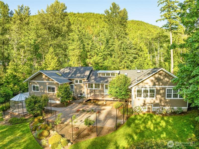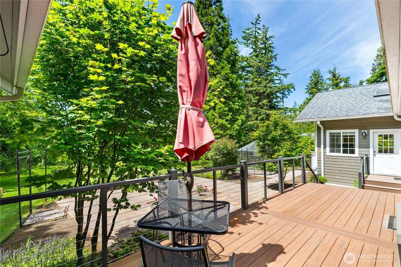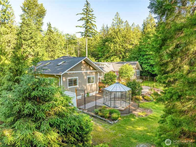 CHUCKANUT! Where cottage charm meets luxury living on a full acre with seasonal saltwater views. Beautifully crafted 3BR/3BA rambler offers a sunny, private setting w/lush landscaping. Major remodels in 2011 & 2018. Great natural lighting with 12 skylights. Features, hardwood flrs, new gas FP in living room & SPA-inspired primary on-suite with copper tub & sink plus a dedicated tankless water heater. Composite deck, NEW patio & greenhouse, pet fence & sprinkler system for rear garden. Oversized 2-car garage with 375 SF bonus room—ideal for ADU conversion with private entrance. Finished upper level (not in SF) makes a great office, guest room. Eligible for Chuckanut Beach Association—5 private beaches! Steps to Interurban Trail.
