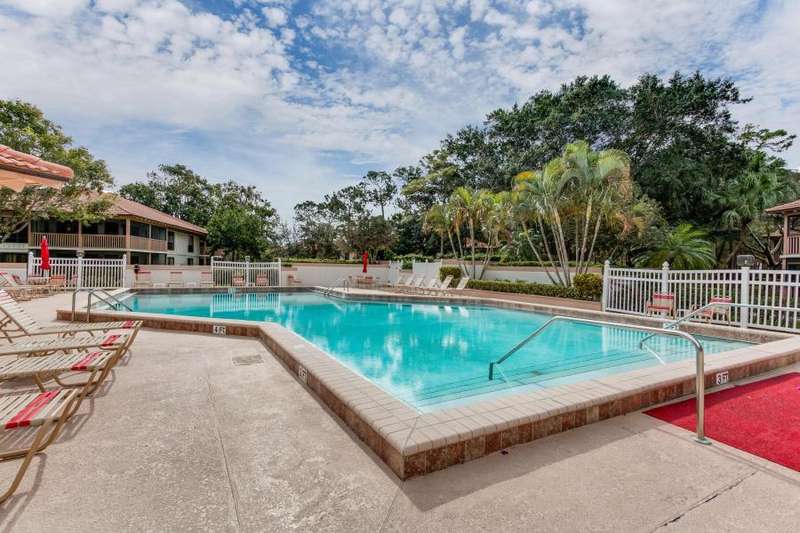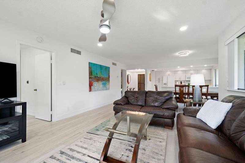 Enjoy the peaceful living in this bright, furnished, and tastefully renovated 2-bedroom, 2-bath condo on a private 2nd-floor walk-up. The open-concept kitchen boasts white quartz countertops and new recessed lighting that fills the space with a warm glow. Large windows throughout bathe every room in natural light, enhancing the clean, contemporary feel with modern design elements and no carpeting. The primary bedroom features a comfortable king-sized bed, while the guest room offers twin beds for a relaxing stay. Unwind on the spacious, wrap-around covered and screened balcony to take in panoramic views of the lush golf course and tranquil water. Savor community living with access to two inviting pools and a prime location just minutes from a variety of shopping and dining options.