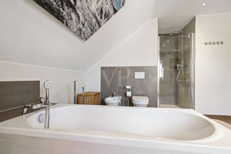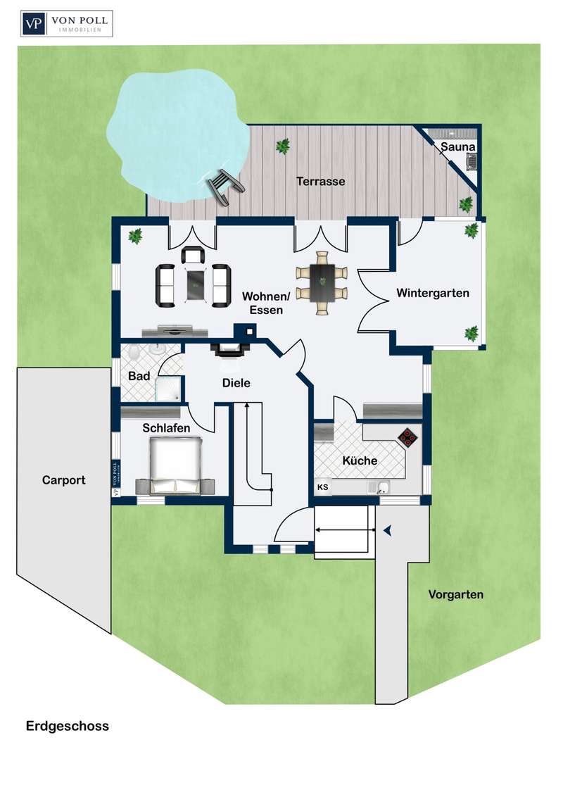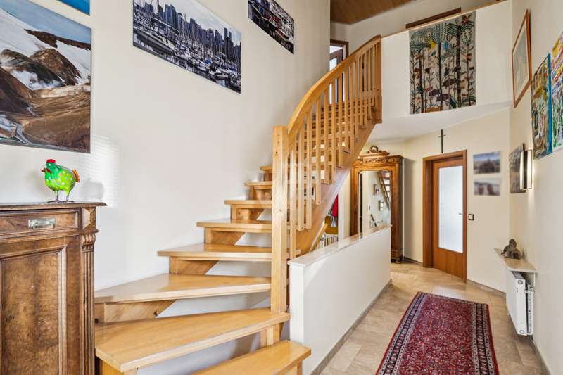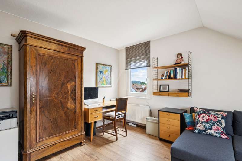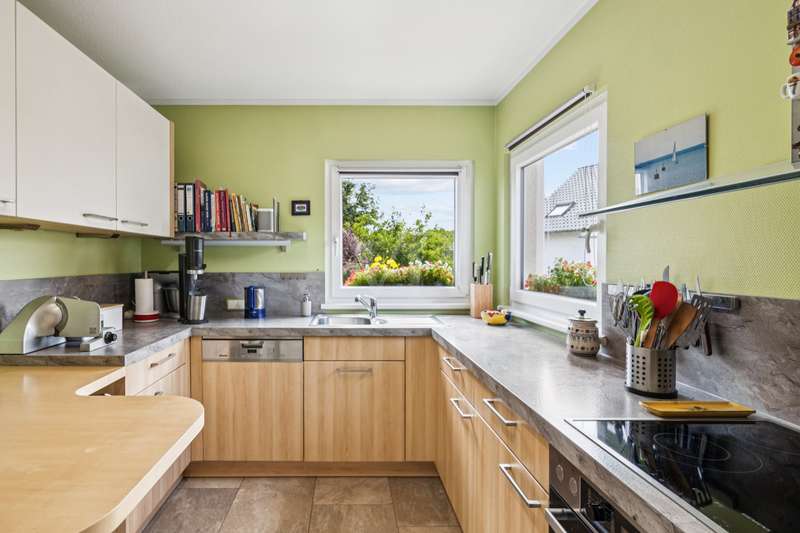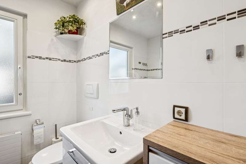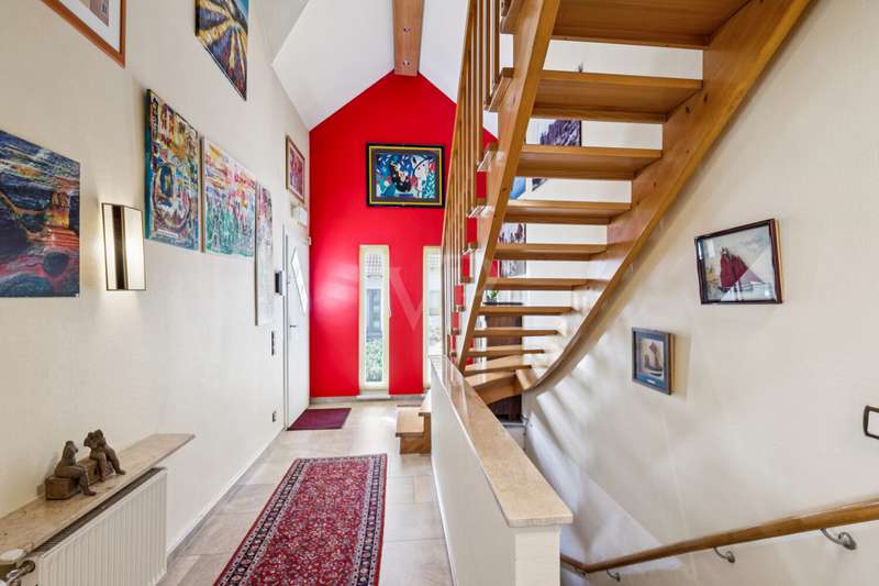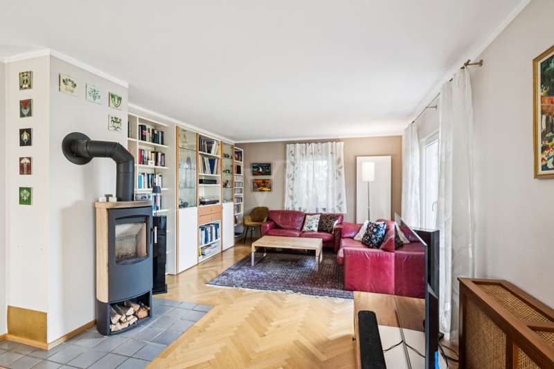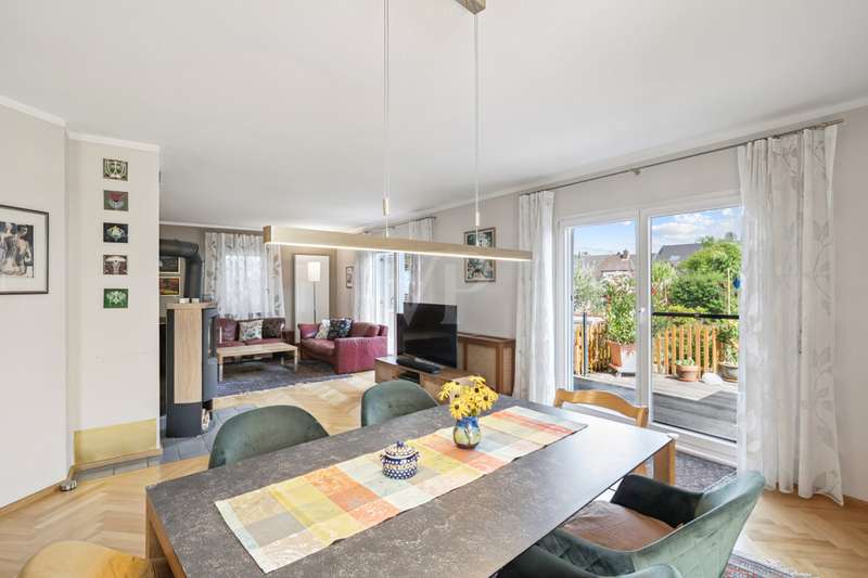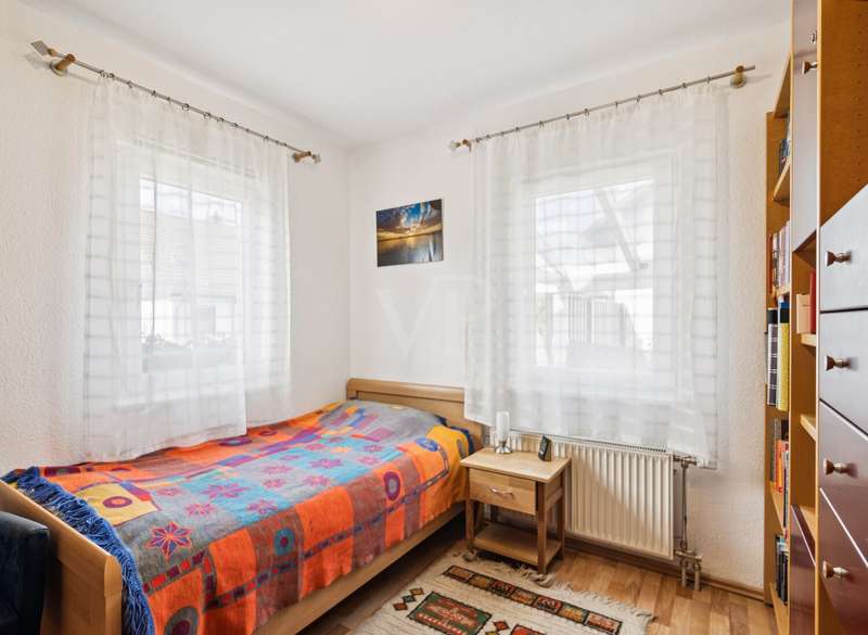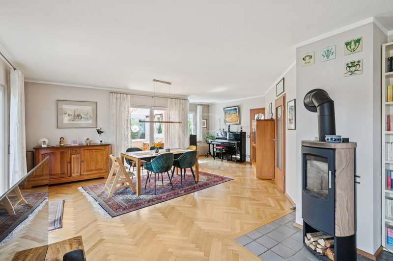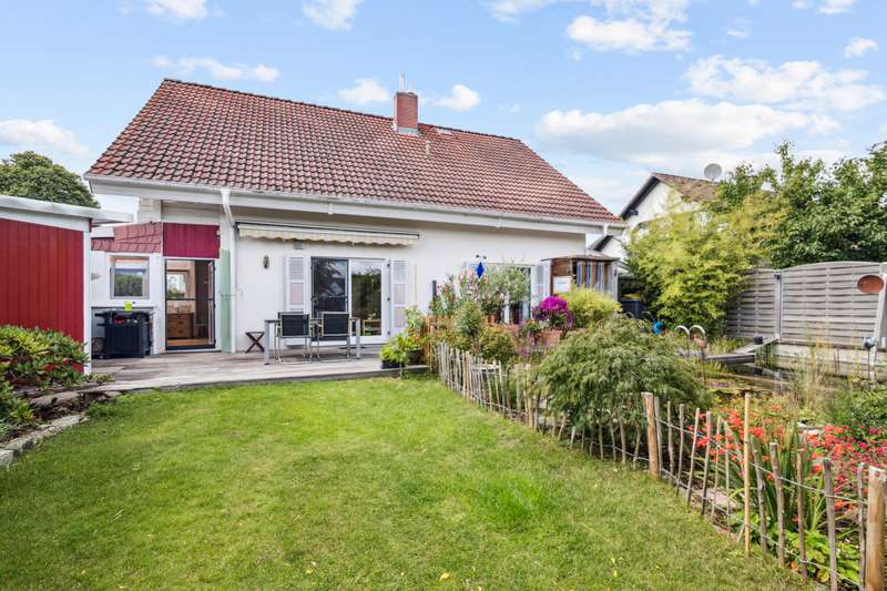 Family idyll in a quiet residential area - welcome to your new home Situated in a quiet residential area, this detached house with approx. 186 m² of living space and a plot of approx. 512 m² is the ideal home for families. A well thought-out room layout, plenty of space and a pleasant neighborhood create the perfect basis for a relaxed and harmonious family life. The detached house has a spacious entrance hall, which is open to the roof like a gallery and creates an airy feeling of space. From here, you have direct access to the spacious living area, which has a wood-burning stove to create a cozy atmosphere. The adjoining conservatory, which offers a wonderful transition to the well-tended garden area, creates another light-flooded room. The lovingly landscaped garden invites you to relax and linger. The focal point is a naturally designed swimming pond, which creates a peaceful and harmonious atmosphere. Surrounded by selected plants, the garden offers a variety of retreats for young and old - complemented by a separate garden sauna, which creates additional recreational value. The adjoining kitchen is equipped with a fitted kitchen in timeless fronts and is ideally combined with the living and dining area - short distances and an open living concept create a pleasant living ambience here. Also on the first floor is a further room, which is ideal for use as a study or guest room, as well as a first bathroom with shower. A wooden staircase leads to the gallery level on the top floor. On this level is the sleeping area with three comfortable bedrooms under cozy sloping ceilings. The floor is completed by a further bathroom with bathtub and shower, which offers additional comfort and plenty of space for the whole family. The full basement offers generous usable space with a variety of uses - be it as storage space, for hobbies, a fitness or utility area. There is also a WC with separate shower, a boiler room and two storage rooms. A carport completes the offer and provides additional practical convenience. We would like to invite you to take a closer look at this detached house during a personal viewing appointment. We look forward to hearing from you.