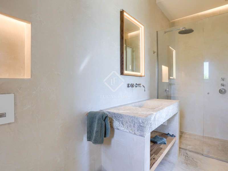 This exclusive project captures the true essence of traditional Mallorcan country estates, with its distinctive reddish soil, privileged natural surroundings, and breathtaking panoramic views of the Mediterranean Sea. Located just moments from the iconic fishing port of Portocolom, the property offers the perfect blend of peace, tradition, and contemporary comfort in one of the most sought-after areas in southeast Mallorca. The finca offers approximately 400 m² of living space on a plot of around 60,200 m², with a total constructed area of about 750 m². It features five bedrooms and four bathrooms, plus a guest toilet. Built in 2024, the property includes two parking spaces and a garage, and is classified as a country estate. The home is distributed over two floors. On the ground floor, there are four en-suite bedrooms, all finished to a high standard. A spacious dining area connects seamlessly to a modern kitchen, which can remain open or be closed off with elegant wooden sliding doors. This area opens onto a semi-covered terrace, ideal for year-round al fresco dining. The bright and airy living room, with large windows, offers direct access to the stunning swimming pool. Also on this floor is a functional laundry room with outdoor access and a guest toilet. The upper floor is dedicated exclusively to the luxurious master suite, which includes a generous walk-in wardrobe, a designer bathroom, and a private terrace with spectacular views of the sea and the iconic Portocolom lighthouse. The property is equipped with solar panels and includes a technical basement housing all the essential machinery, ensuring both comfort and energy efficiency.
