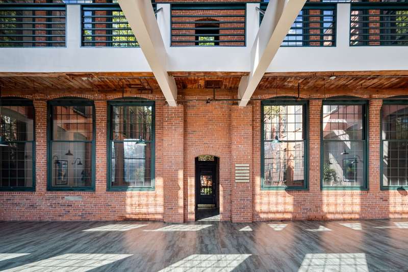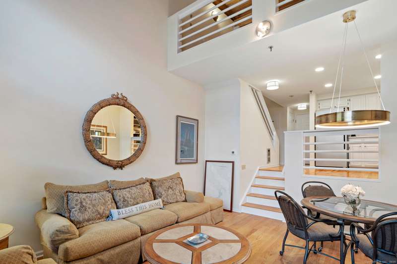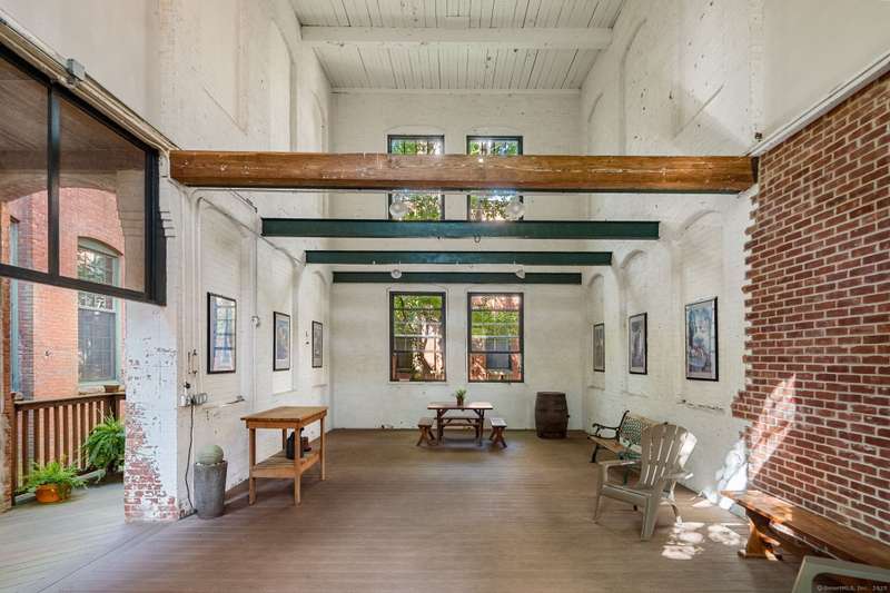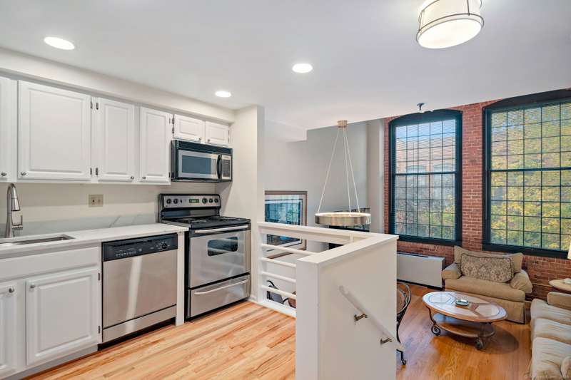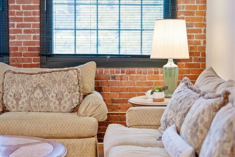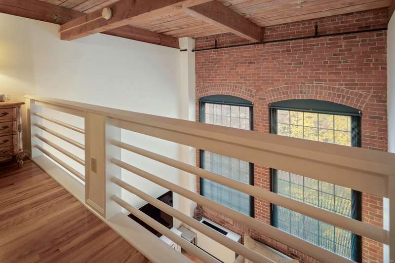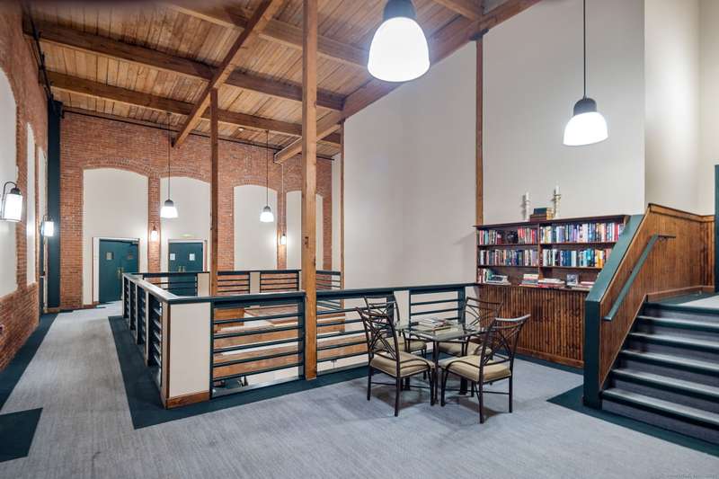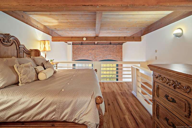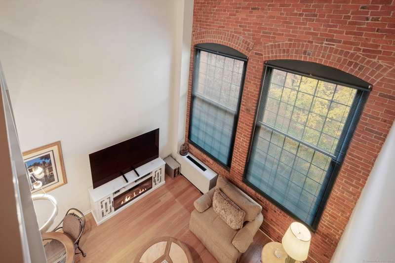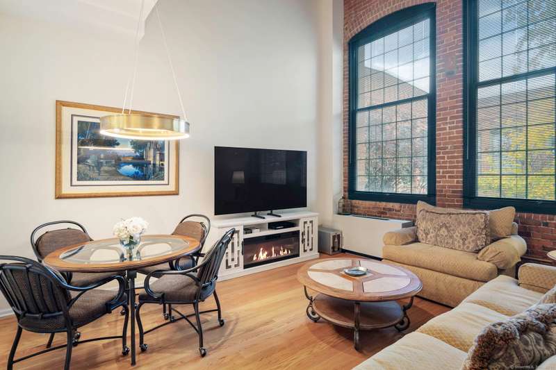 Clocktower Close: where modern sophistication meets industrial heritage. This stunning Manhattan-style loft offers 1 bedroom, 1.5 baths, and 825 sq ft of open-concept living with soaring 20-ft ceilings, exposed brick, wood beams, hardwood floors, and dramatic two-story windows that fill the home with natural light. Enjoy a spacious newly renovated kitchen with ample counter space, a sunken living room with top floor views overlooking the landscaped courtyard, and an open loft bedroom with walk-in closet and updated ensuite bathroom. Every detail has been curated to balance modern comfort with the building's 1903 historic charm and personality (once a hat factory). Community amenities include off-street and garage parking, fitness center with sauna, laundry, dog walk, outdoor picnic areas, spacious game room w TV, business lounge, kitchen, and storage. Prime Norwalk location close to I-95, Merritt Pkwy, Rt. 7, Metro-North, beaches, shopping, dining, and SoNo nightlife. Come experience t