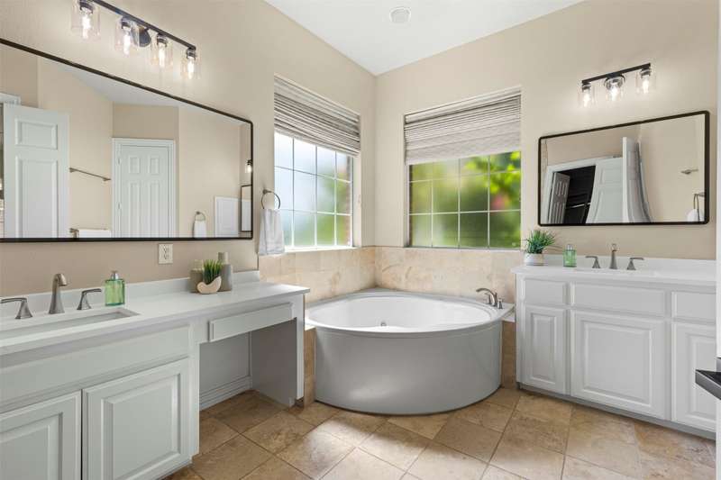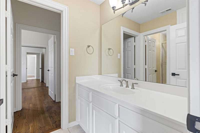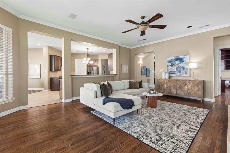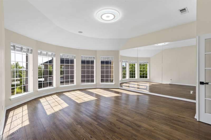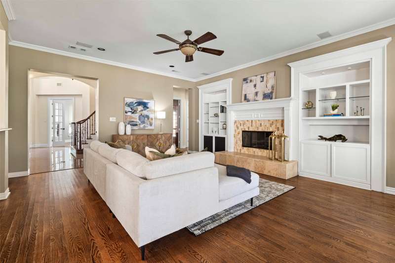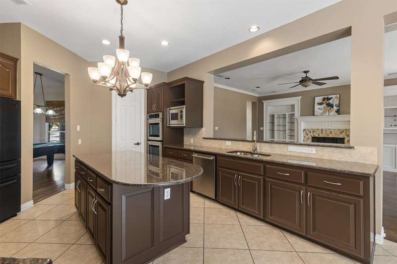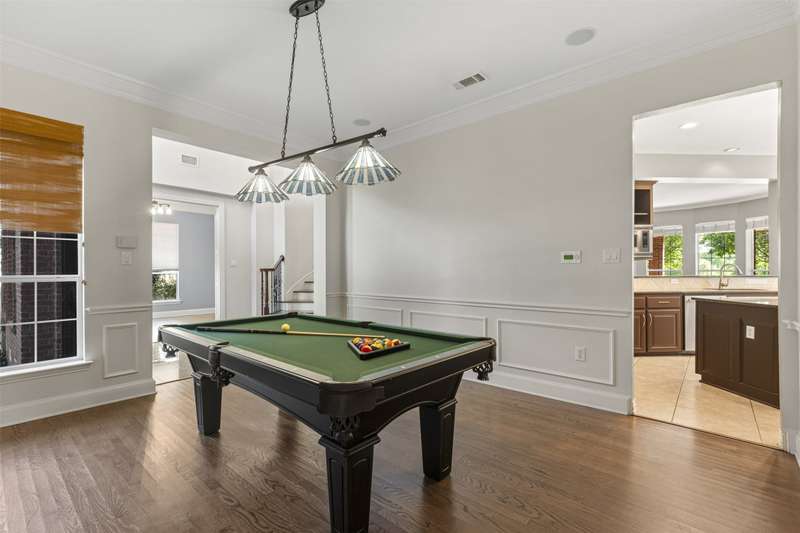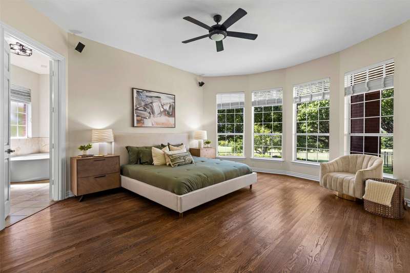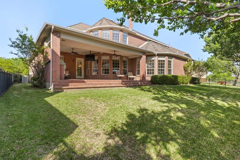 Golf Course Lot with a light bright and open AWESOME 5 bedroom, 4.1 bath house overlooking the golf course in highly sought after Hackberry Creek guard gated community. Home boasts: stunning entry with cathedral ceilings, hardwood flooring, decorative stone gas starter fireplace, built ins in family room, office and a library downstairs, lots of storage, eat at bar, kitchen opens to family room, oversized kitchen with large island, gas stove, double ovens, walk in pantry, 3 car garage, expansive laundry room with cabinets and a sink, the two car garage has lots of storage cabinets, downstairs master with custom designed closet, dual sinks and a separate tub, master bedroom wired for surround sound, 4 bedrooms upstairs along with an enormous game room or workout room with a wall of mirrors and a wall of windows looking out to the golf course, an additional living area and media room with surround sound wiring, windows galore with a great view, fantastic outdoor living area adjacent to the kitchen, great for entertaining friends and family.Everyone must show a driver's license at the guard gate to gain entry