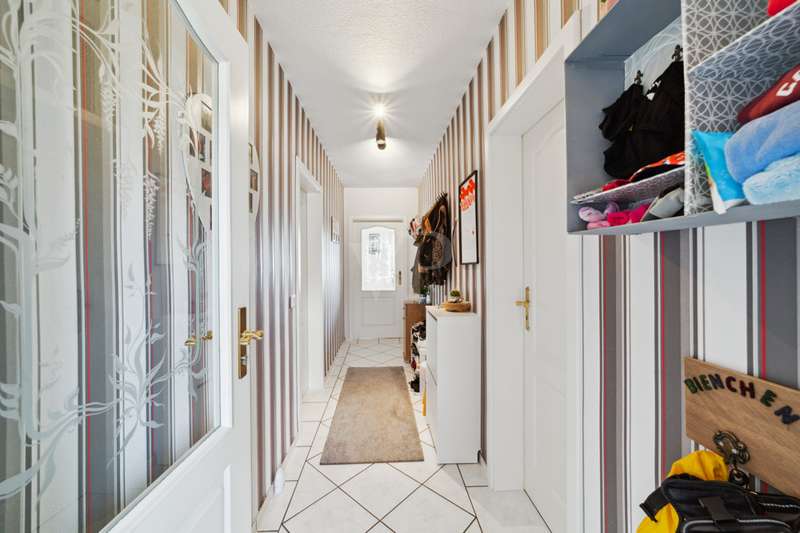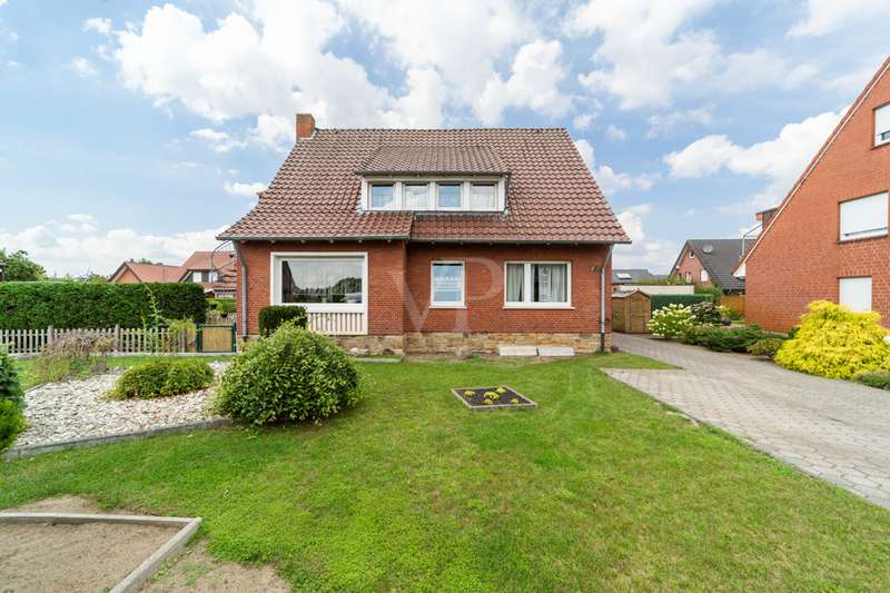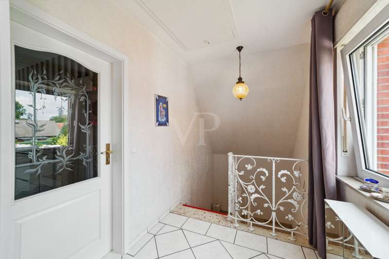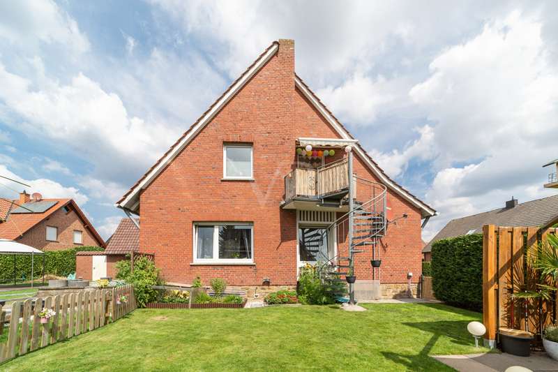 We are delighted to present this charming two-family house with exceptional development potential in Rheine-Mesum. This well-kept two-family house, built in 1956, is situated on a spacious plot of approx. 799.00 m². The property is ideally suited for various usage concepts - whether for owner-occupation, for multi-generational living or as a solid capital investment. A particular highlight: The property already has planning permission for the construction of a new apartment building with 8 residential units and a total of 506.23 m² of living space as part of publicly subsidized housing. This building permit represents considerable added value and offers investors and project developers an excellent opportunity to create additional living space on an attractive plot of land - with building rights already secured! Existing property with potential: The existing two-family house has a living space of approx. 125.90 m², divided into two self-contained residential units. Ongoing renovation and modernization measures have been carried out regularly, so that the property is in a very well-kept condition. The first floor apartment comprises three rooms, including a spacious living and dining area, a bedroom, a children's room, kitchen and a modern tiled bathroom with shower. Large windows provide a pleasant feeling of space and plenty of natural light. The beautifully landscaped garden with patio, garden shed, pond and garage is accessible from the staircase or the kitchen. The top floor apartment offers two (+1) rooms, including a living and dining area across the entire width of the house, a bedroom, an office/children's room and a modern bathroom with shower. A private garden area is accessible via a spiral staircase from the balcony. The house has a partial basement with three storage rooms and a utility room. A well-kept front garden and a spacious garden in the rear courtyard with terrace complete the offer. Conclusion: This property combines solid existing values with future-oriented development potential. Whether as an owner-occupier with long-term project prospects or as an investor with an immediately realizable new-build project: Here you will find a rare opportunity to optimally combine living and capital investment - including approved planning for publicly subsidized living space with over 500 m² of additional living space. Don't hesitate - please contact us for further information on planning permission or to arrange a viewing.