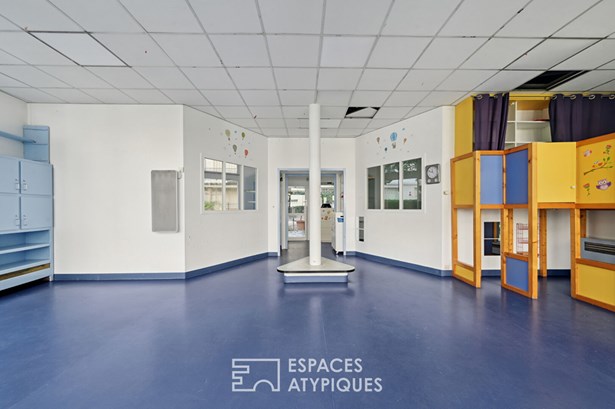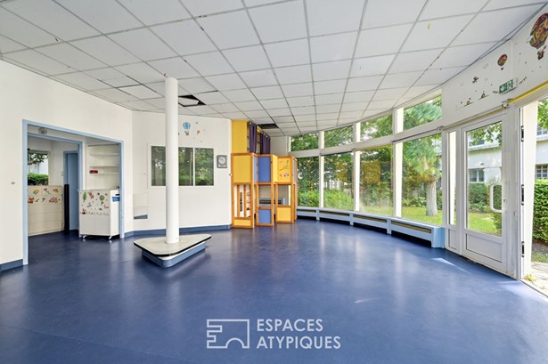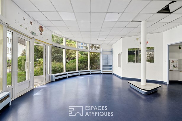 Away from the street, in the garden of a condominium with caretaker, this adorable daycare center until recently welcomed the laughter and games of the neighborhood children. On one level and entirely glazed, its interior space bathed in light opens onto a garden and its pleasant terrace sheltered by trees.