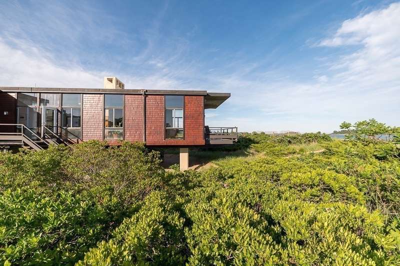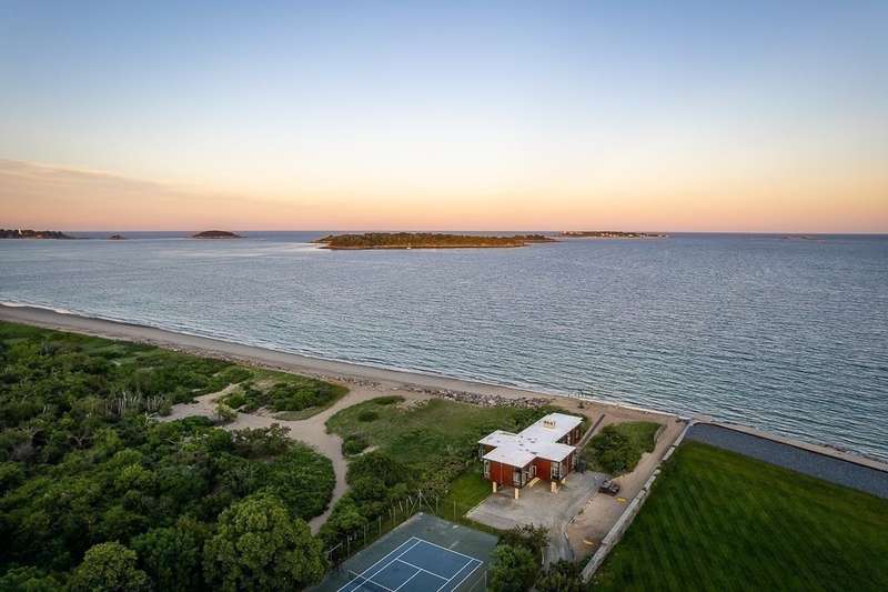 Northern California coast meets Boston's Gold Coast in this iconic, 4-bedroom, 3-bath direct waterfront Mid-century Modern house in Prides Crossing. Designed by famous architect John Lawrence Jr. as a weekend retreat, this home enjoys an unparalleled level of privacy and panoramic, 180-degree vistas of Manchester-by-the-Sea, Marblehead, Salem Sound to Misery and beyond. Sited on 2+ acres abutting RockMarge Estate to the west and 18 acres of conservation land to the east, the elevated living space is framed by seagrass covered dunes at the very end of a secluded, winding road lined with lush vegetation. Ideal for entertaining or intimate gatherings, this property is a slice of heaven. Looking to create something completely new? This offering includes city approvals and plans in hand to build a new 4,600+ sq. ft. primary residence and preserve 1,300 sq. ft. of existing home as a beach cabana.