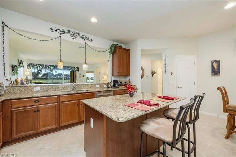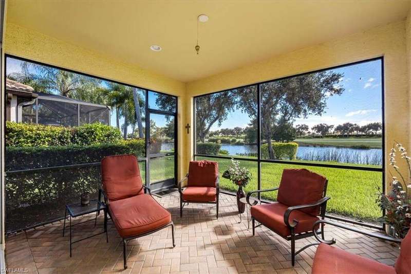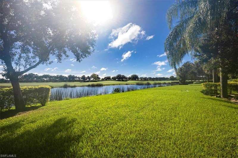 Welcome to this popular "Surrey Crest" 2-bedroom+den, 2-bathroom residence, built in 2011. Step inside and be greeted by a lovely screened in front lanai and a well organized interior floor plan. This home comes with a PAID CDD, UPDATED WATER HEATER 2019, WASHING MACHINE 2019, NEW REFRIDGERATOR 2023 AND NEW DISPOSAL 2024. Premium features include a golf course view facing east; laundry tub; screen door to garage area; upgraded window treatments; and a master closet outside the bathroom area! Enjoy the serene water view, landscaped for privacy from your bedroom window. The garage also features epoxy flooring. This home comes with a 1 year Silver Home Warranty. The Del Webb community offers a wealth of amenities, including a state-of-the-art fitness center, multiple swimming pools, tennis courts, pickleball courts, bocce ball courts, and a beautiful clubhouse. Enjoy walking and biking trails, and participate in various activities and events. Ave Maria offers excellent shopping and dining options, university cultural and sports events, and is just under an hour's drive from Naples' sandy beaches and shopping destinations. Don't miss out on this rare opportunity to own a piece of paradise in this sought-after community.