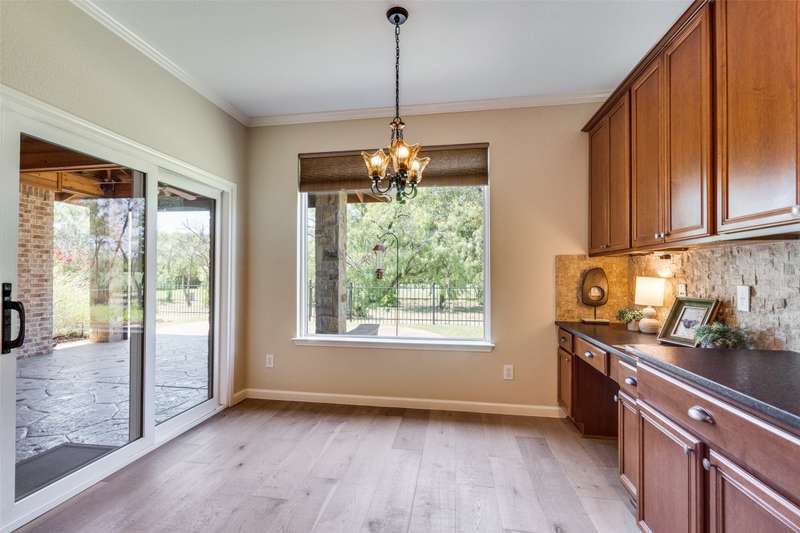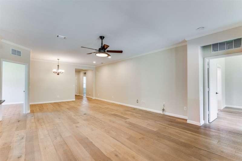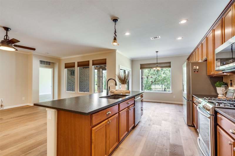 Rare Greenbelt and Golf lot on the 18th Fairway in Frisco Lakes. Fresh and pristine with 3 split Bedrooms, Study with Open Concept to the Living and Dining areas. Wide plank wood floors throughout this entire home. Private Study-library is sound proof with a French door, plus 2 Dining areas! Gourmet Kitchen has extended cabinets, SS gas range, leather finish honed granite counters, tumble marble backsplashes & oversized island. Upgraded modern lightening, window coverings and hardware. The Primary retreat is private, located in the back with amazing greenbelt-fairway views. This spa-like bath has a super-sized shower, dual vanities with granite and a to-die-for walk-in closet customized with jewelry drawer, shelving and pull-outs draws & bins. The front 2 bedrooms are split off a hallway. See the extended covered back porch with motorized shades, TV mount, radiant heater lights, stamped concrete hardscape. Over-sized garage with epoxy floors, custom pull-out shelves in the garage. Roof 8-30-2017. Enjoy majestic views of the 18th fairway of the prestigious Frisco Lakes Golf Course. Three clubhouses with three fitness centers, * Indoor and outdoor pools and spas * Pickleball and tennis courts *Bocce ball courts * Extensive walking trails. This vibrant, 55+ active adult community is located in Frisco, Tx, on the eastern shores of Lake Lewisville. Located in the HEART of EXCITEMENT - just 6 Miles to N Dallas Tollway, Dallas Cowboys Star Stadium & Frisco Station, Stonebriar Mall. Top Medical- Baylor, Scott & White Medical Center, Texas Health Resource, UT Southwestern Medical Centers.