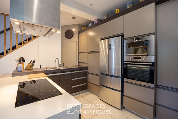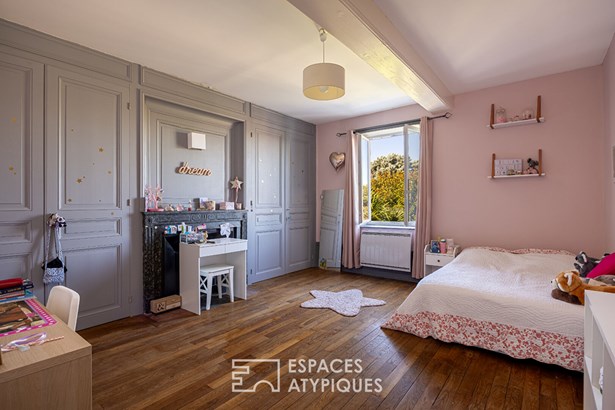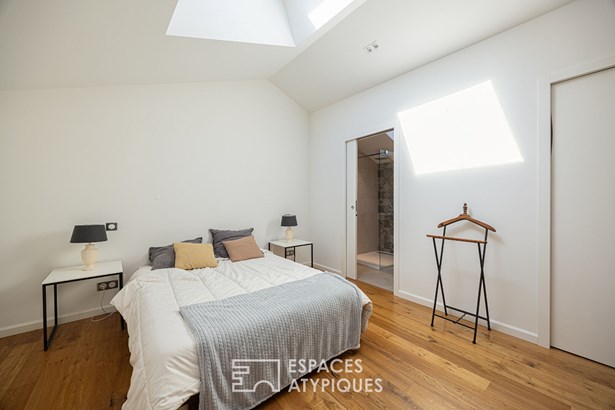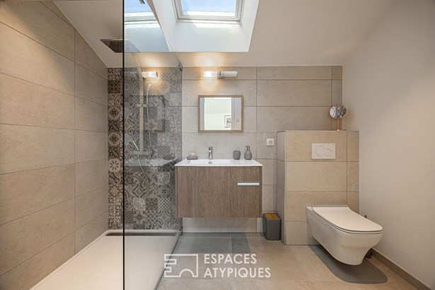 Built on a 500sqm wooded plot, it benefits from a calm and residential environment. The ground floor offers a beautiful, bright living space with a kitchen opening onto a living room and a cozy lounge. A beautiful, fully glazed cellar adds character and originality. In the contemporary wing, a designer staircase leads to a first bedroom with a private shower room and WC, as well as an office that can be used as a guest room. In the old part, the original stone staircase leads to two additional bedrooms and a renovated shower room.