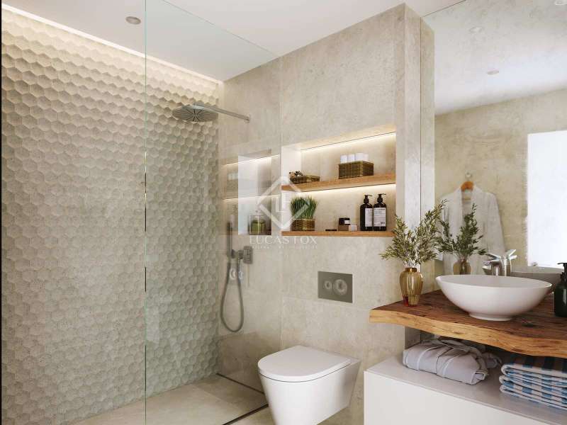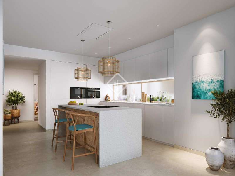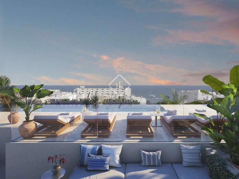 Apto Santa is an exclusive residential project on the beautiful beach of Santa Eulalia. The complex provides leisure and fun for the whole family with excellent common areas including a modern playroom, a fully equipped gym and a stunning rooftop terrace with three dazzling infinity pools, where you can relax and enjoy the Mediterranean sun. In addition, a chill out area awaits you so that you can relax while admiring the impressive views of Santa Eulalia beach. The project offers 57 exquisitely designed homes, with the opportunity to acquire the last available apartments on floors 1 to 3, all with 1–3 bedrooms and private terraces that will offer you spectacular views of the sea and the surroundings. Every room in these new homes has been planned in detail to offer you an exceptional living experience. Each bathroom has been designed with elegance and practicality in mind. Kitchens are the heart of the home, and these custom-built kitchens with quality appliances from Bosch or Balay provide a practical cooking space without compromising on elegance. The built-in wardrobes in the bedrooms and offer a stylish, organised space to store your belongings. Furthermore, the project prides itself on providing homes with the best in sustainable technology. The aerothermal hot and cold air conditioning system with low electricity consumption guarantees a perfect environment throughout the year. In addition, LED and indirect lighting in some rooms creates a cosy and unique atmosphere. For added convenience, each apartment comes with its own private parking space and storage room, ensuring you have all the space you need. Completion date: December 2025. Contact us today to secure your apartment.
